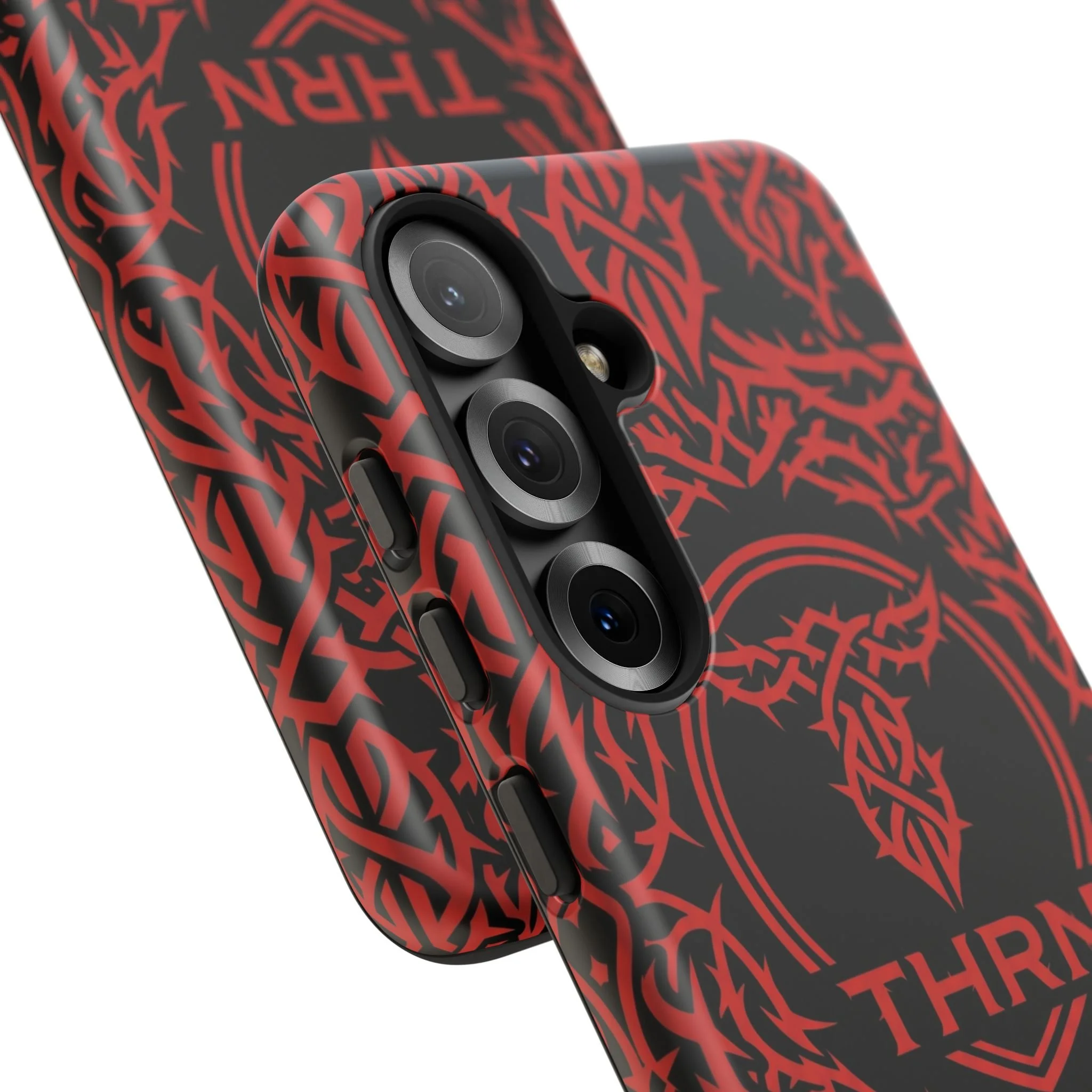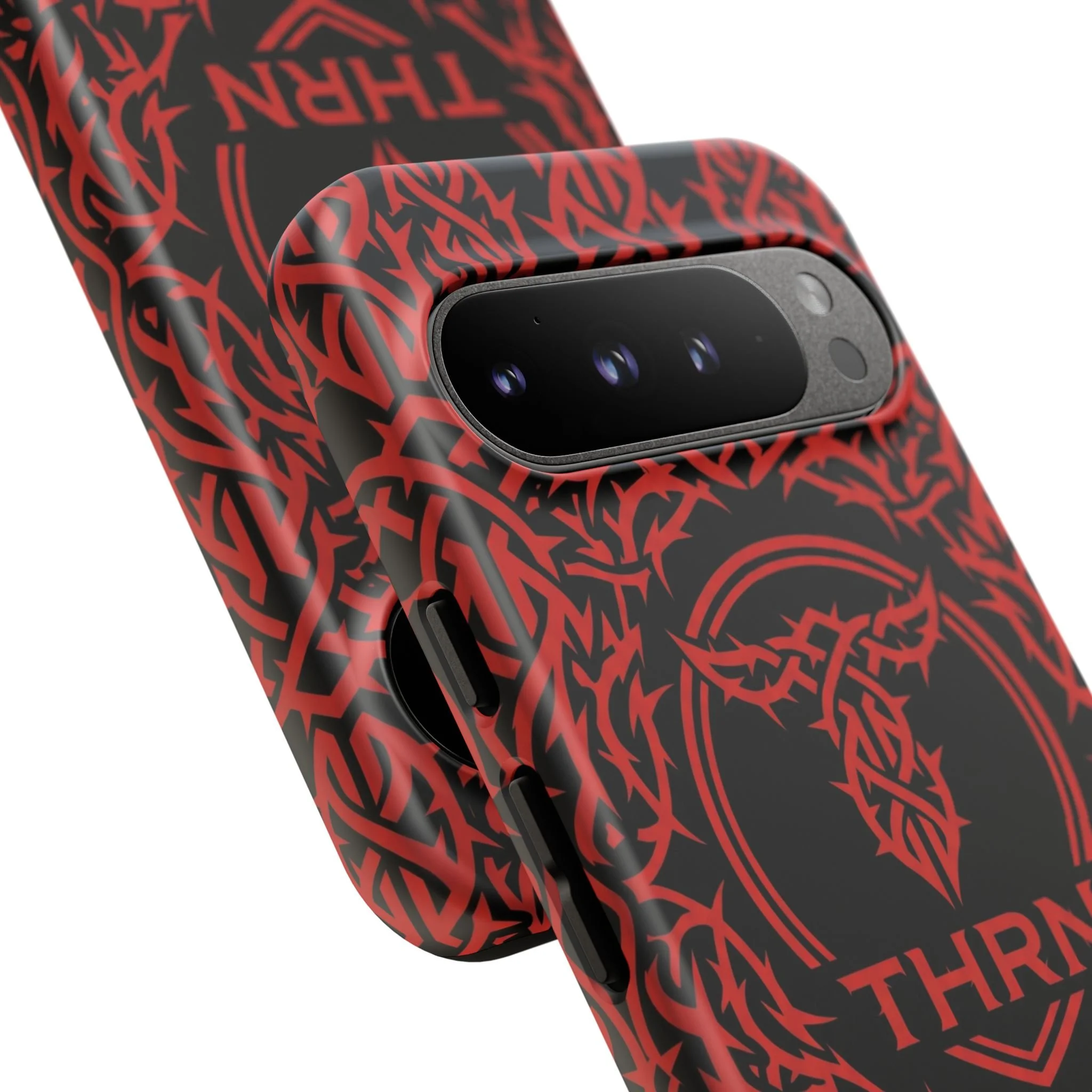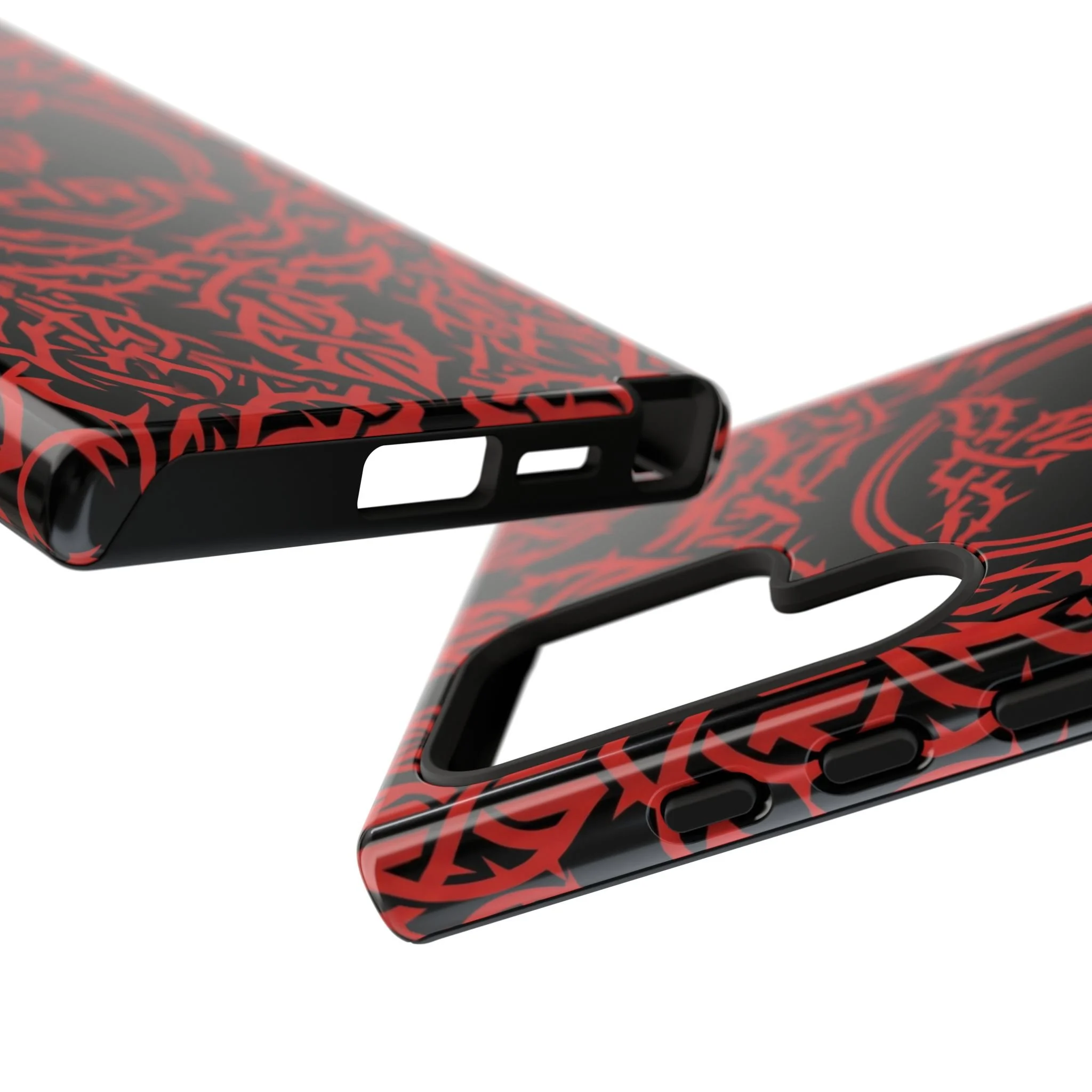A slim, tough phone case with an all-over tribal pattern and bold red-on-black contrast that reads like an emblem for someone who moves hard and speaks less.