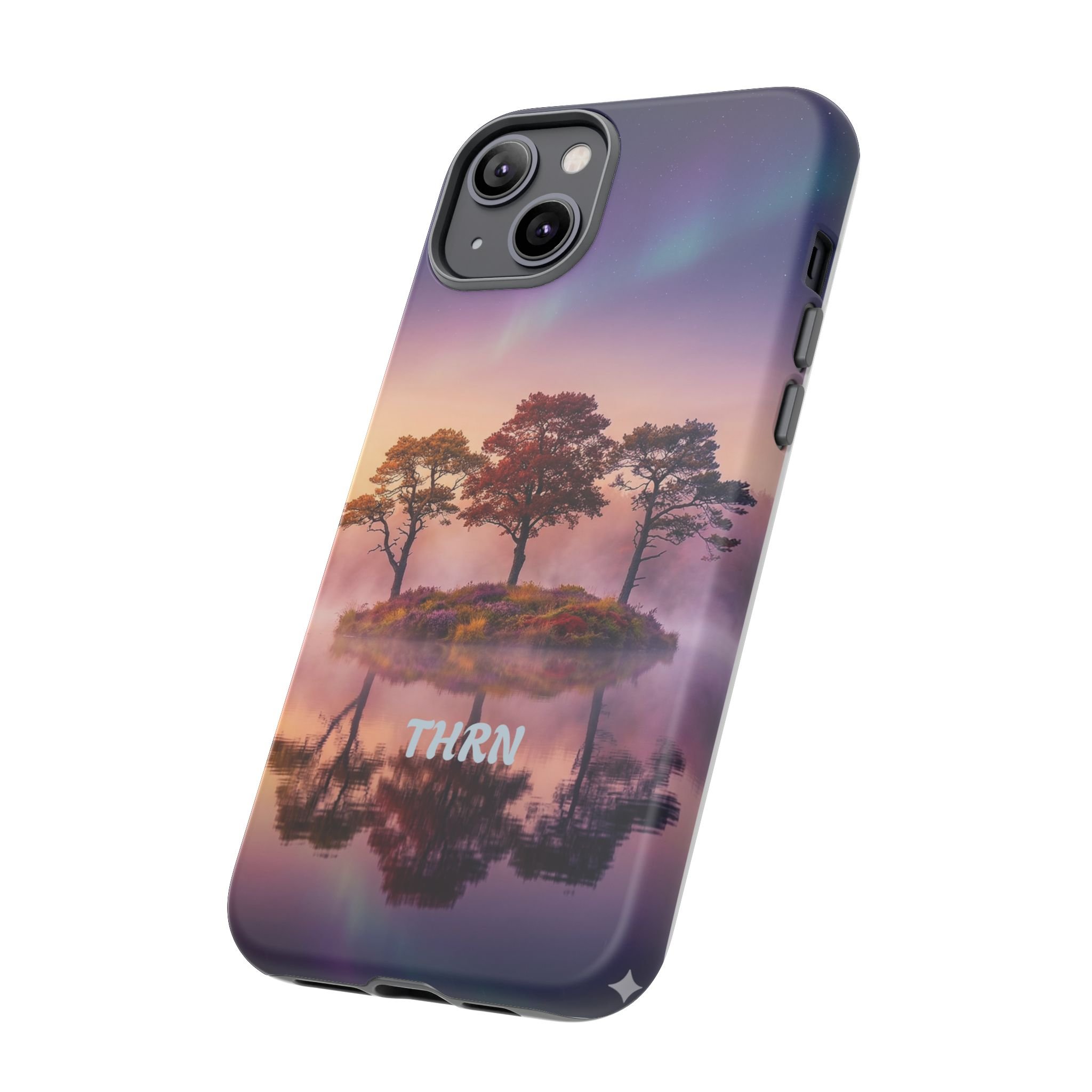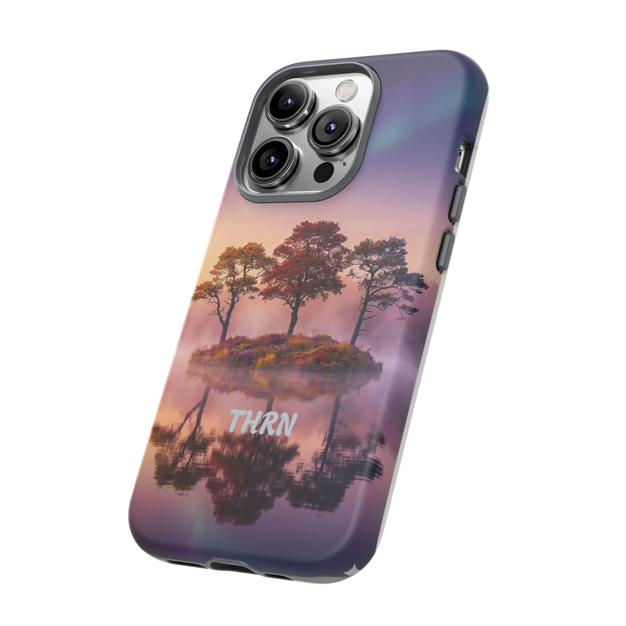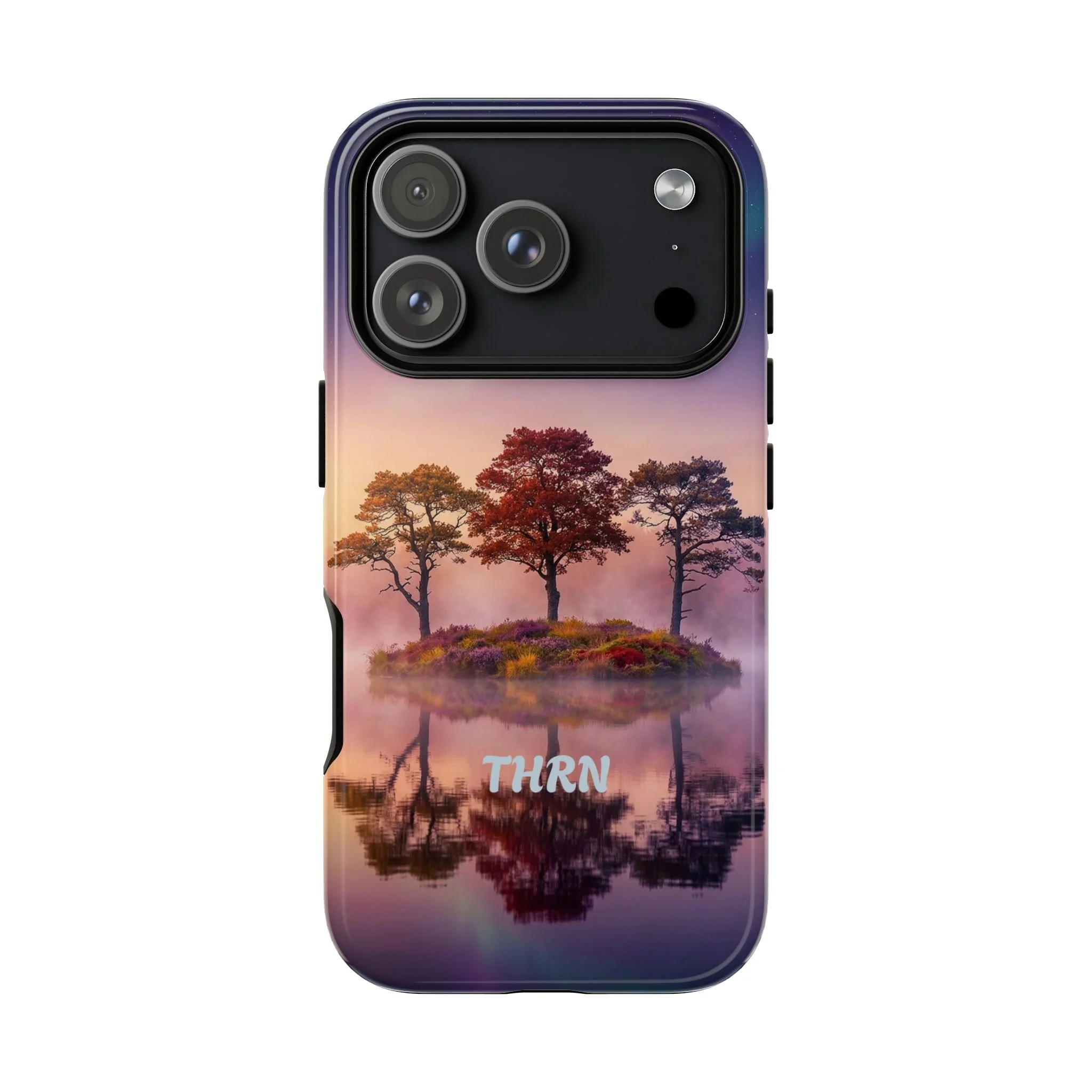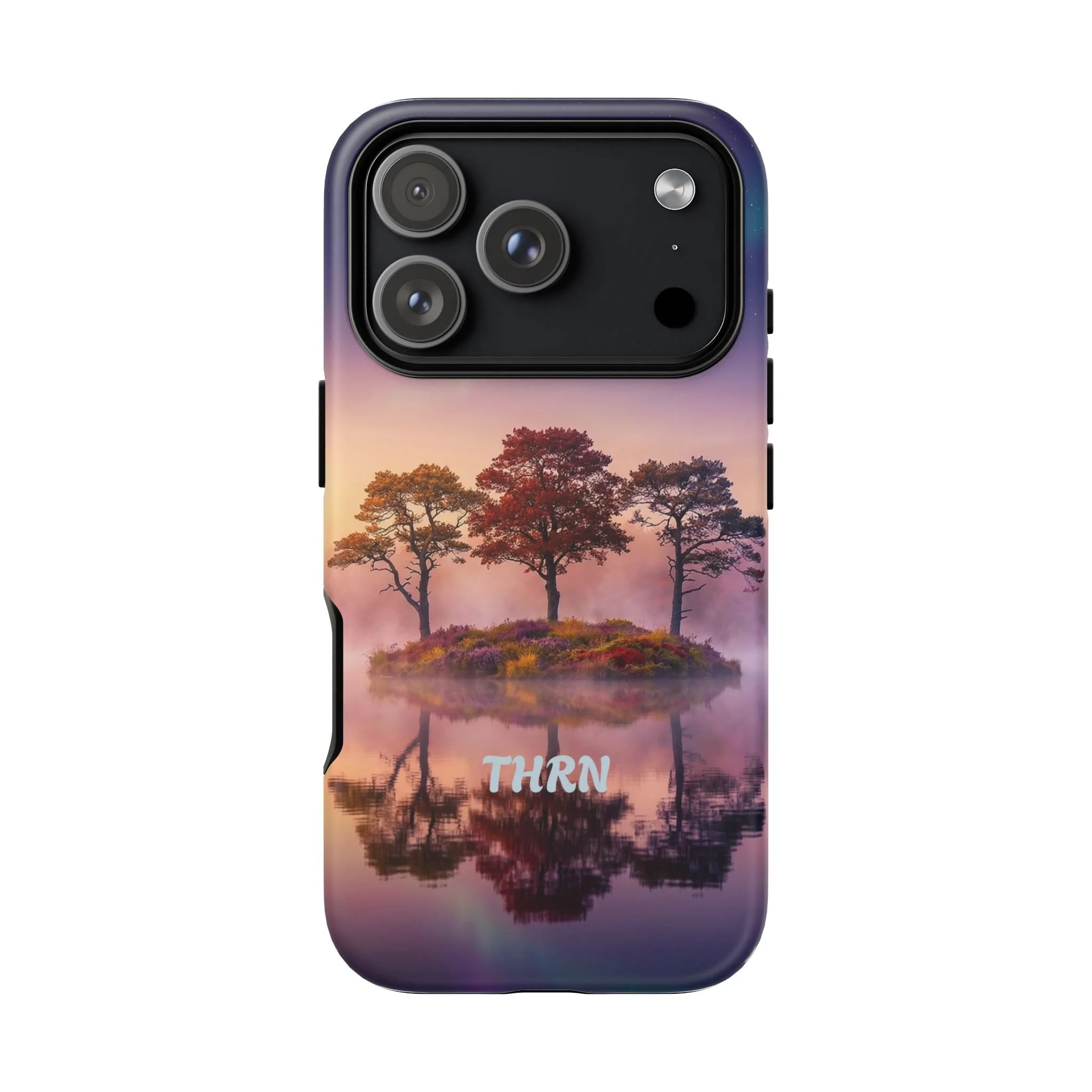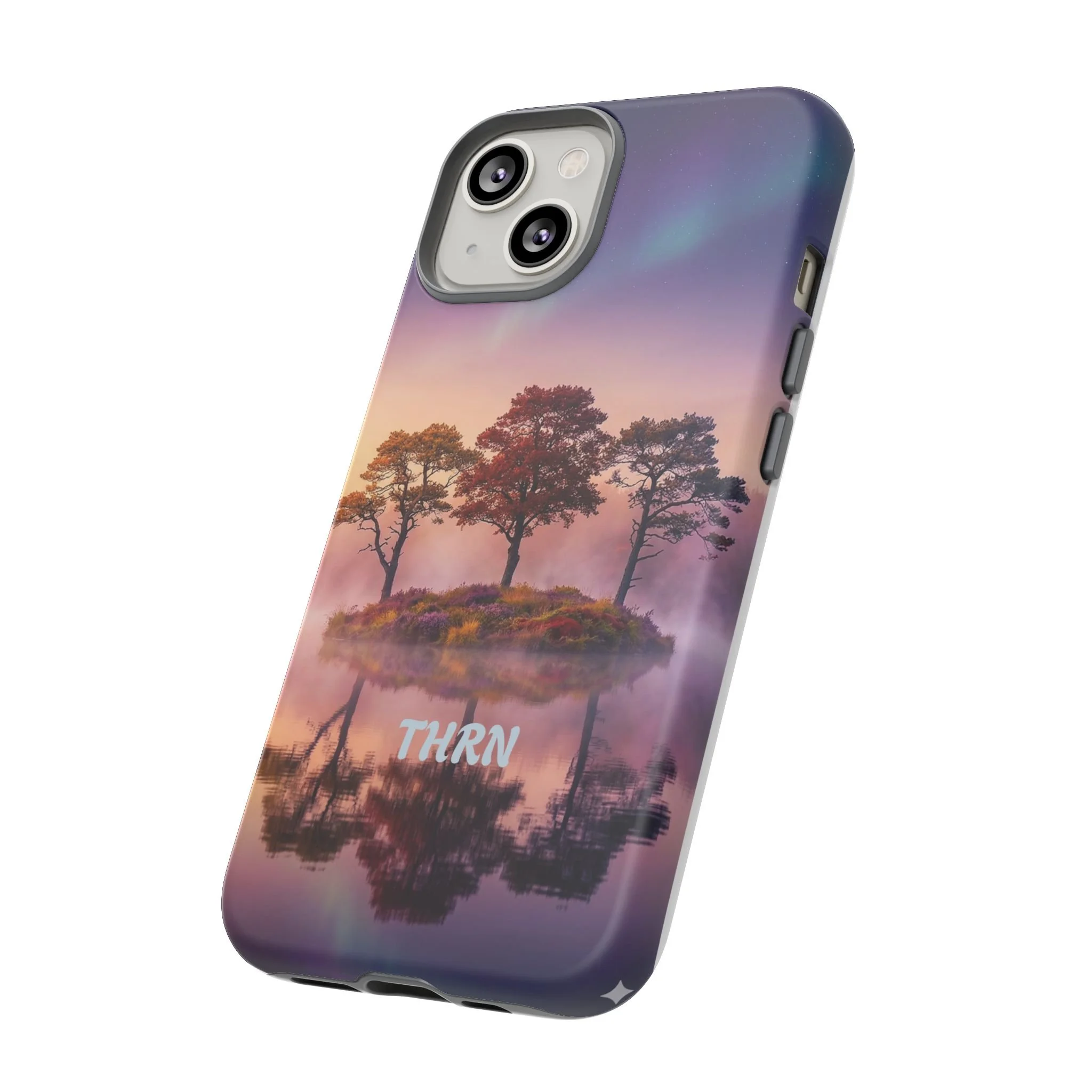 Slip your phone into a case that feels like a quiet moment at dusk. Soft purples and warm golds melt across a mirrored lake, with a tiny island of trees reflected perfectly beneath a sky that hints at northern lights. The slim dual-layer shell combines a glossy (or matte) printed exterior with a TPU silicone liner to absorb shock while keeping the scene vivid — even outdoors. It wears like a little landscape you can carry: calming, resilient, and made to protect the device that keeps you connected to the people and places you love.