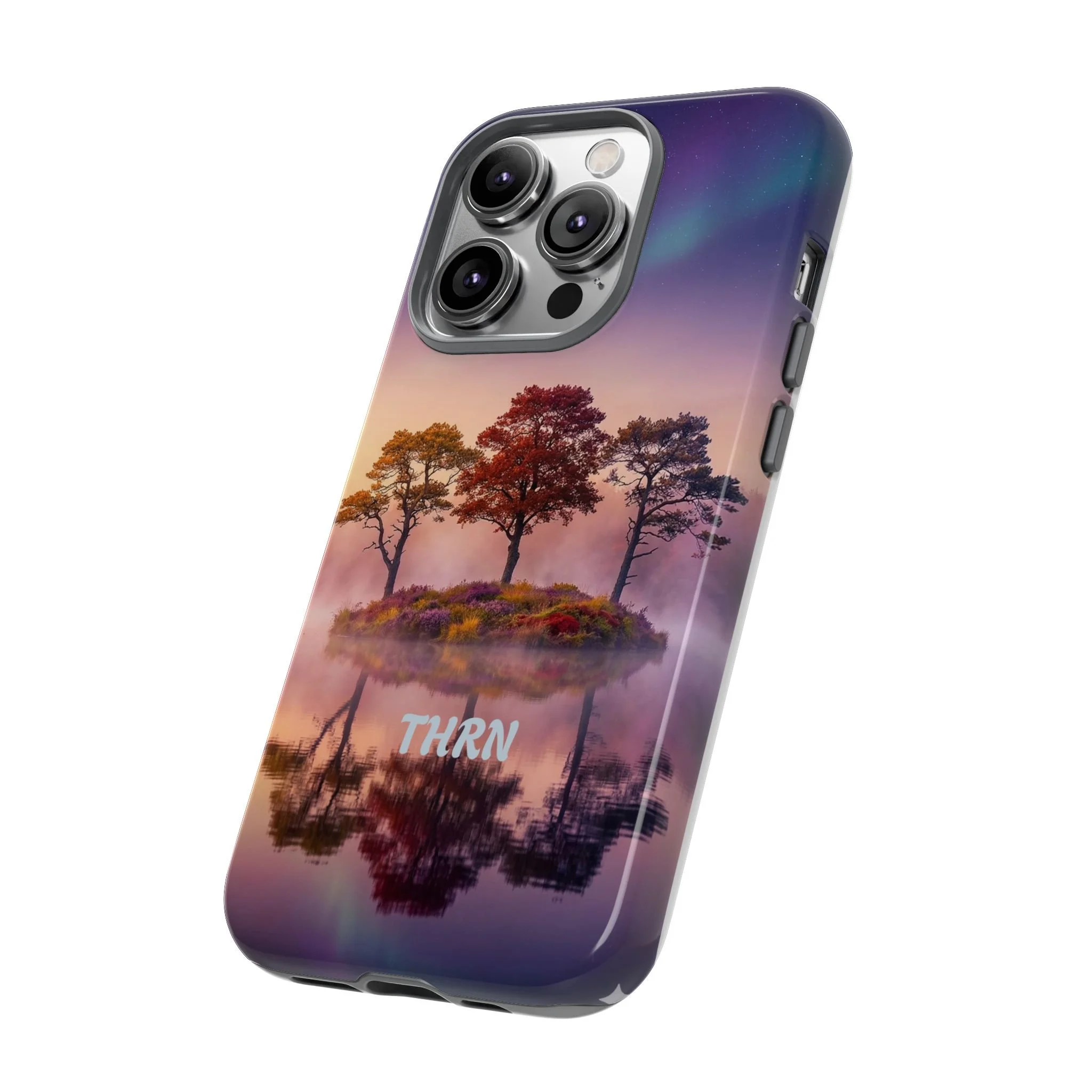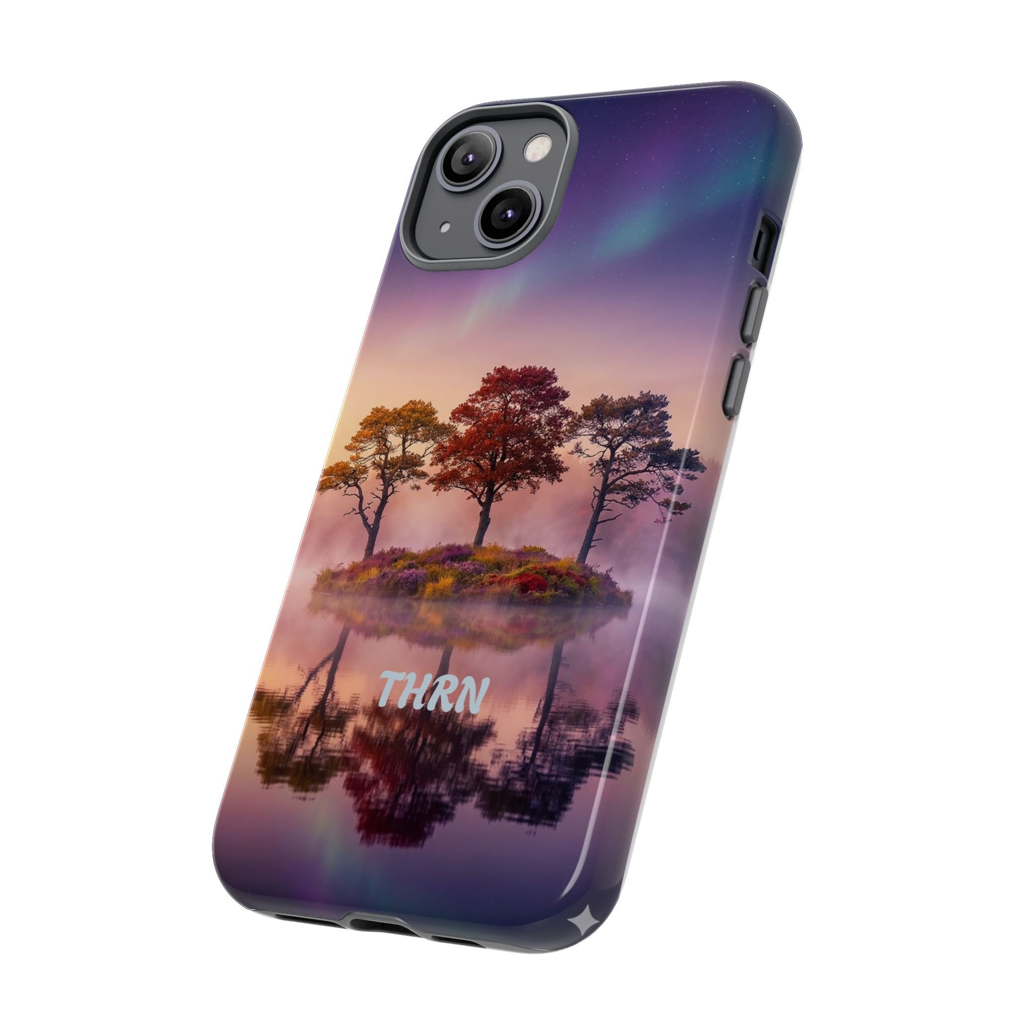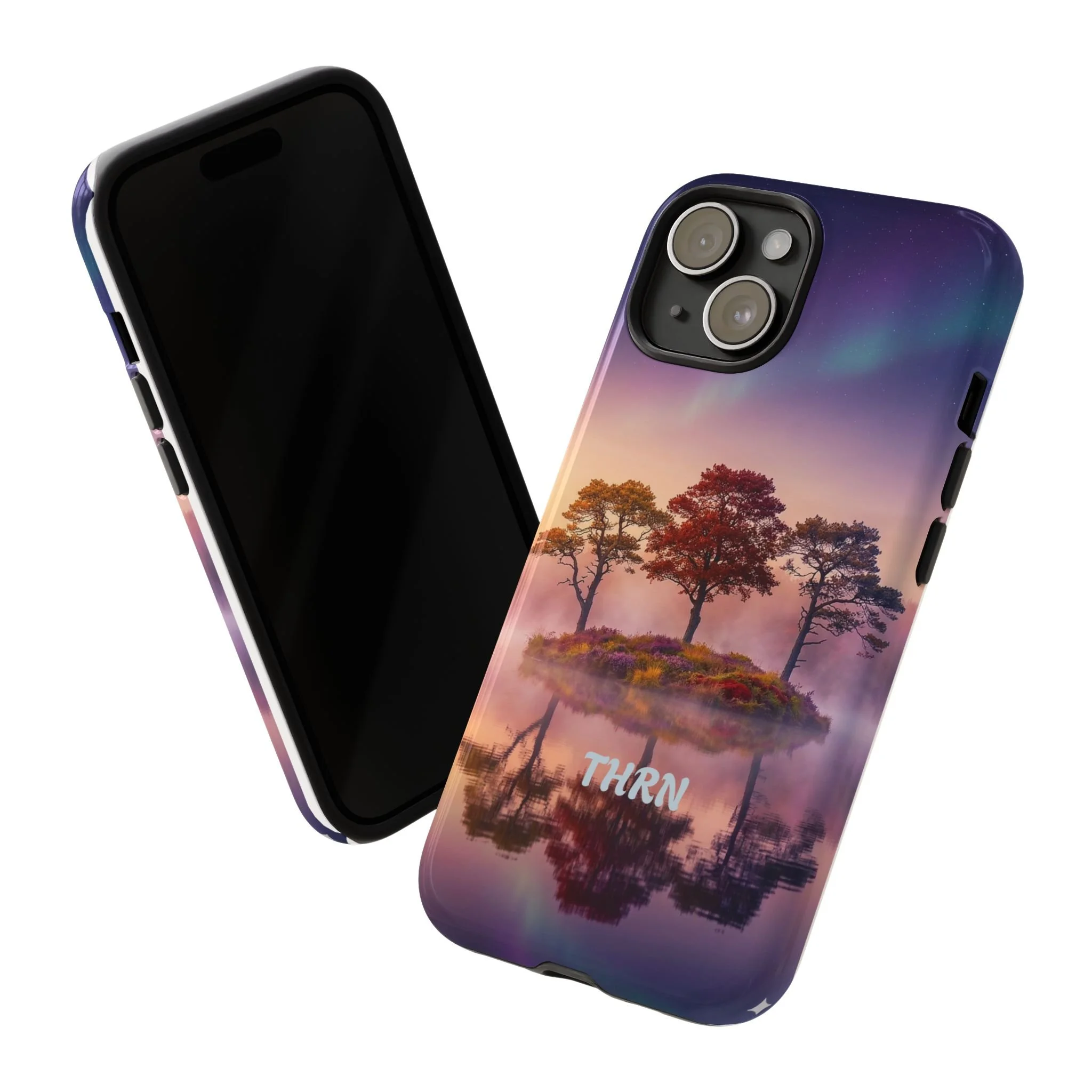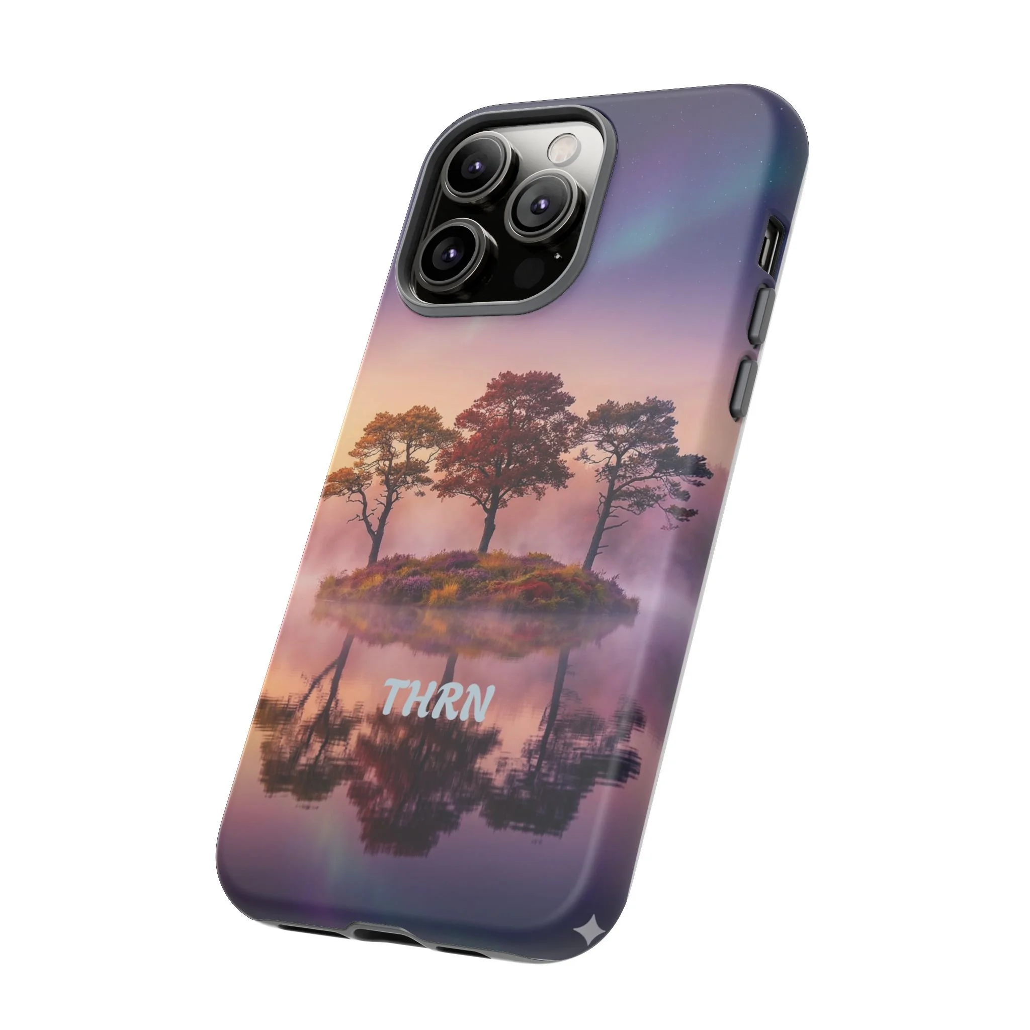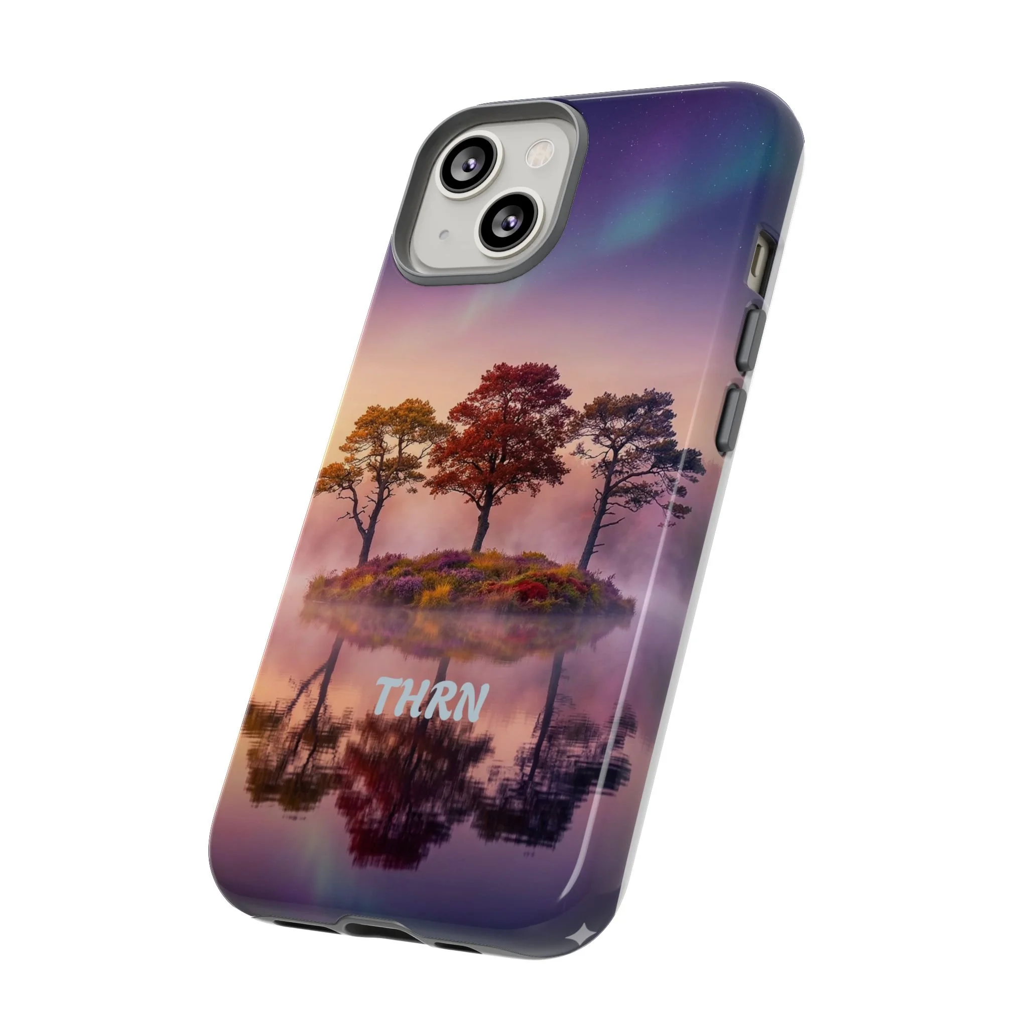 Slip your phone into a case that feels like a quiet moment at dusk. Soft purples and warm golds melt across a mirrored lake, with a tiny island of trees reflected perfectly beneath a sky that hints at northern lights. The slim dual-layer shell combines a glossy (or matte) printed exterior with a TPU silicone liner to absorb shock while keeping the scene vivid — even outdoors. It wears like a little landscape you can carry: calming, resilient, and made to protect the device that keeps you connected to the people and places you love.
