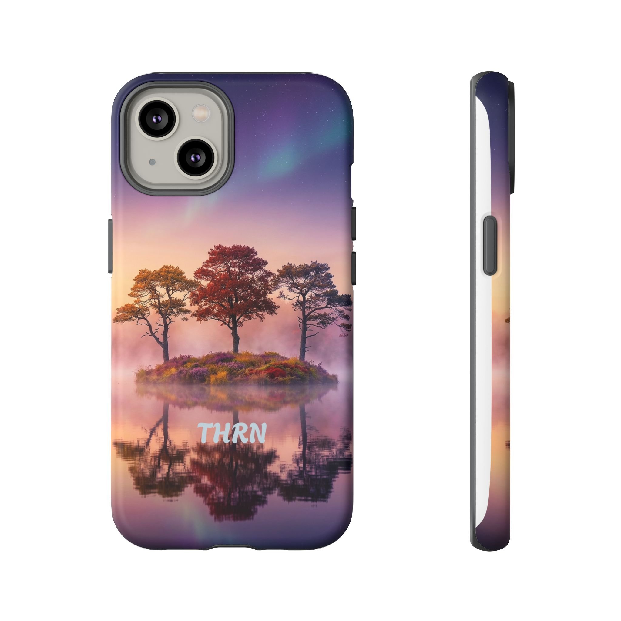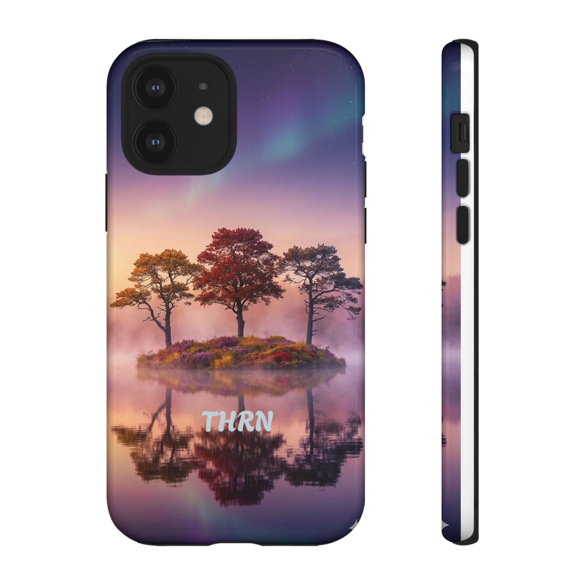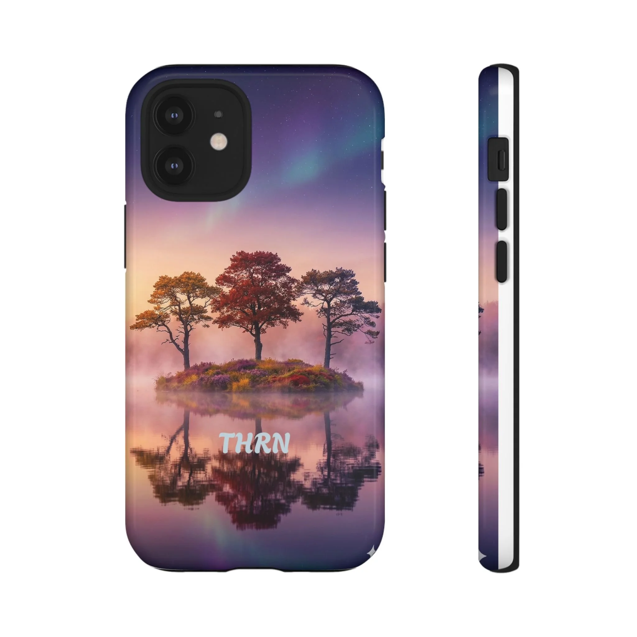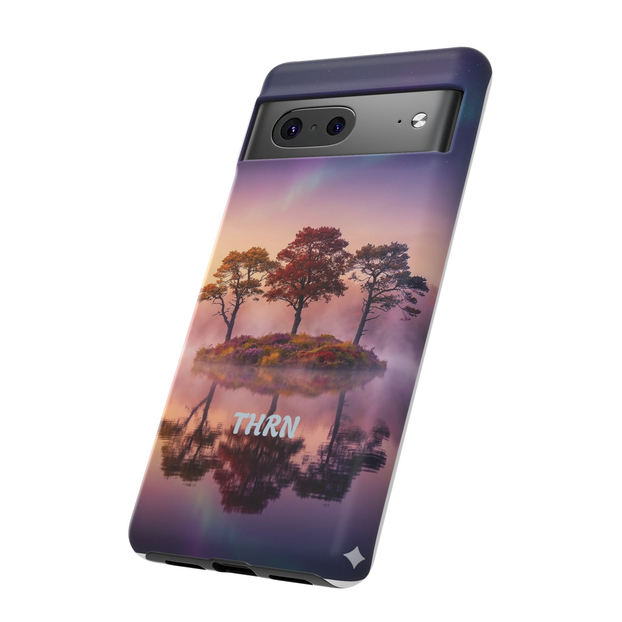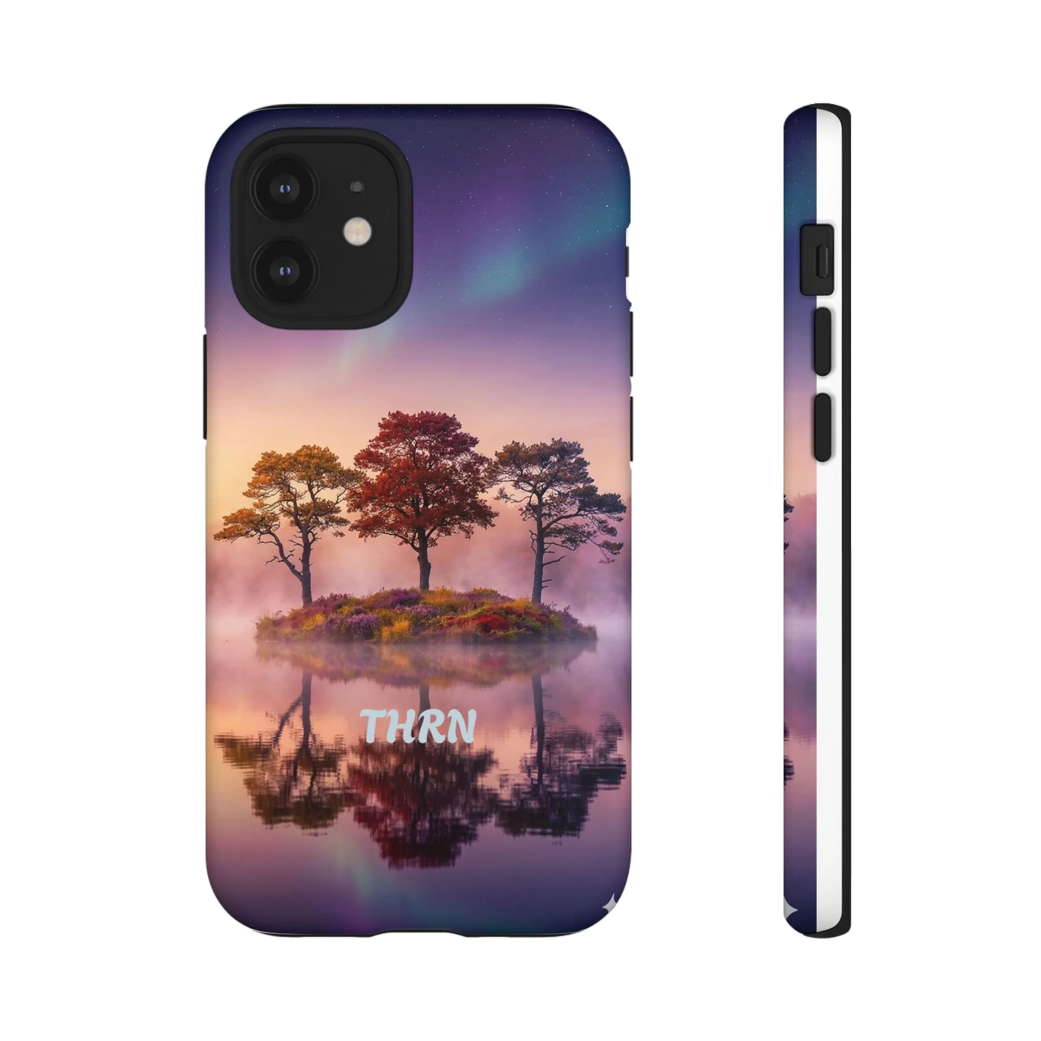 Slip your phone into a case that feels like a quiet moment at dusk. Soft purples and warm golds melt across a mirrored lake, with a tiny island of trees reflected perfectly beneath a sky that hints at northern lights. The slim dual-layer shell combines a glossy (or matte) printed exterior with a TPU silicone liner to absorb shock while keeping the scene vivid — even outdoors. It wears like a little landscape you can carry: calming, resilient, and made to protect the device that keeps you connected to the people and places you love.