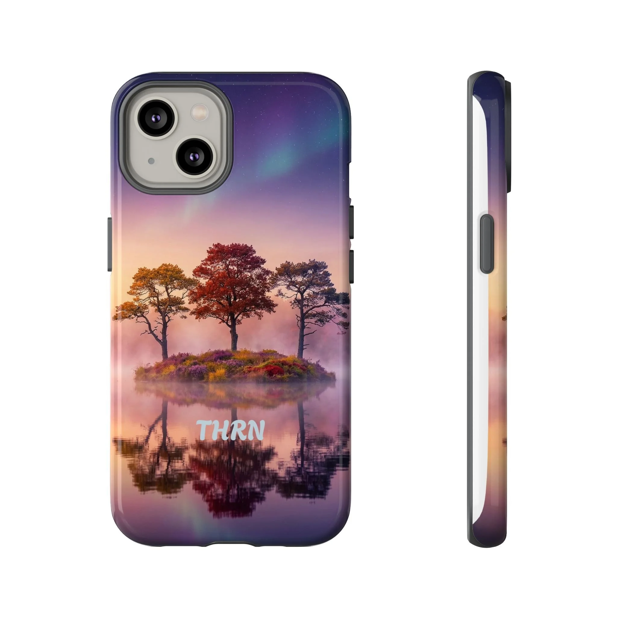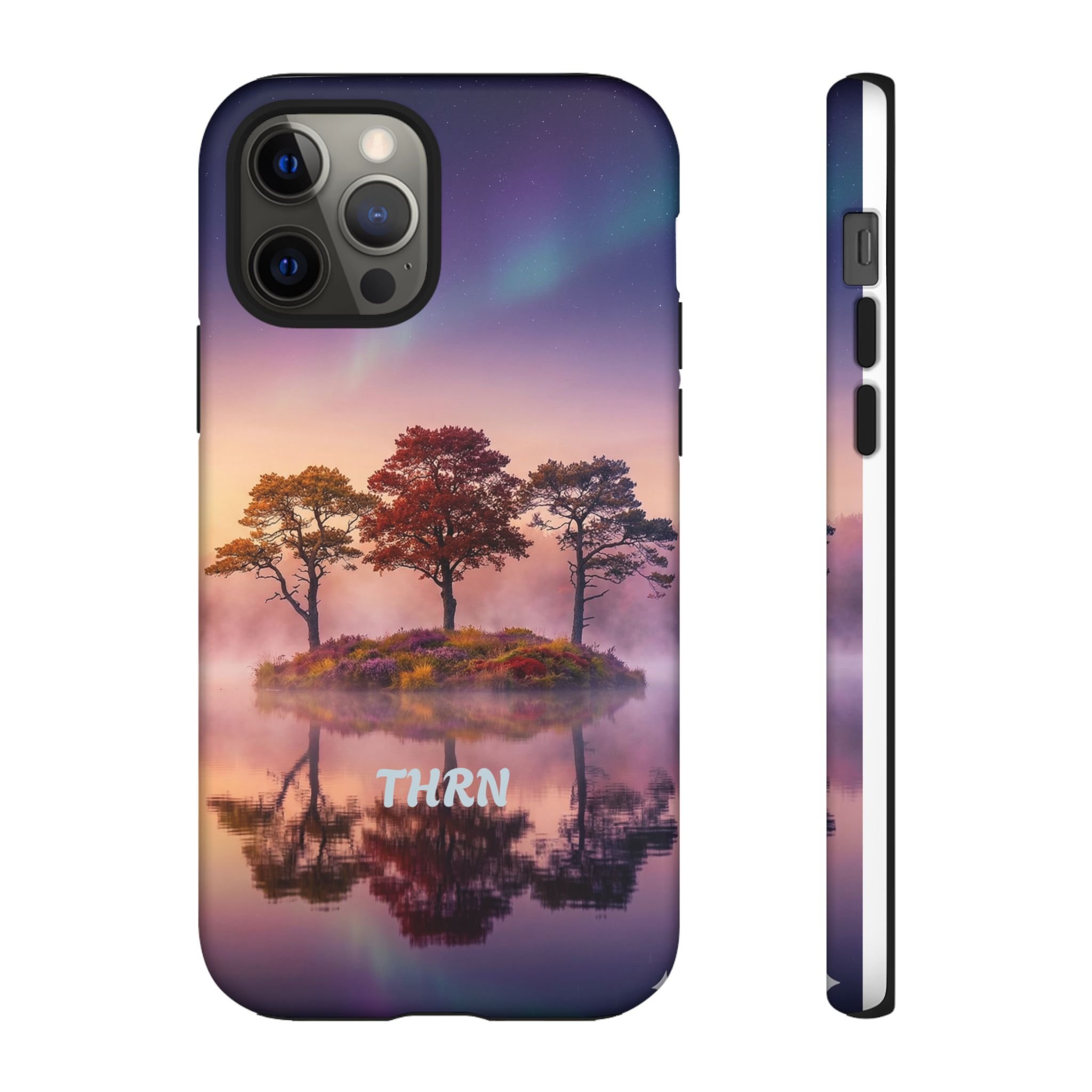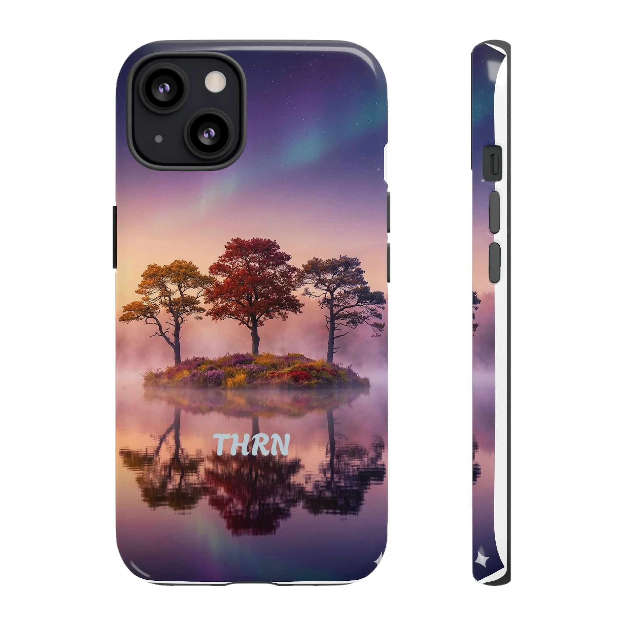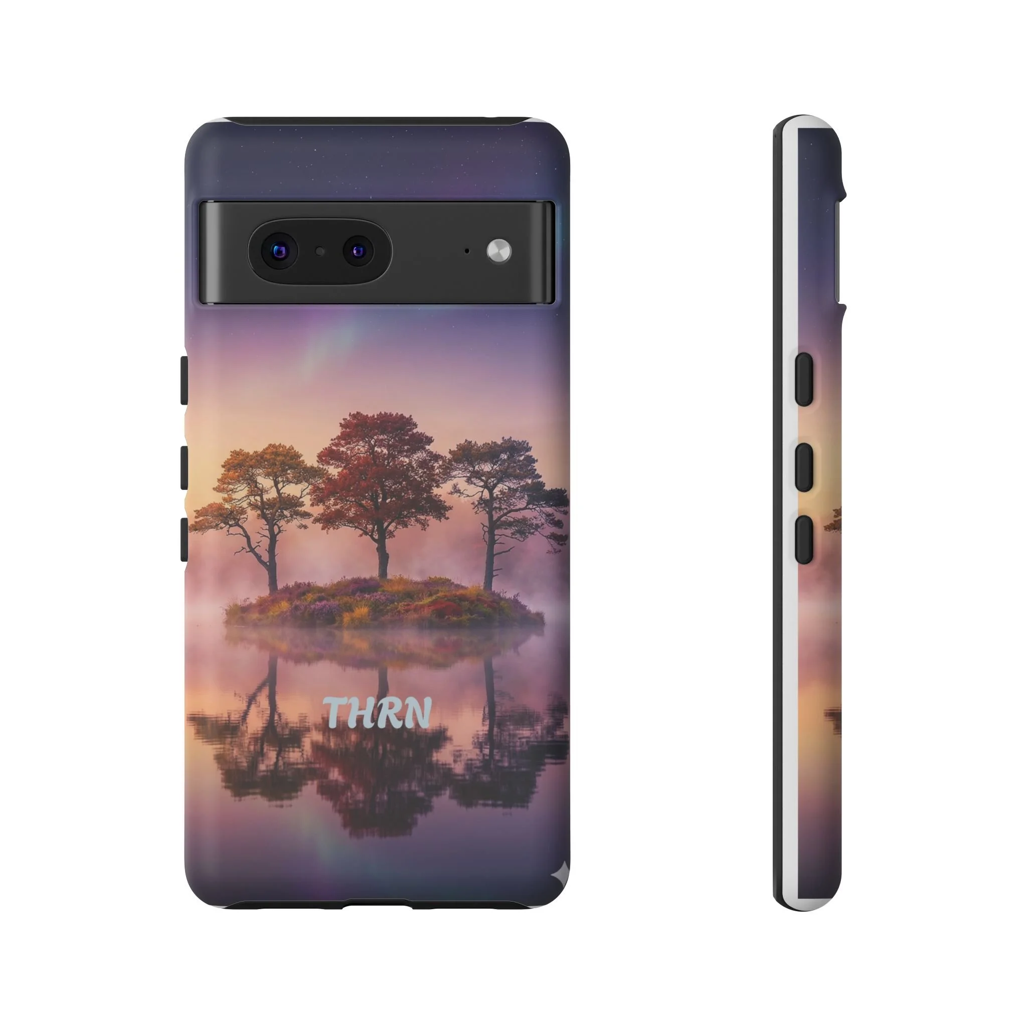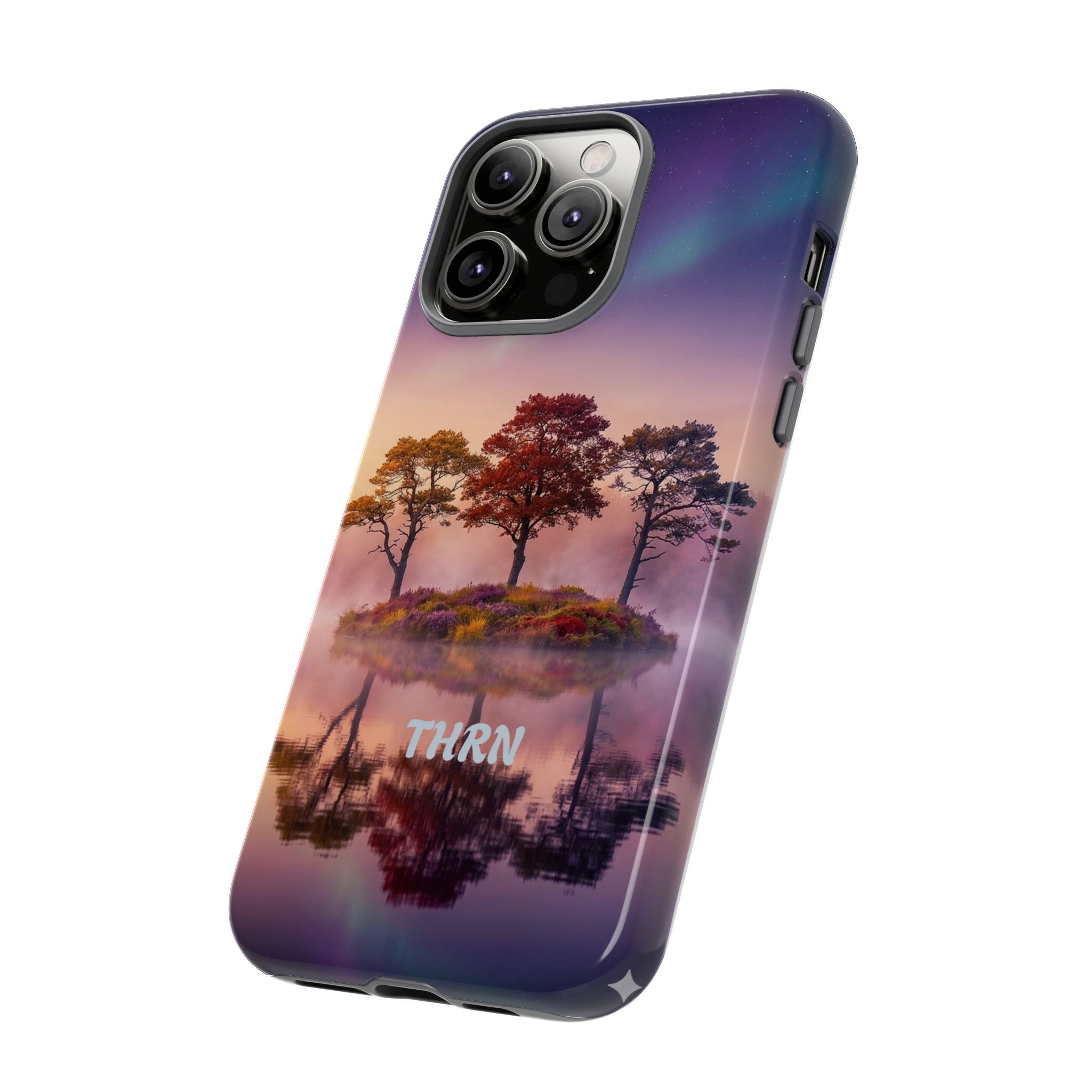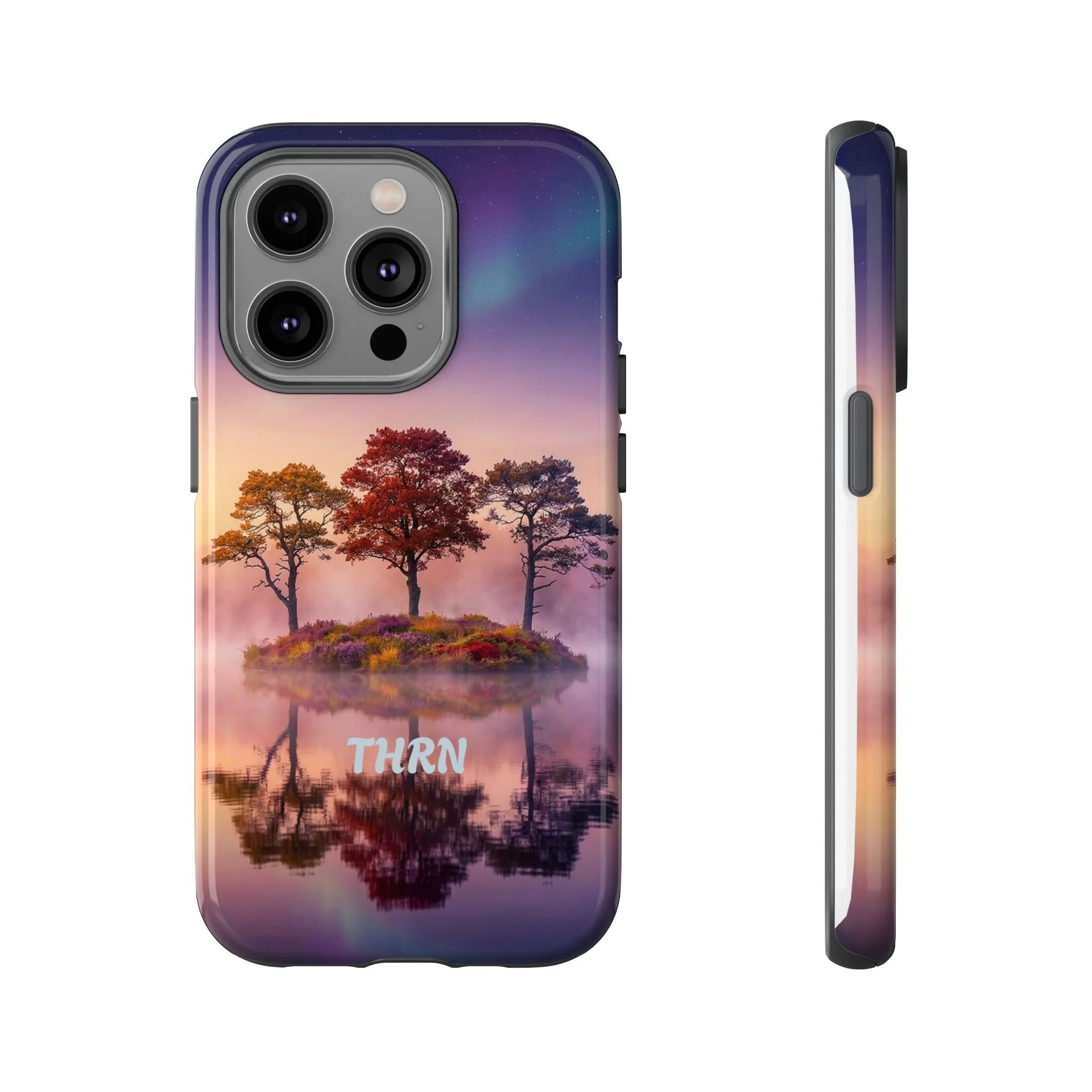 Slip your phone into a case that feels like a quiet moment at dusk. Soft purples and warm golds melt across a mirrored lake, with a tiny island of trees reflected perfectly beneath a sky that hints at northern lights. The slim dual-layer shell combines a glossy (or matte) printed exterior with a TPU silicone liner to absorb shock while keeping the scene vivid — even outdoors. It wears like a little landscape you can carry: calming, resilient, and made to protect the device that keeps you connected to the people and places you love.