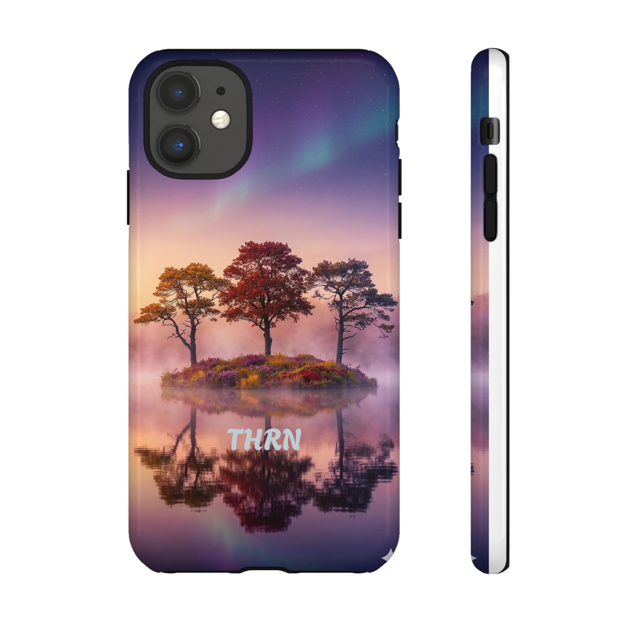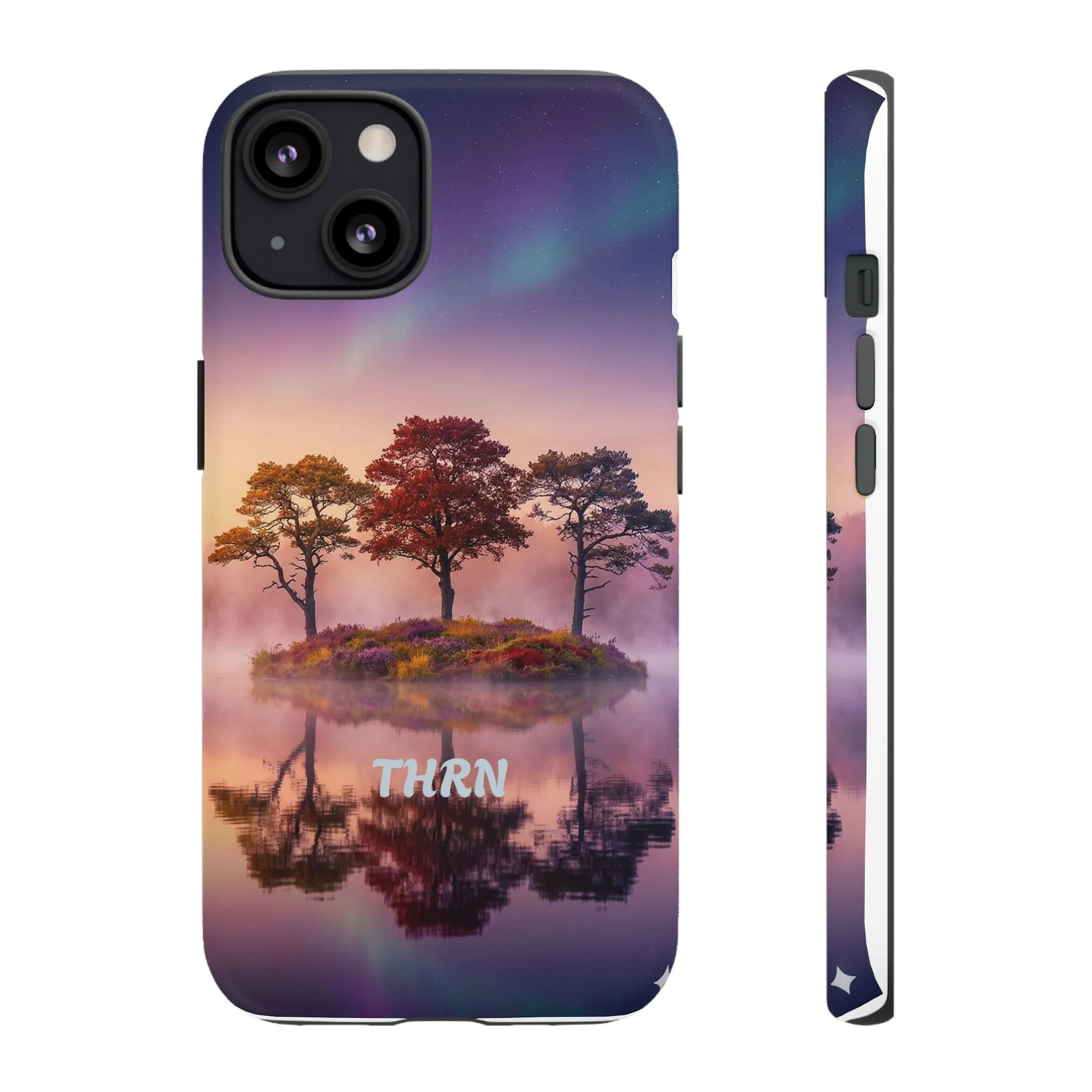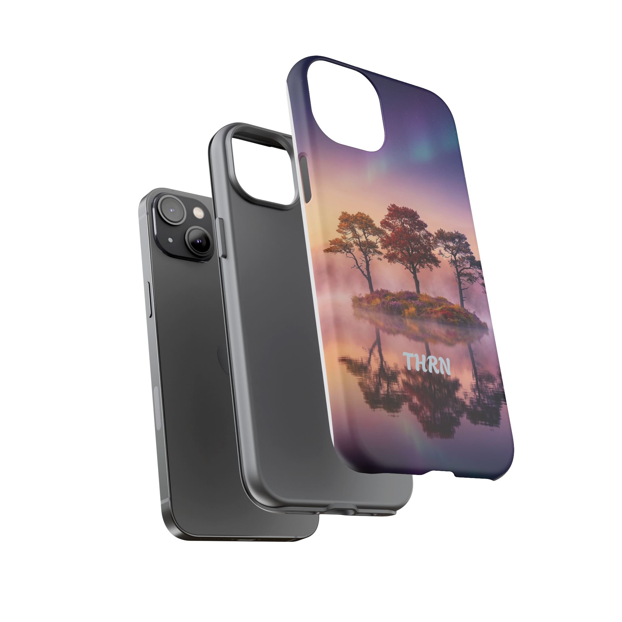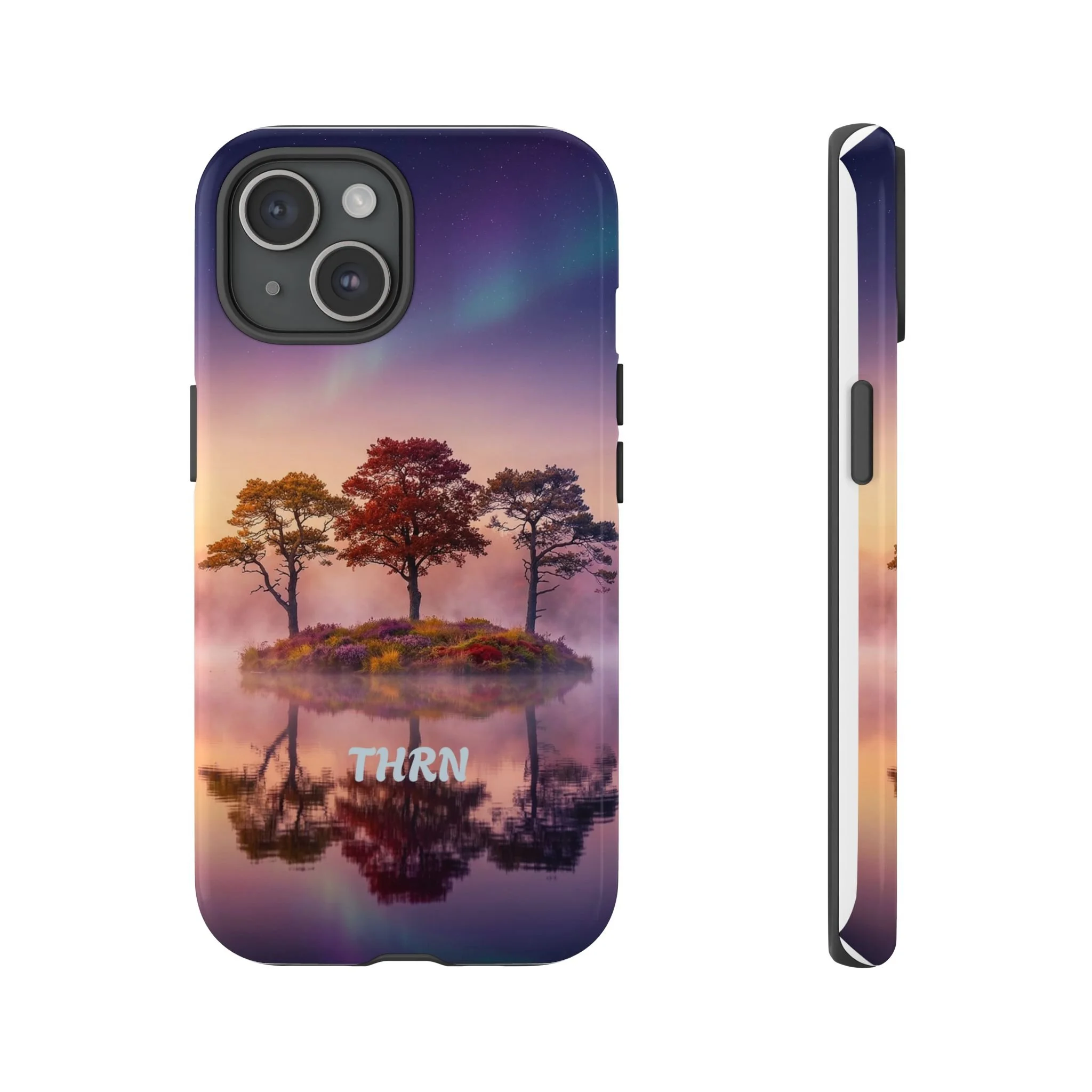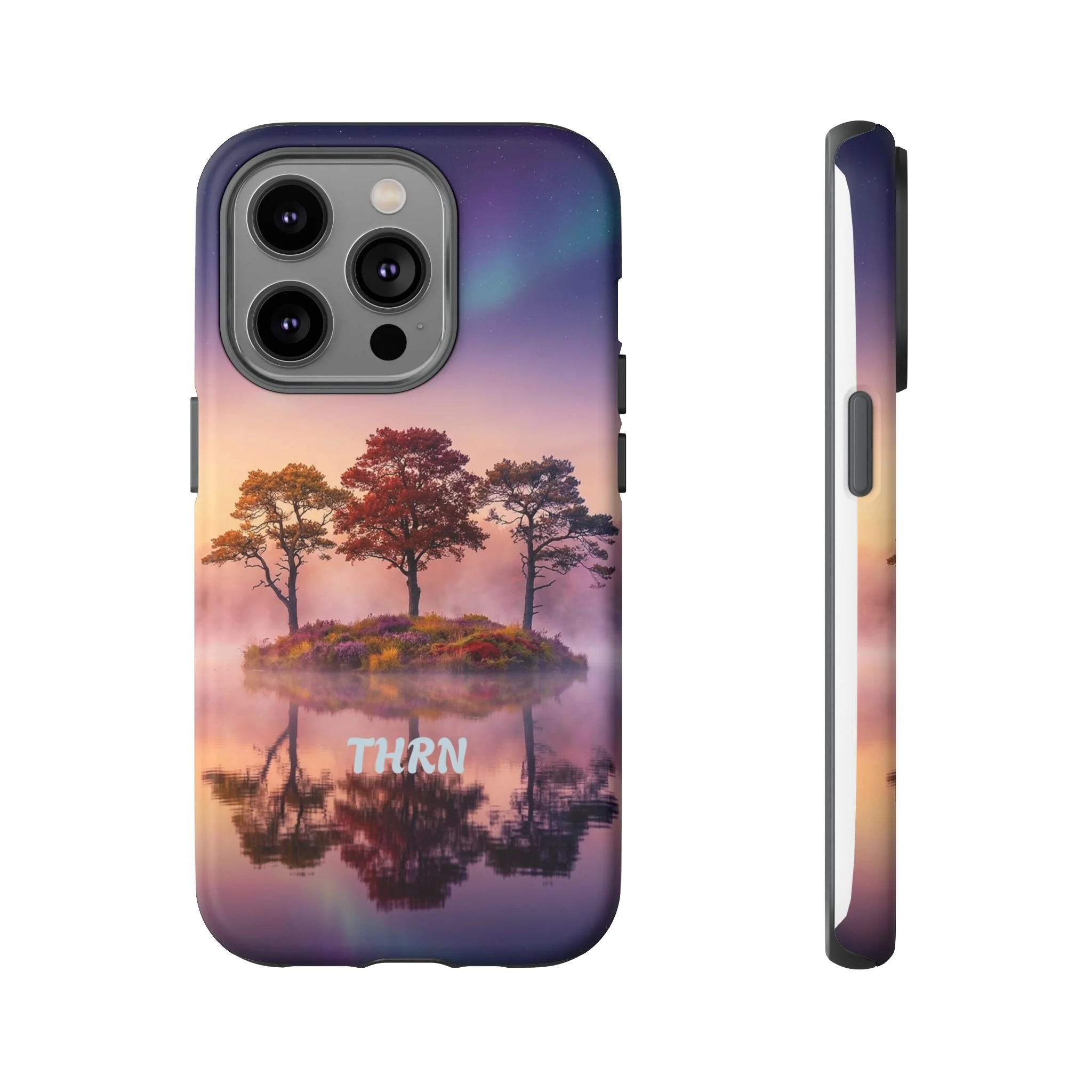 Slip your phone into a case that feels like a quiet moment at dusk. Soft purples and warm golds melt across a mirrored lake, with a tiny island of trees reflected perfectly beneath a sky that hints at northern lights. The slim dual-layer shell combines a glossy (or matte) printed exterior with a TPU silicone liner to absorb shock while keeping the scene vivid — even outdoors. It wears like a little landscape you can carry: calming, resilient, and made to protect the device that keeps you connected to the people and places you love.