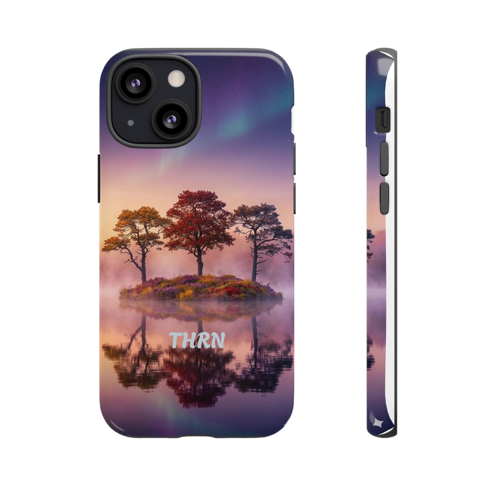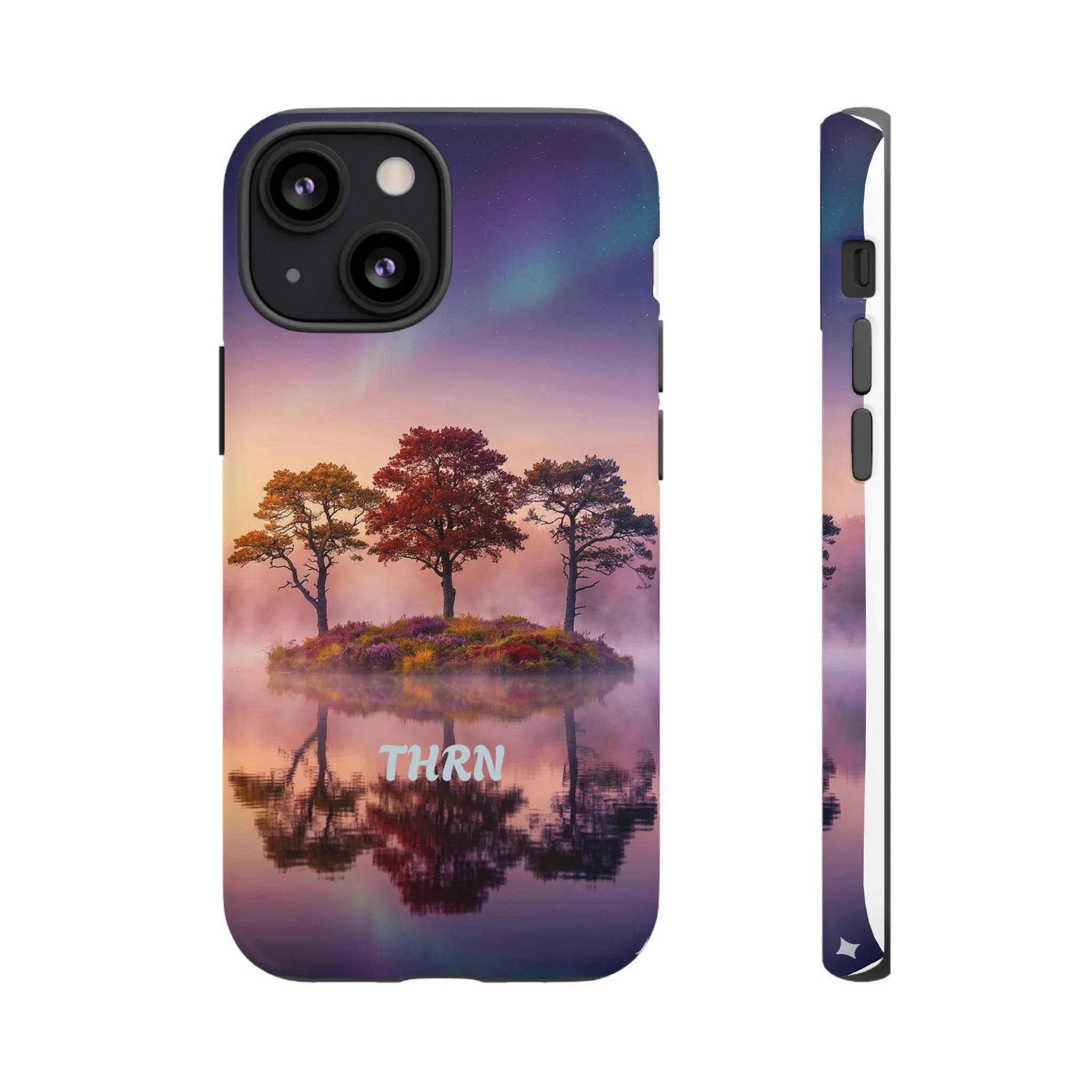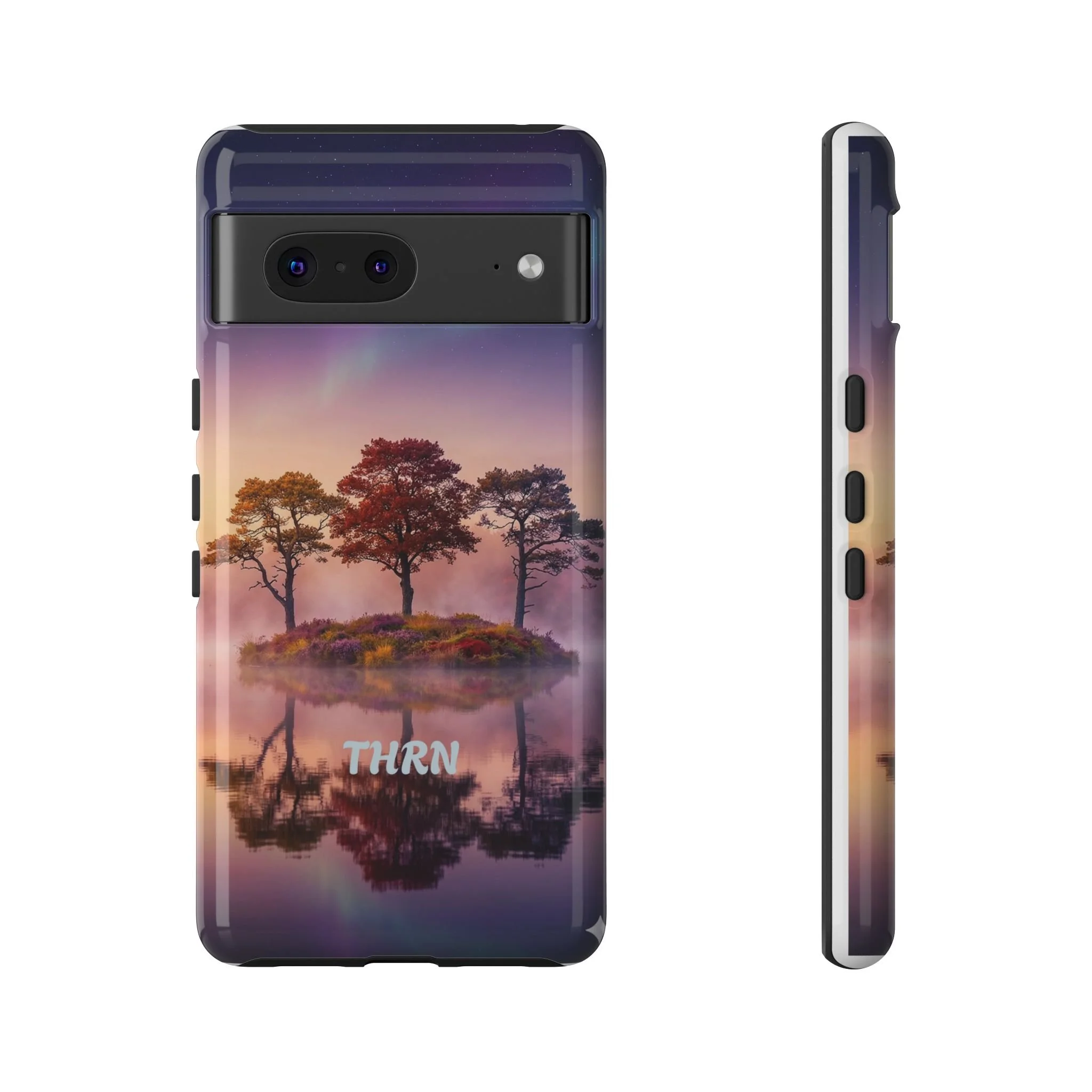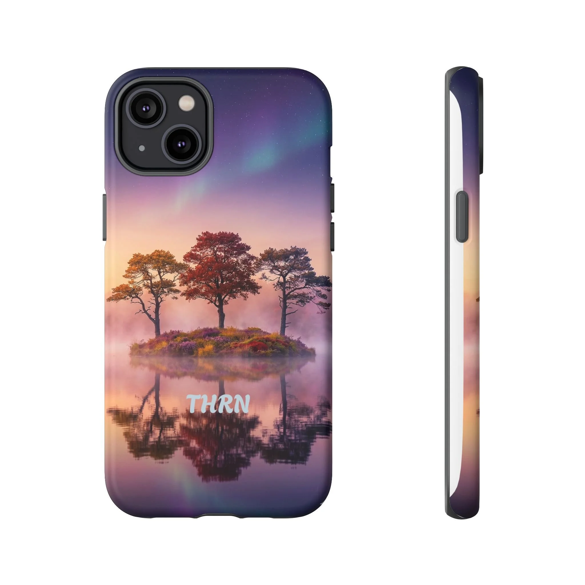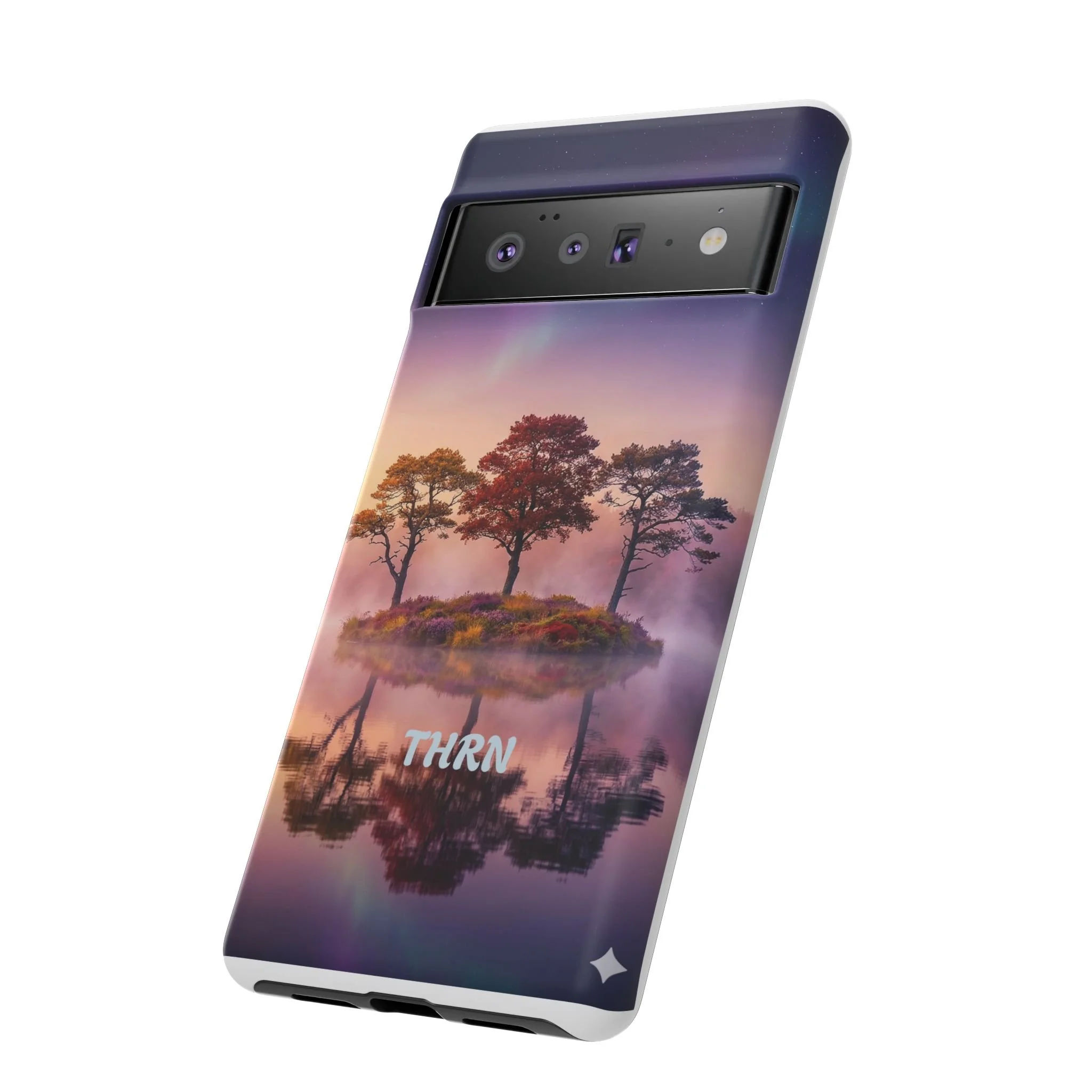 Slip your phone into a case that feels like a quiet moment at dusk. Soft purples and warm golds melt across a mirrored lake, with a tiny island of trees reflected perfectly beneath a sky that hints at northern lights. The slim dual-layer shell combines a glossy (or matte) printed exterior with a TPU silicone liner to absorb shock while keeping the scene vivid — even outdoors. It wears like a little landscape you can carry: calming, resilient, and made to protect the device that keeps you connected to the people and places you love.