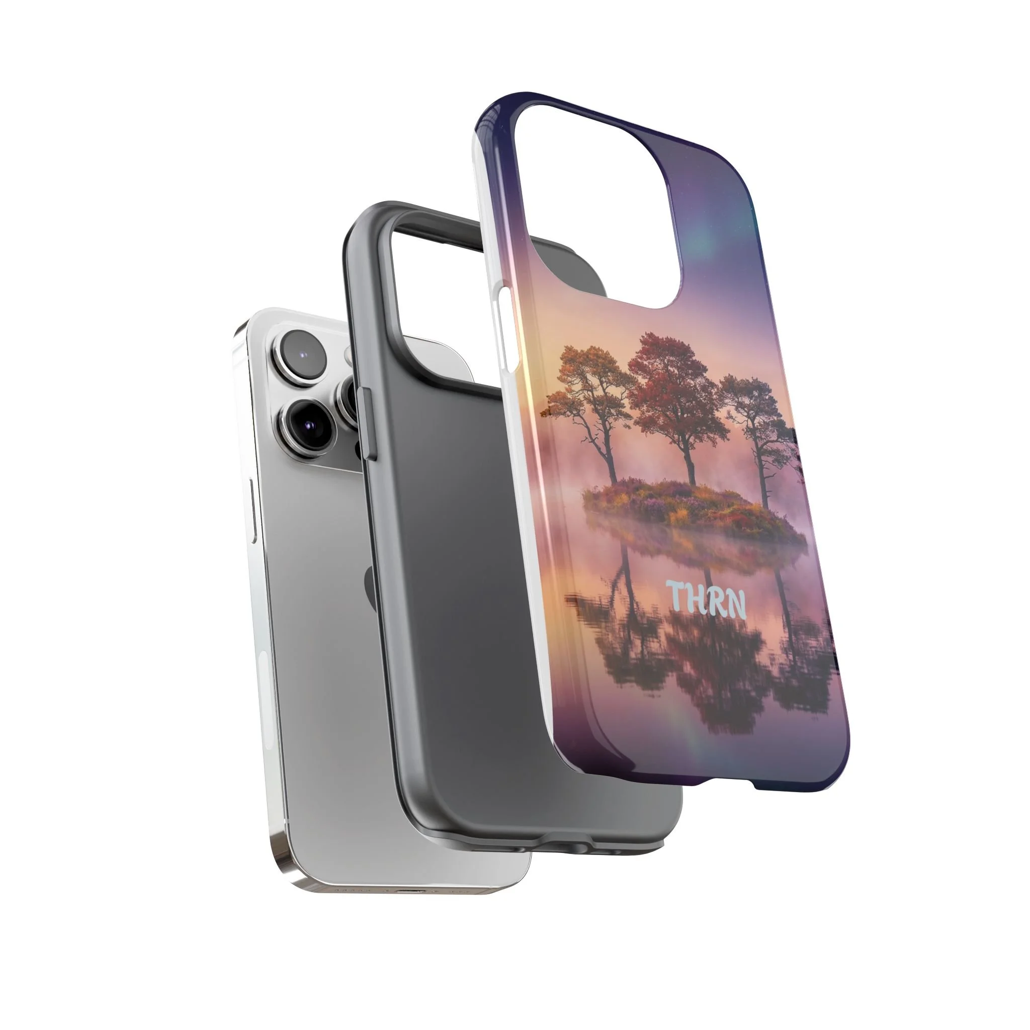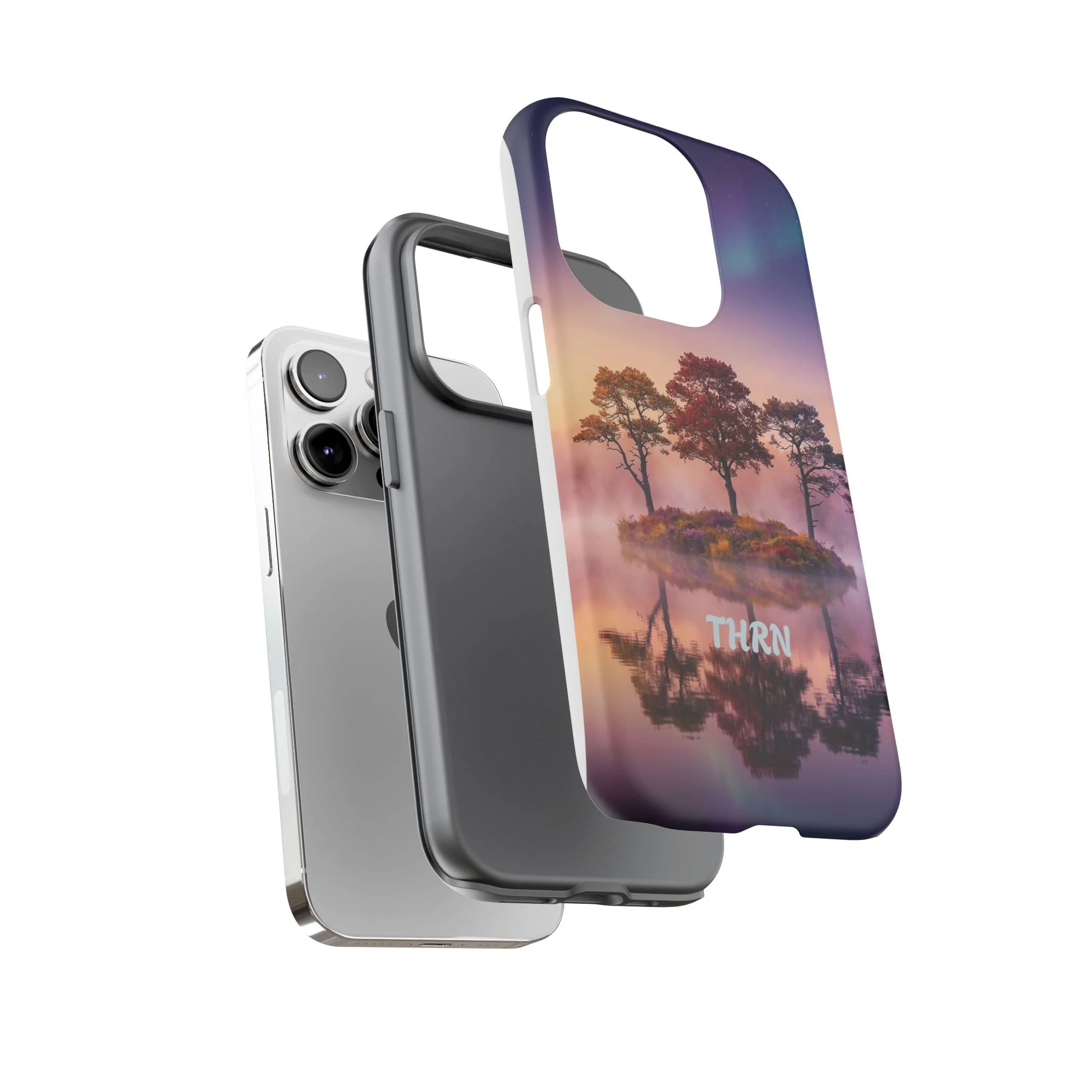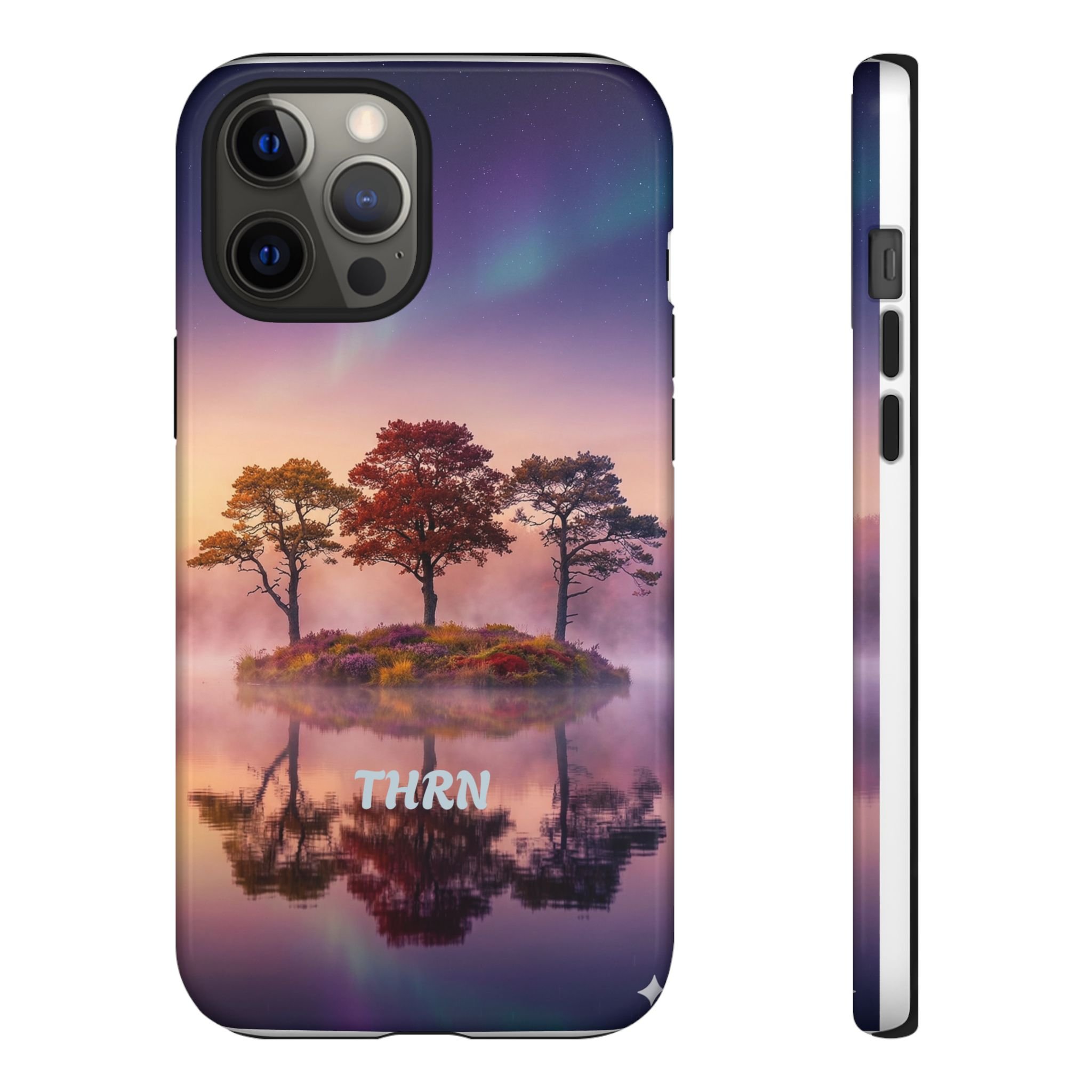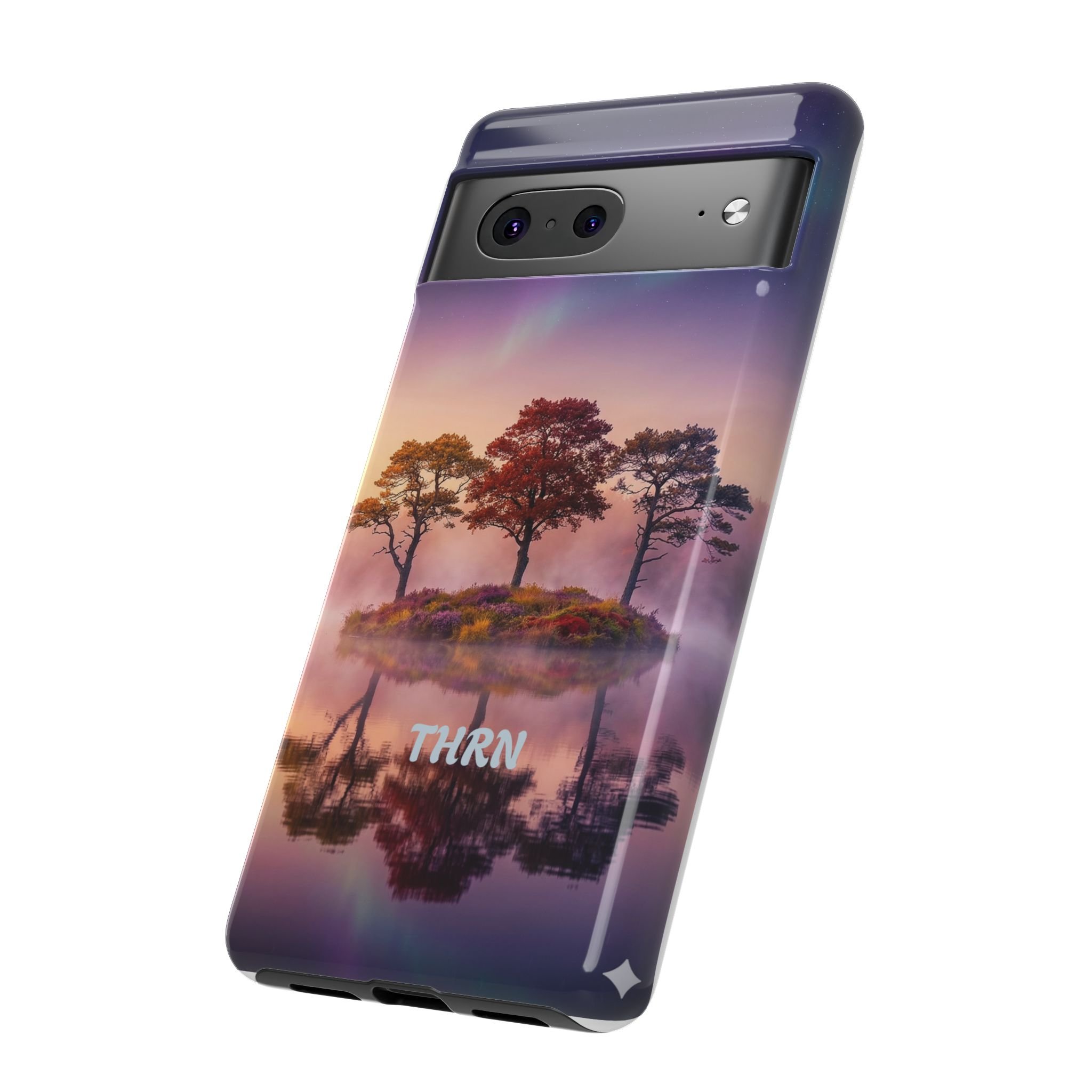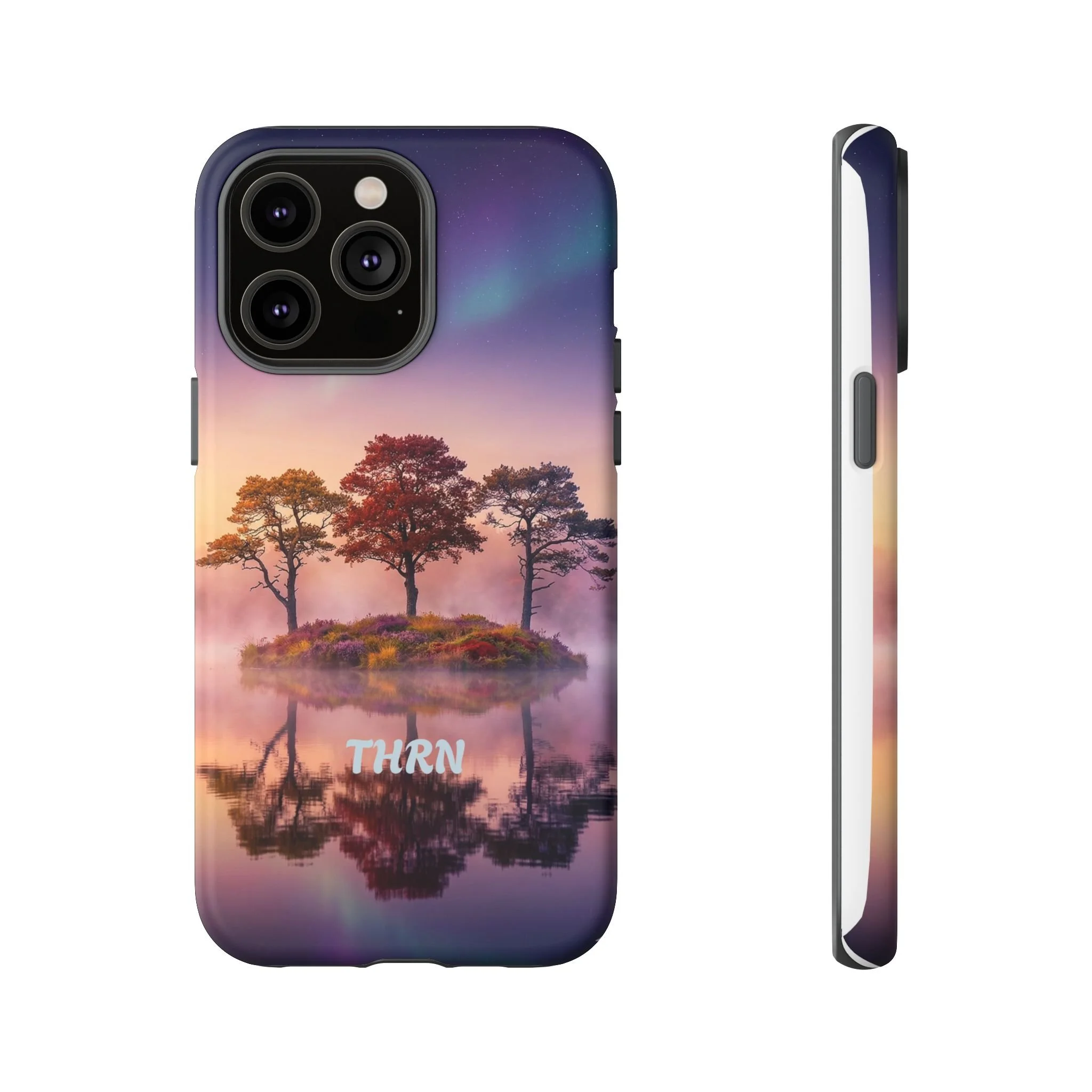 Slip your phone into a case that feels like a quiet moment at dusk. Soft purples and warm golds melt across a mirrored lake, with a tiny island of trees reflected perfectly beneath a sky that hints at northern lights. The slim dual-layer shell combines a glossy (or matte) printed exterior with a TPU silicone liner to absorb shock while keeping the scene vivid — even outdoors. It wears like a little landscape you can carry: calming, resilient, and made to protect the device that keeps you connected to the people and places you love.