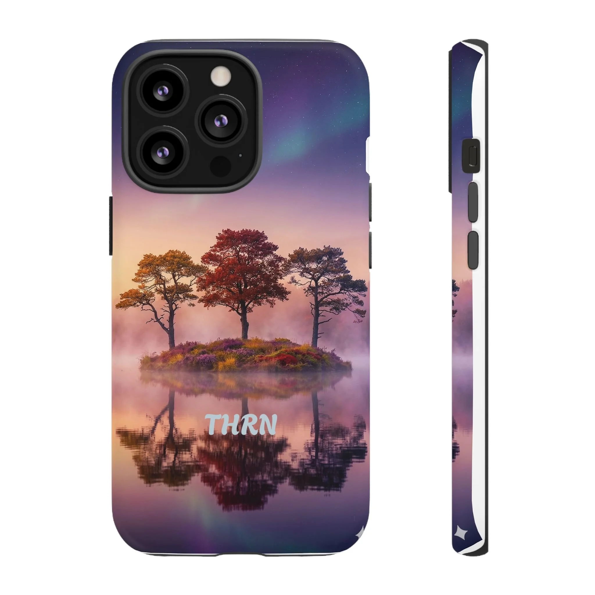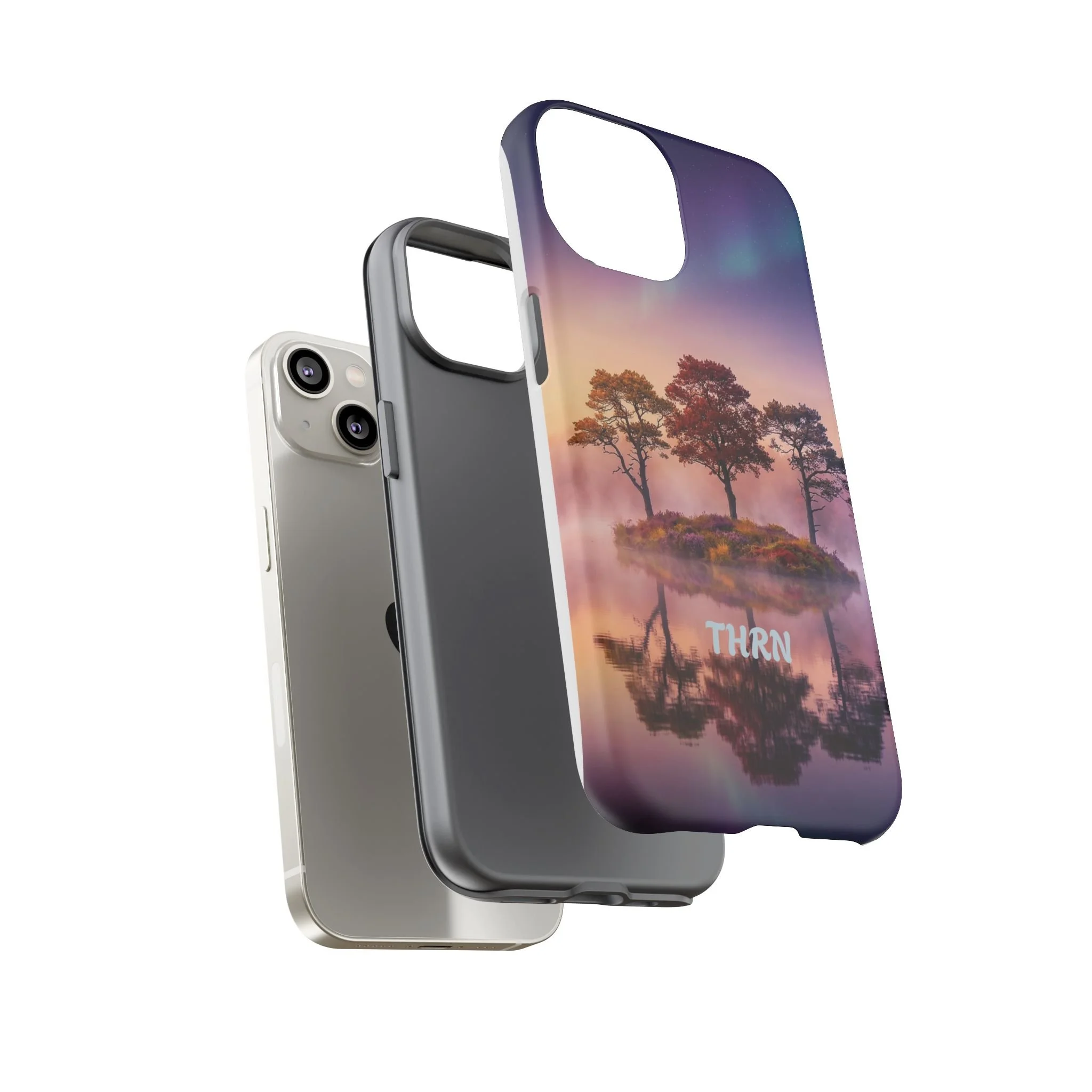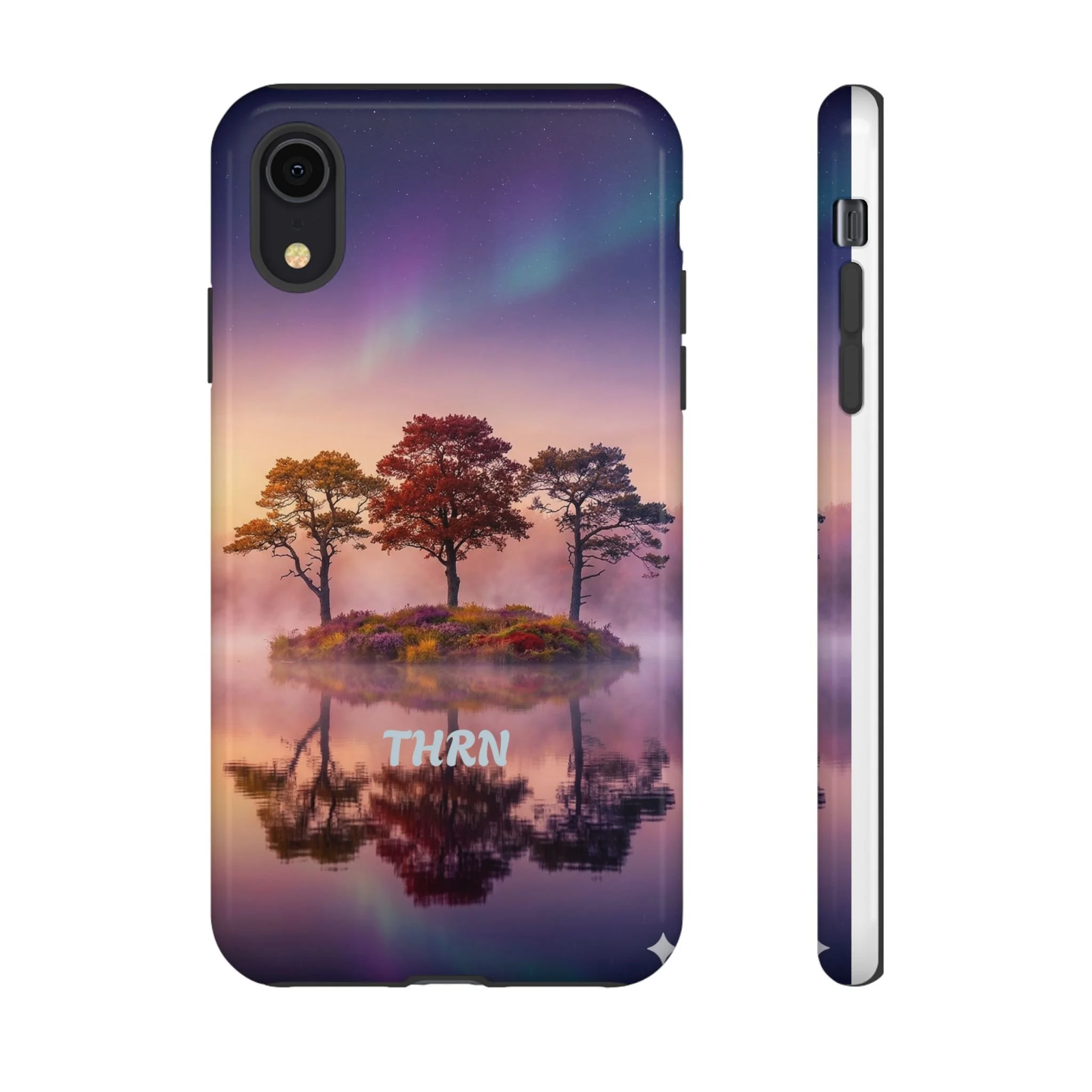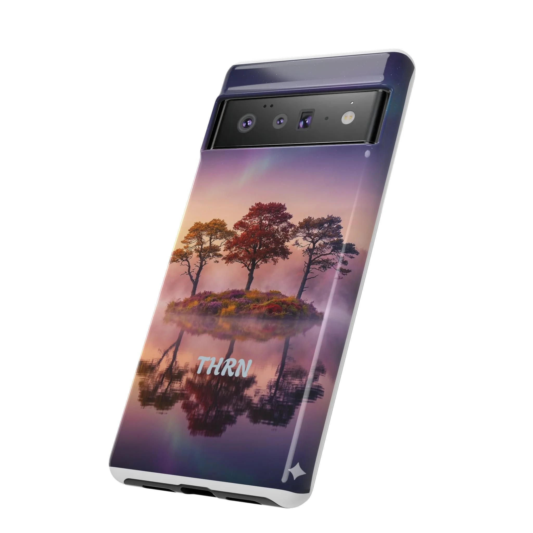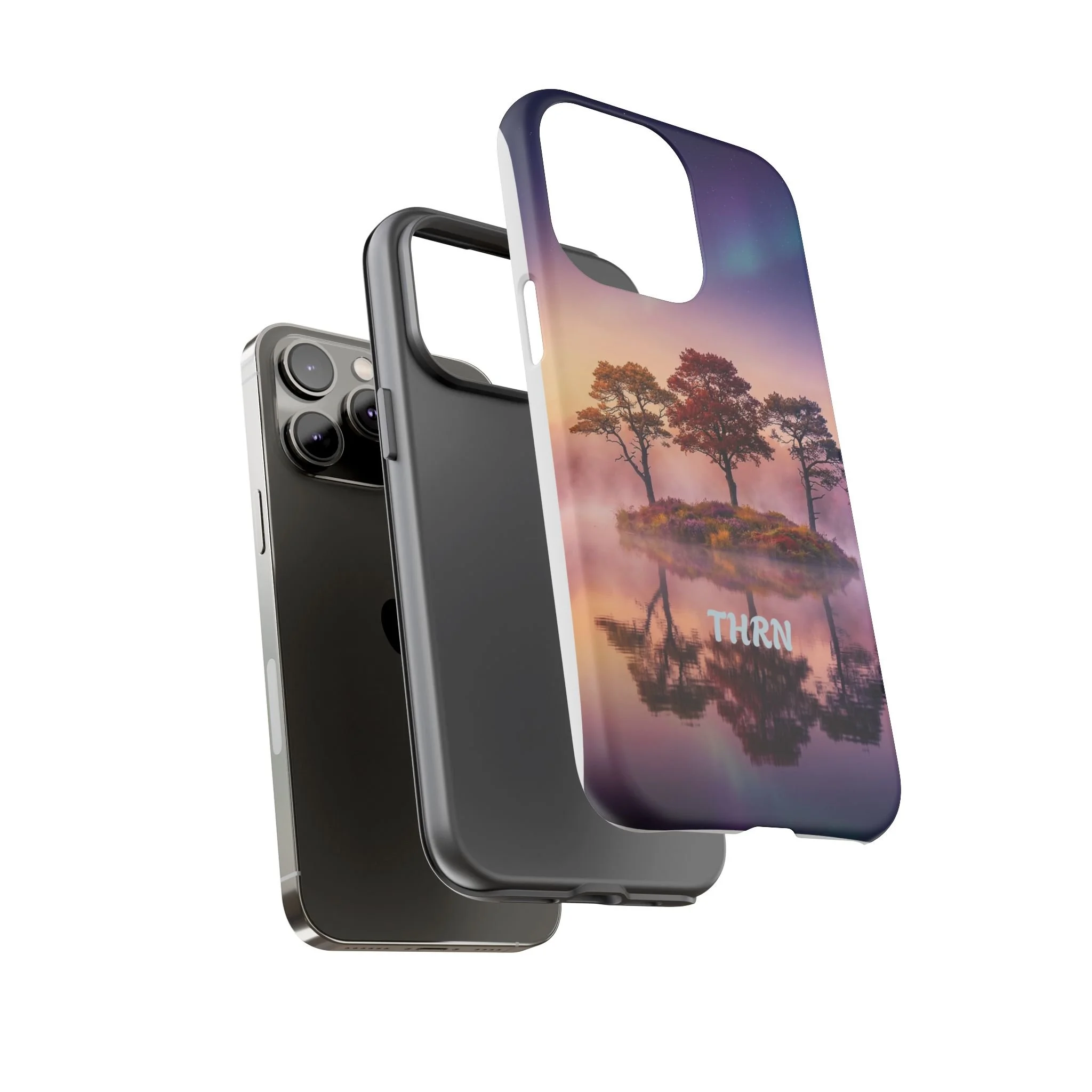 Slip your phone into a case that feels like a quiet moment at dusk. Soft purples and warm golds melt across a mirrored lake, with a tiny island of trees reflected perfectly beneath a sky that hints at northern lights. The slim dual-layer shell combines a glossy (or matte) printed exterior with a TPU silicone liner to absorb shock while keeping the scene vivid — even outdoors. It wears like a little landscape you can carry: calming, resilient, and made to protect the device that keeps you connected to the people and places you love.
