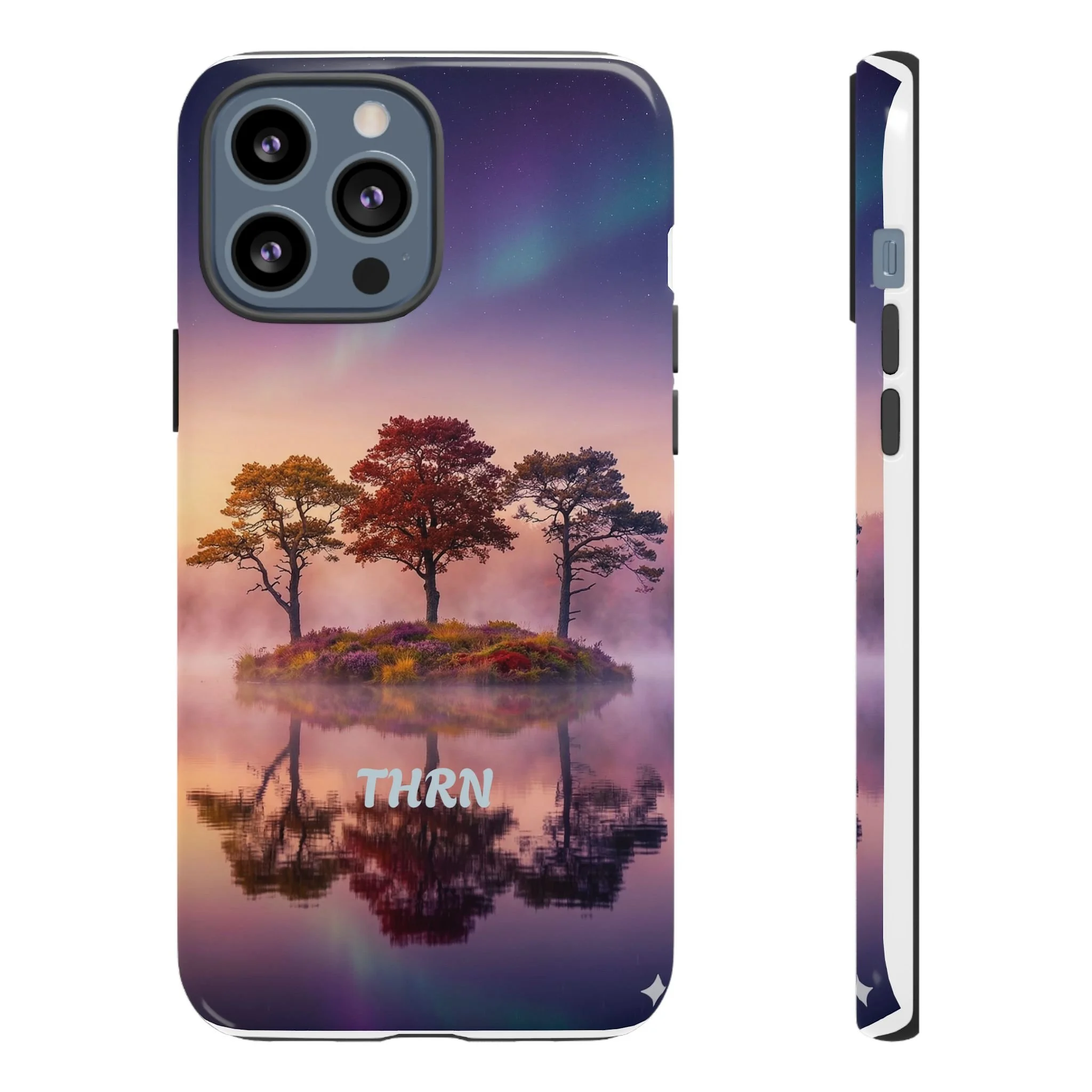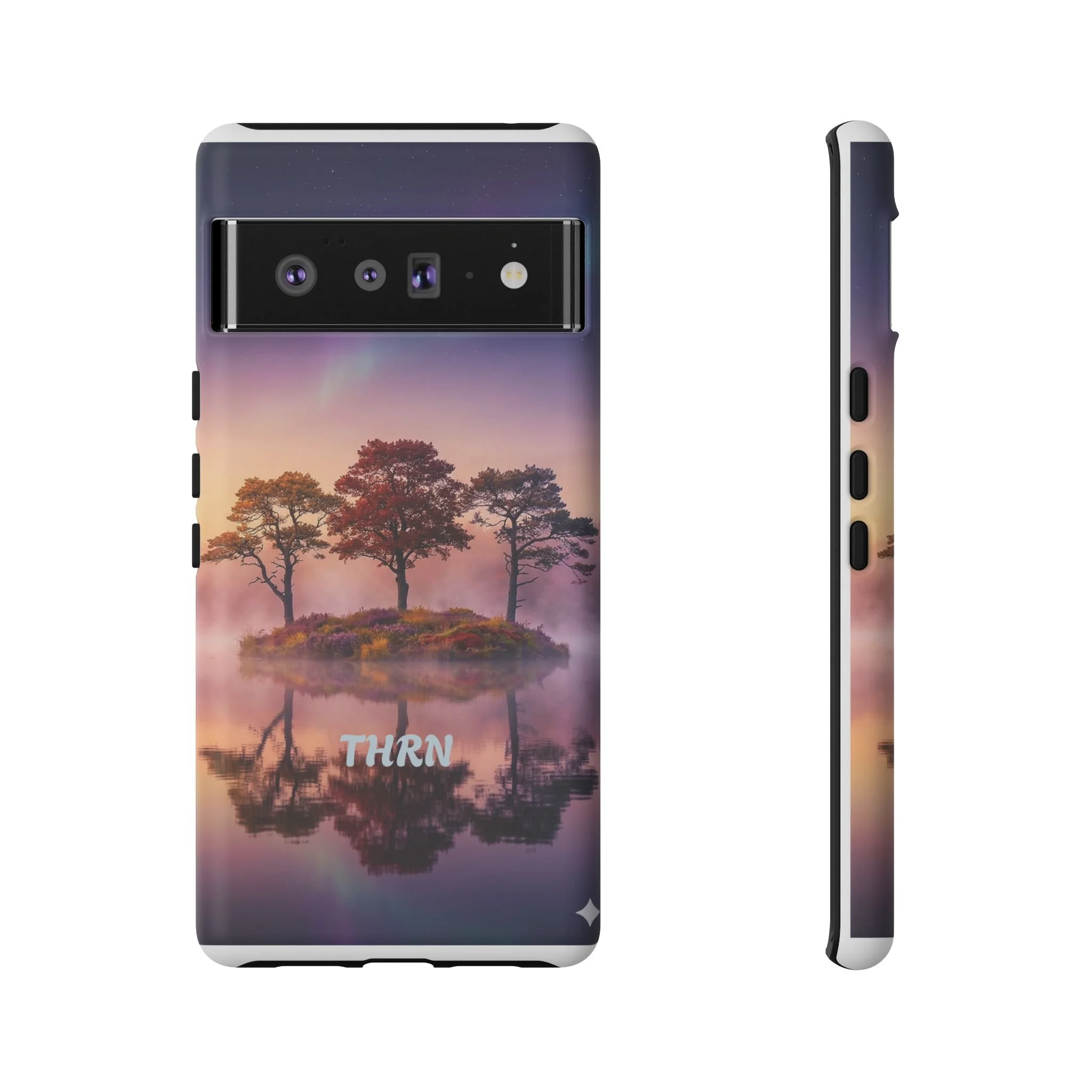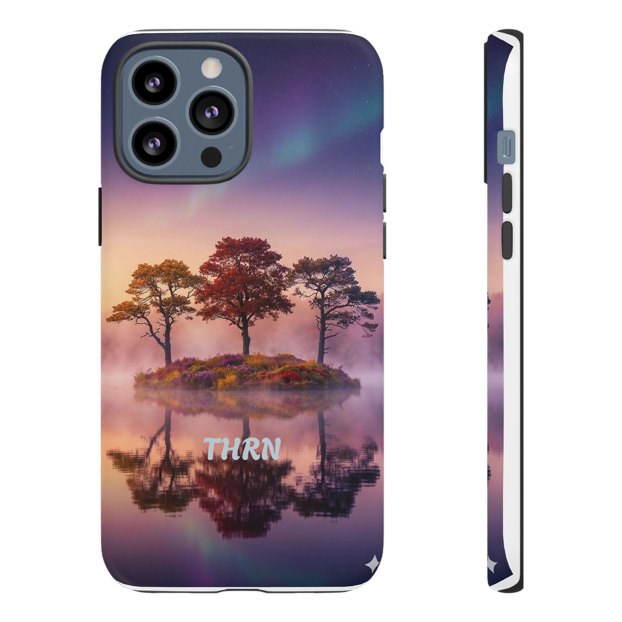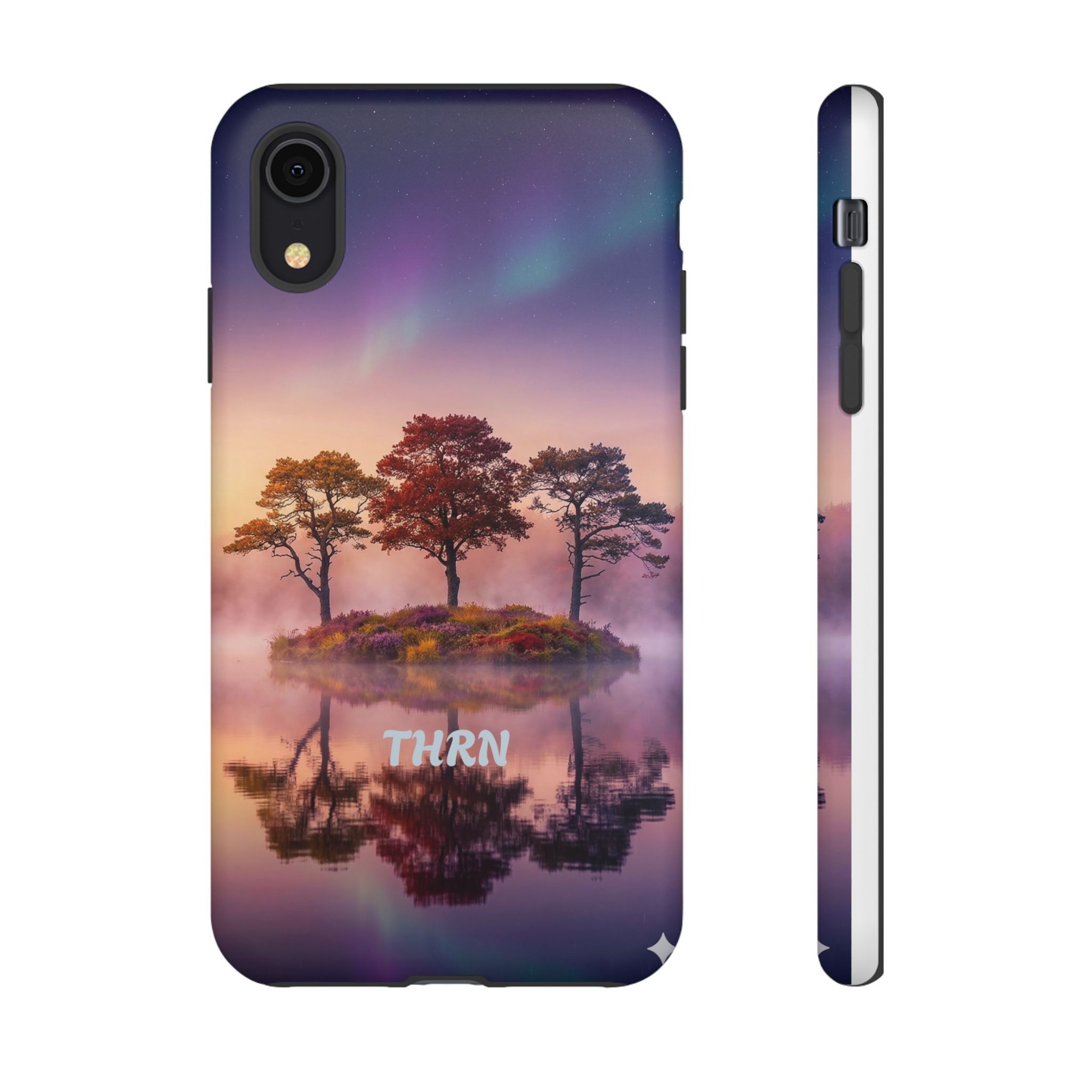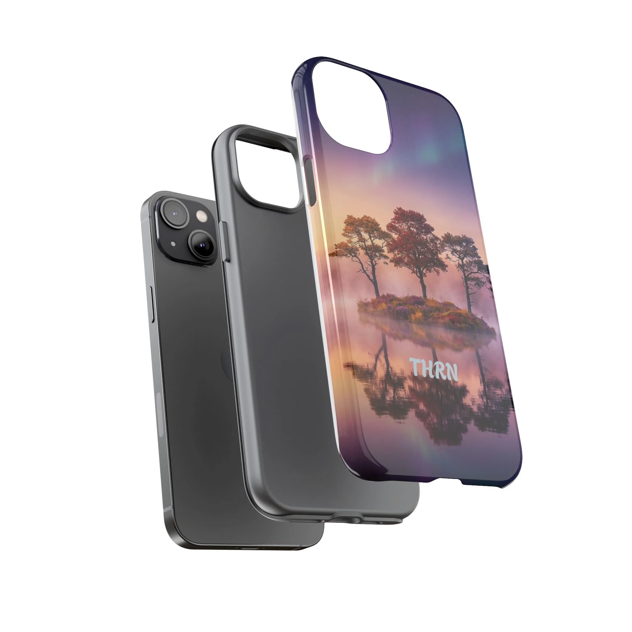 Slip your phone into a case that feels like a quiet moment at dusk. Soft purples and warm golds melt across a mirrored lake, with a tiny island of trees reflected perfectly beneath a sky that hints at northern lights. The slim dual-layer shell combines a glossy (or matte) printed exterior with a TPU silicone liner to absorb shock while keeping the scene vivid — even outdoors. It wears like a little landscape you can carry: calming, resilient, and made to protect the device that keeps you connected to the people and places you love.