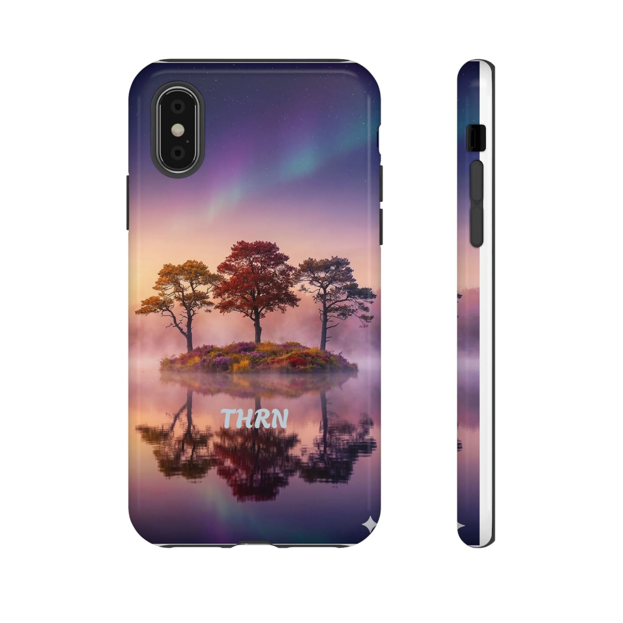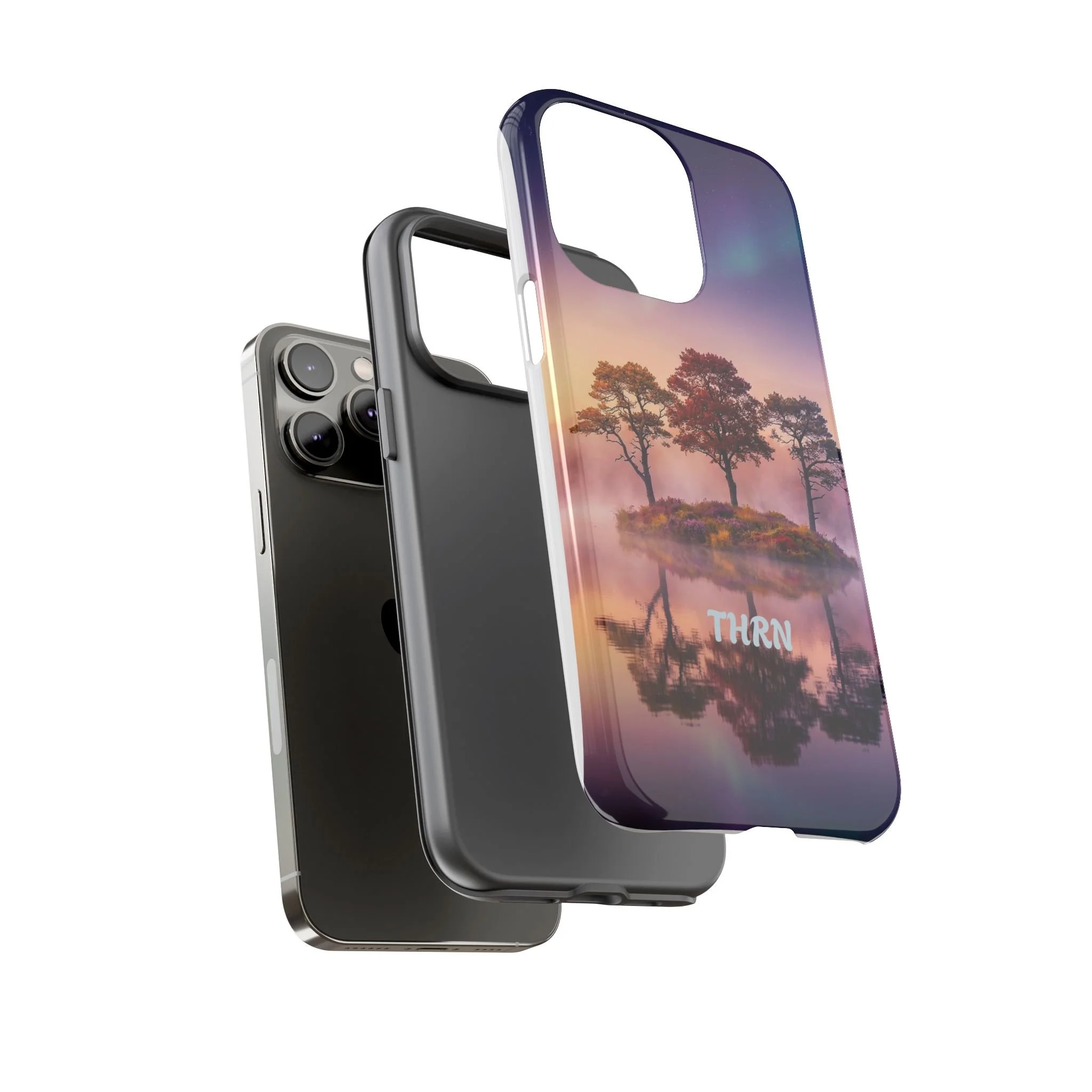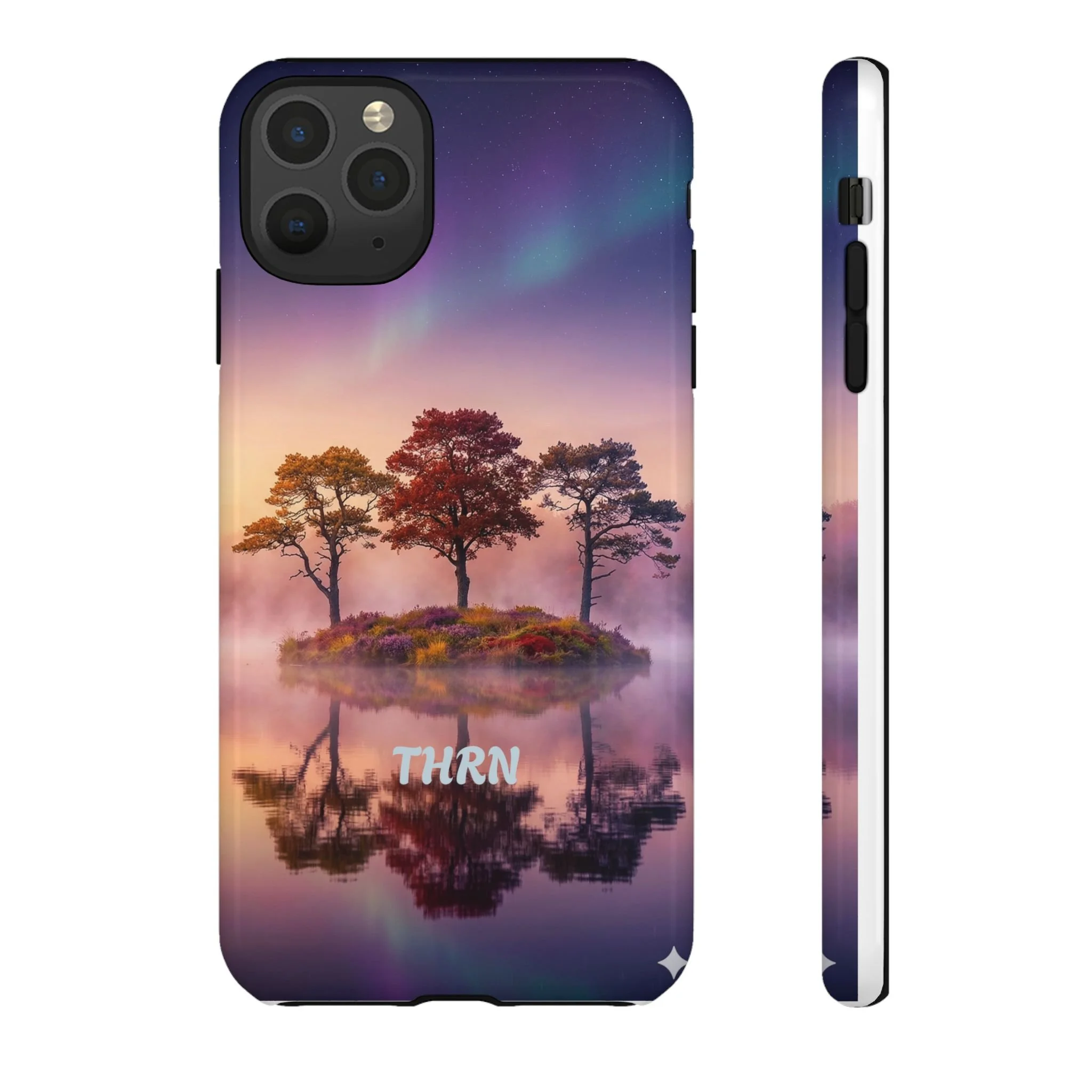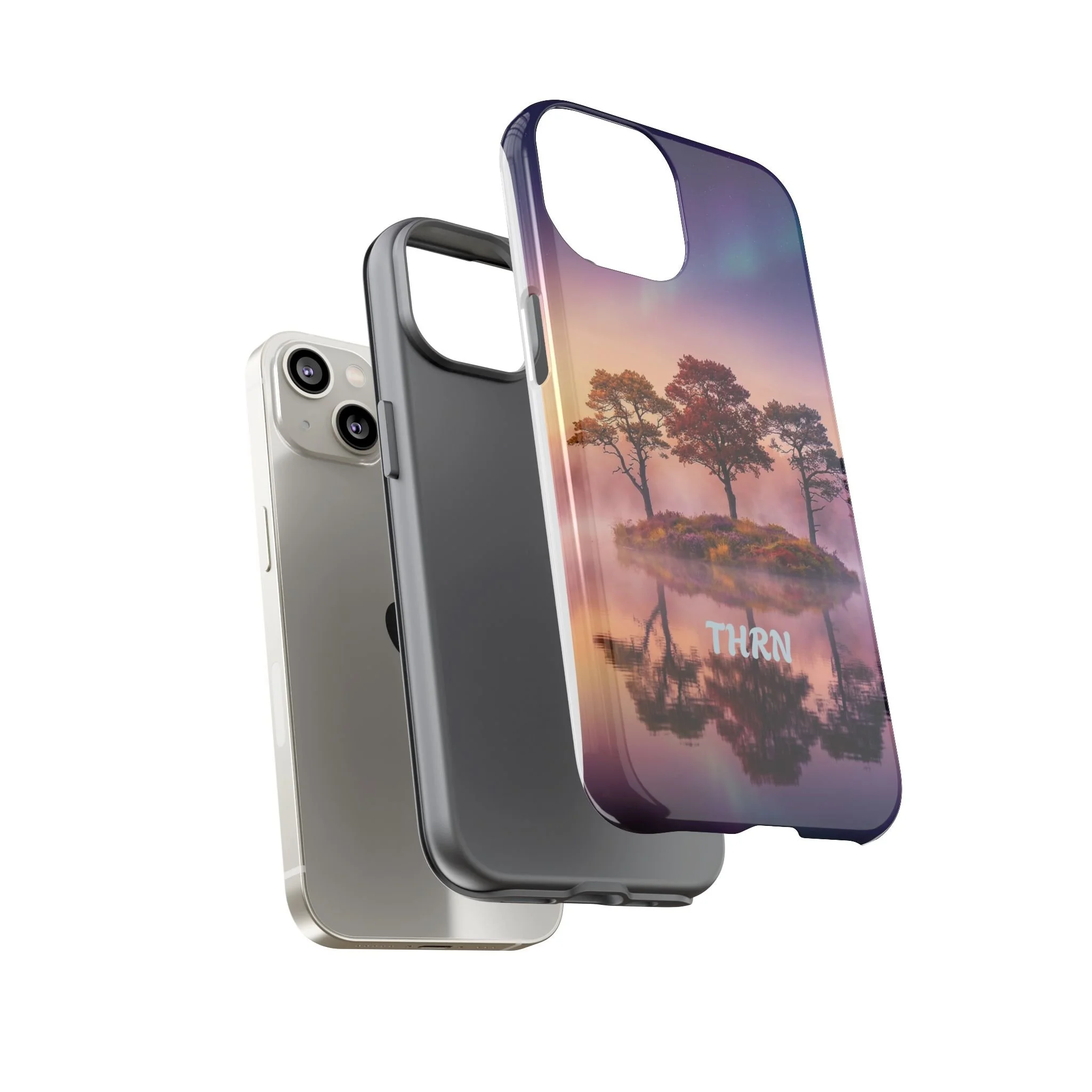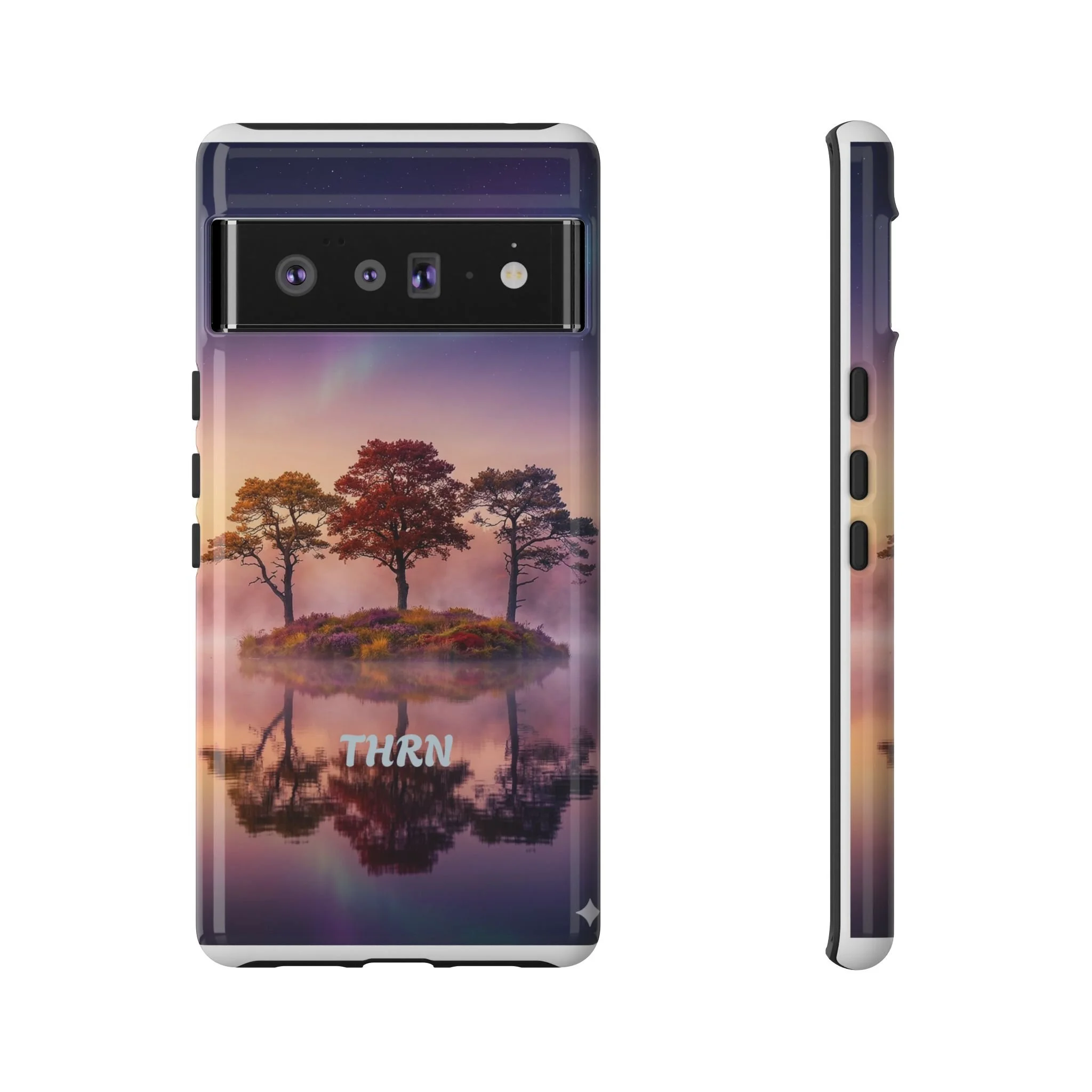 Slip your phone into a case that feels like a quiet moment at dusk. Soft purples and warm golds melt across a mirrored lake, with a tiny island of trees reflected perfectly beneath a sky that hints at northern lights. The slim dual-layer shell combines a glossy (or matte) printed exterior with a TPU silicone liner to absorb shock while keeping the scene vivid — even outdoors. It wears like a little landscape you can carry: calming, resilient, and made to protect the device that keeps you connected to the people and places you love.