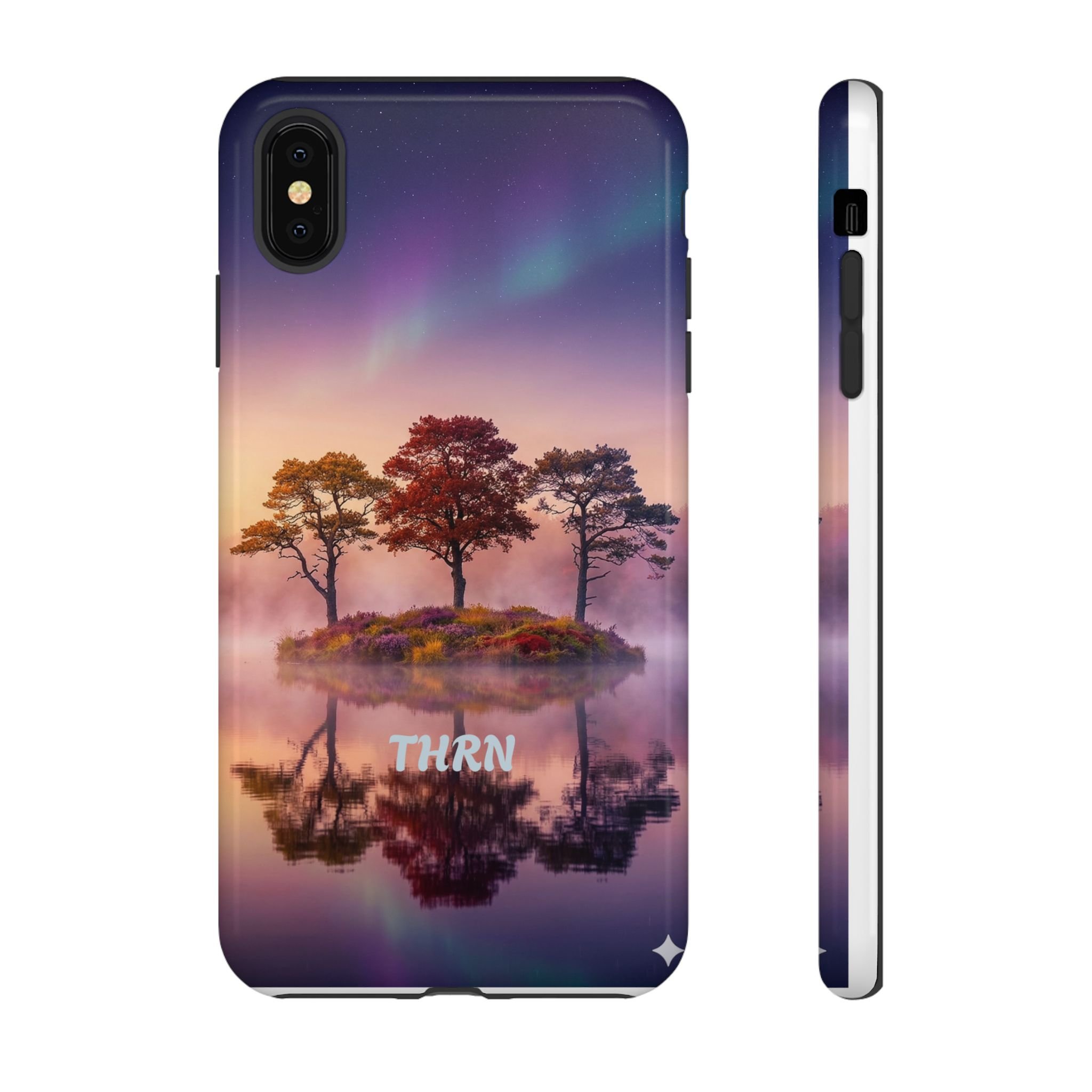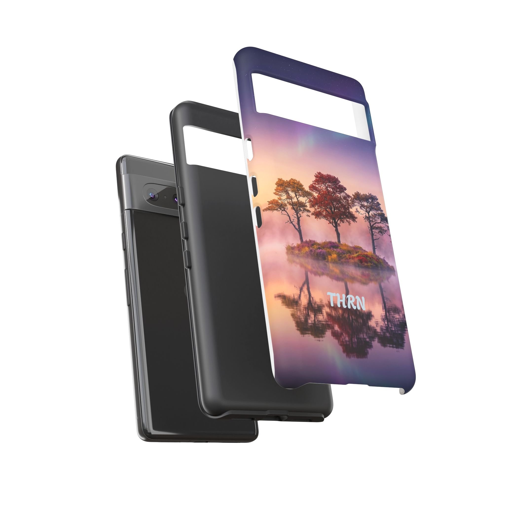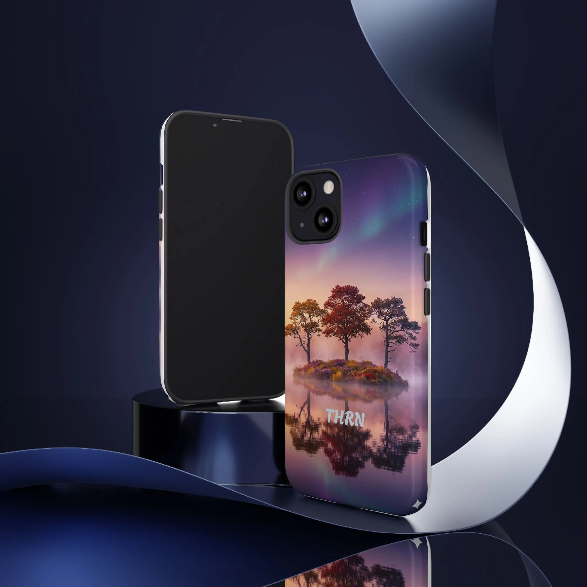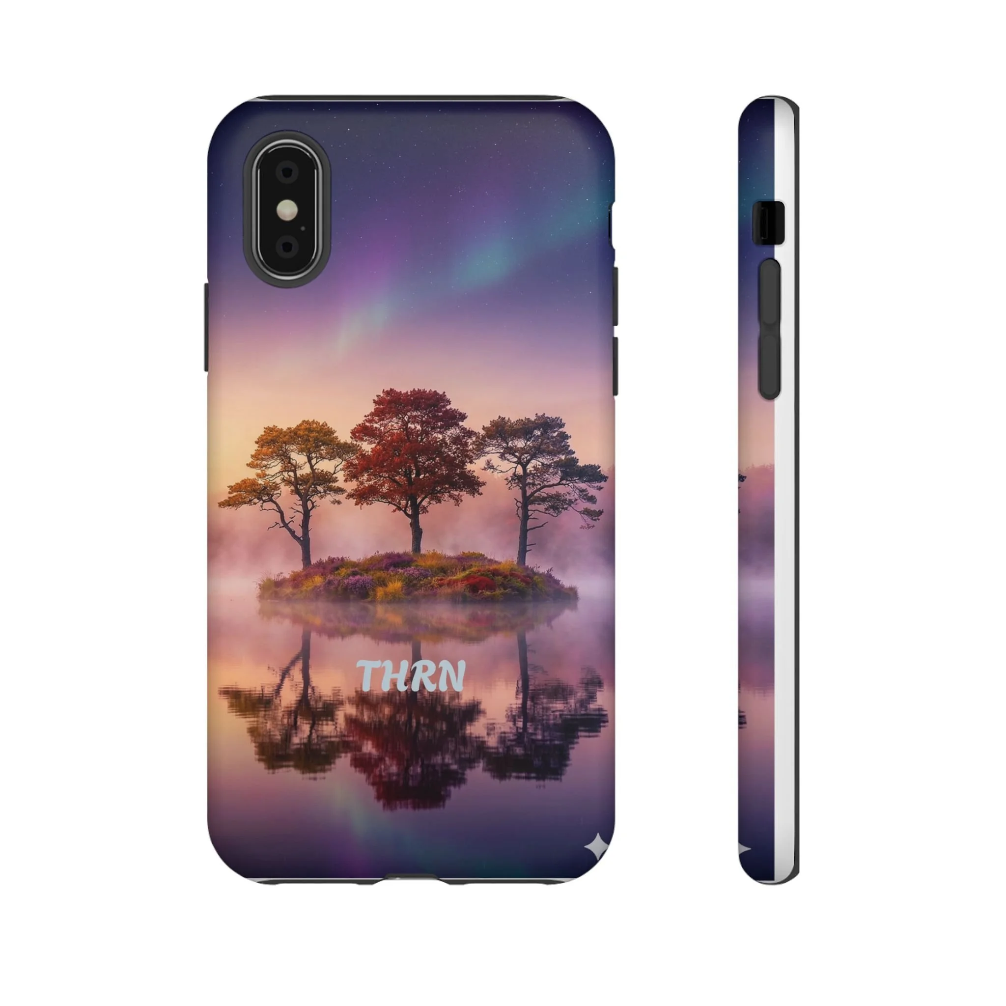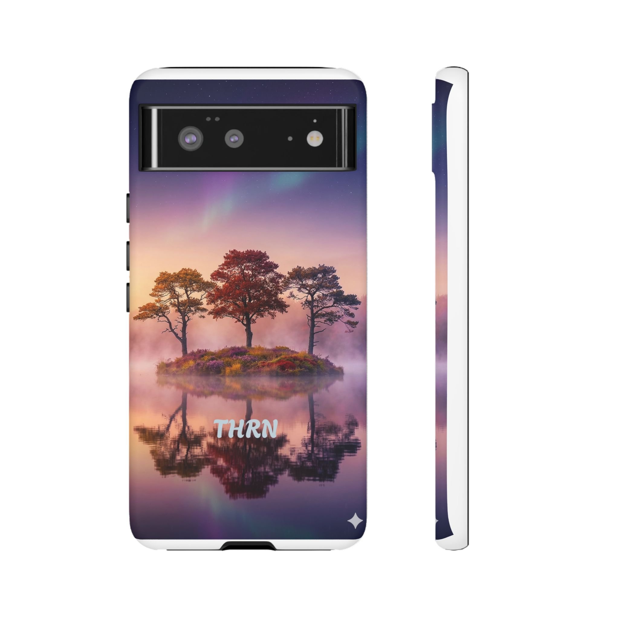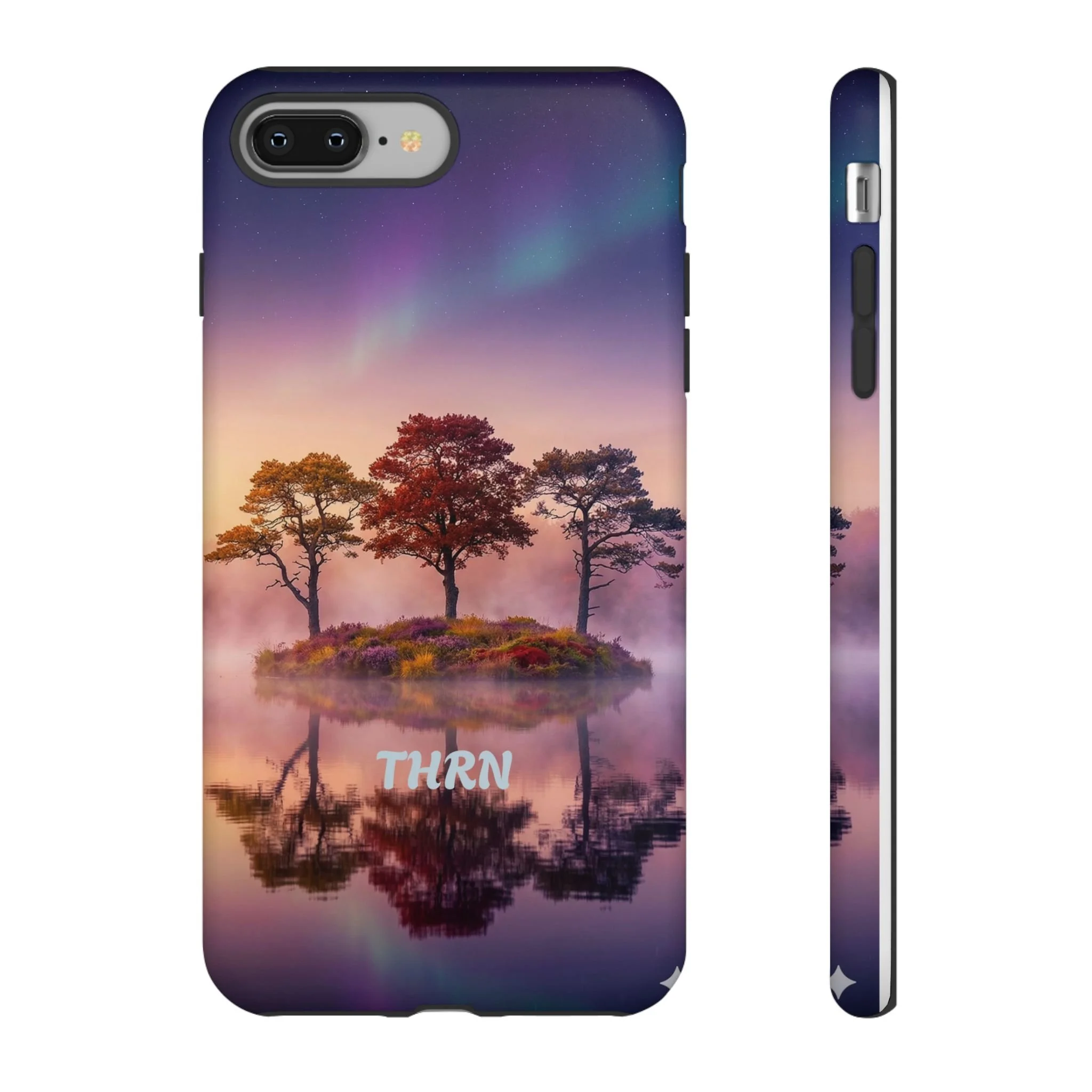 Slip your phone into a case that feels like a quiet moment at dusk. Soft purples and warm golds melt across a mirrored lake, with a tiny island of trees reflected perfectly beneath a sky that hints at northern lights. The slim dual-layer shell combines a glossy (or matte) printed exterior with a TPU silicone liner to absorb shock while keeping the scene vivid — even outdoors. It wears like a little landscape you can carry: calming, resilient, and made to protect the device that keeps you connected to the people and places you love.