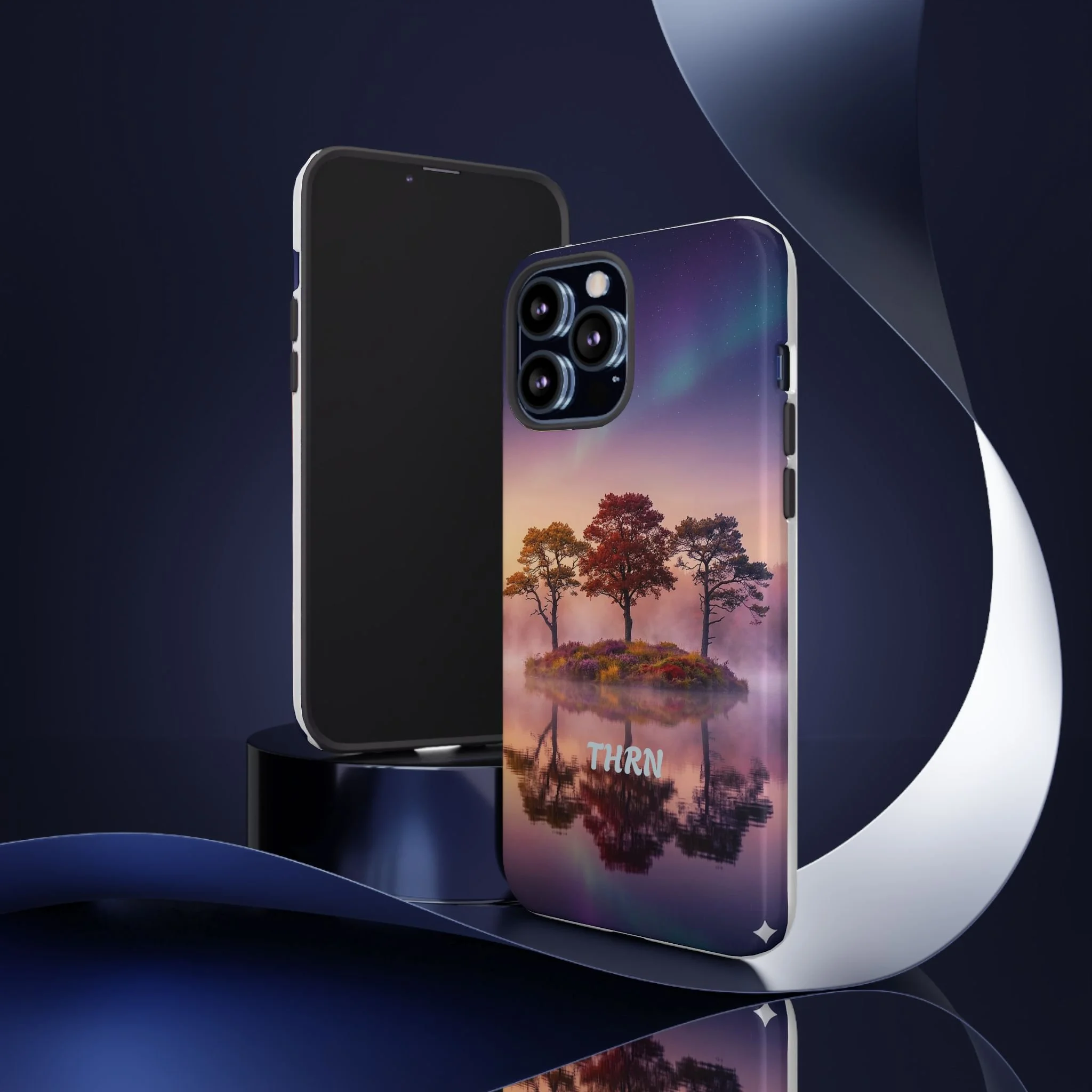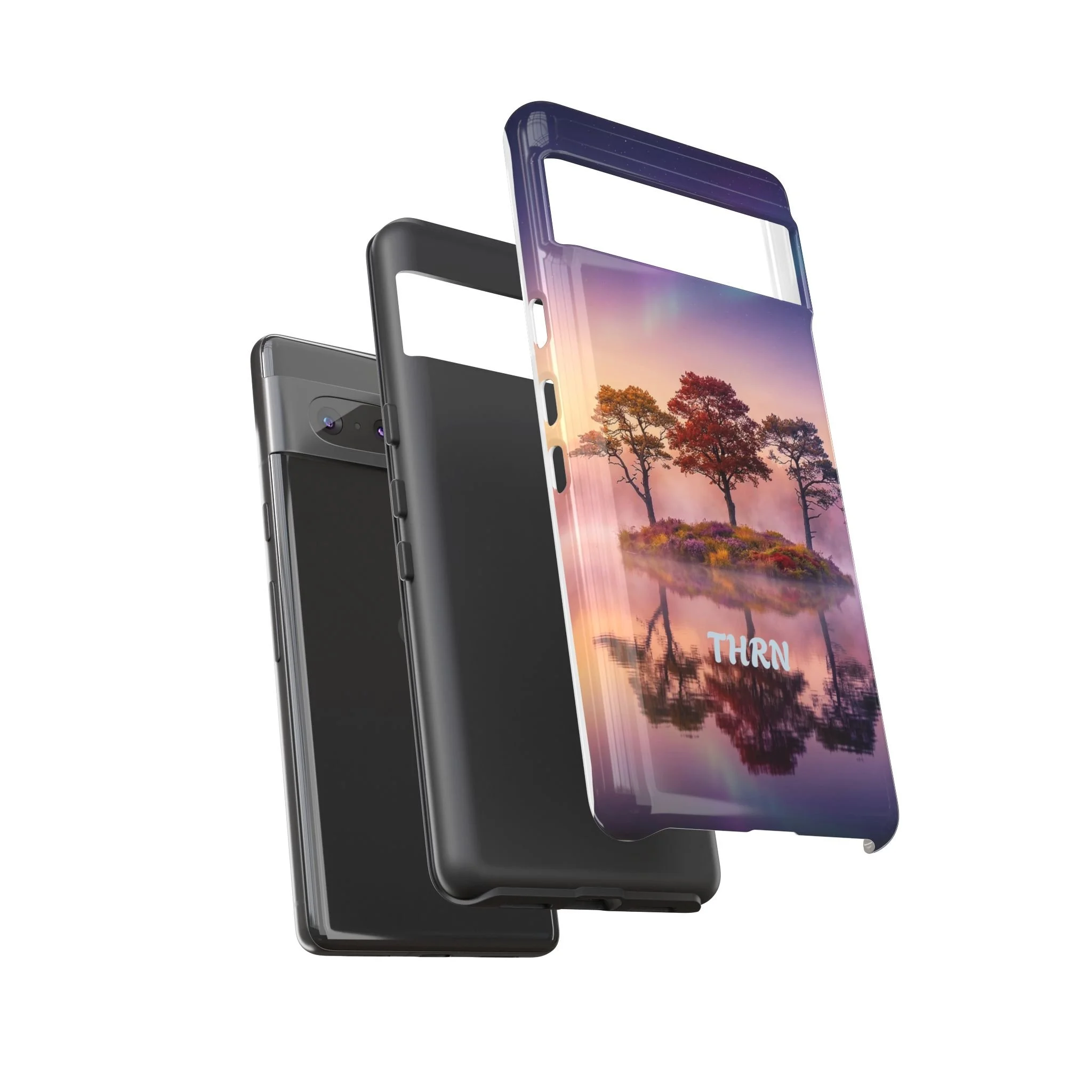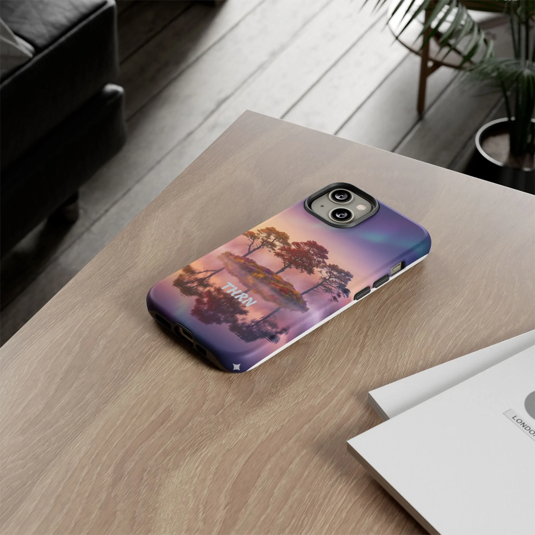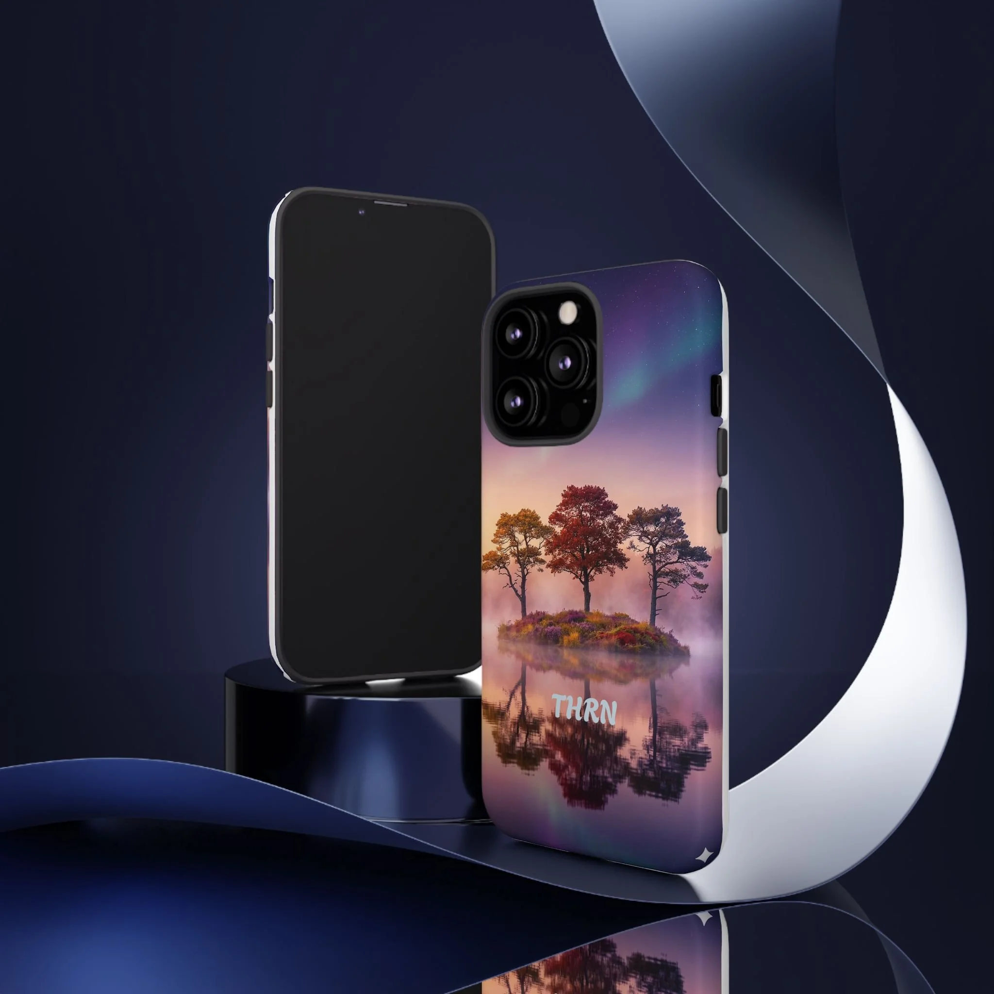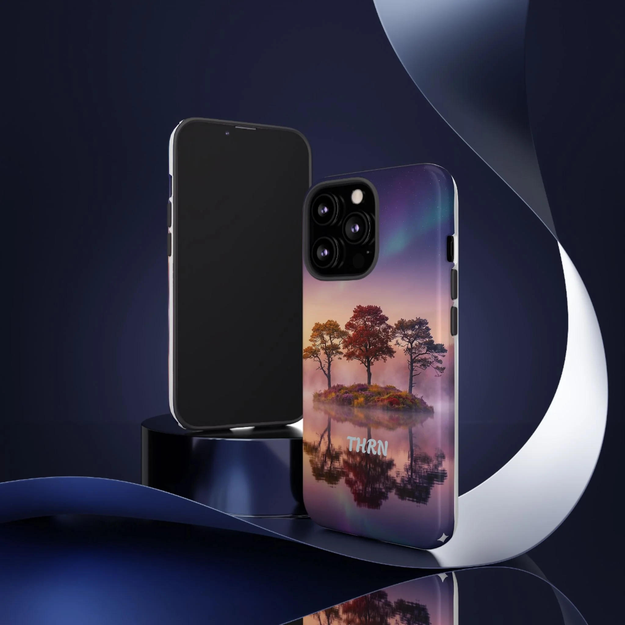 Slip your phone into a case that feels like a quiet moment at dusk. Soft purples and warm golds melt across a mirrored lake, with a tiny island of trees reflected perfectly beneath a sky that hints at northern lights. The slim dual-layer shell combines a glossy (or matte) printed exterior with a TPU silicone liner to absorb shock while keeping the scene vivid — even outdoors. It wears like a little landscape you can carry: calming, resilient, and made to protect the device that keeps you connected to the people and places you love.