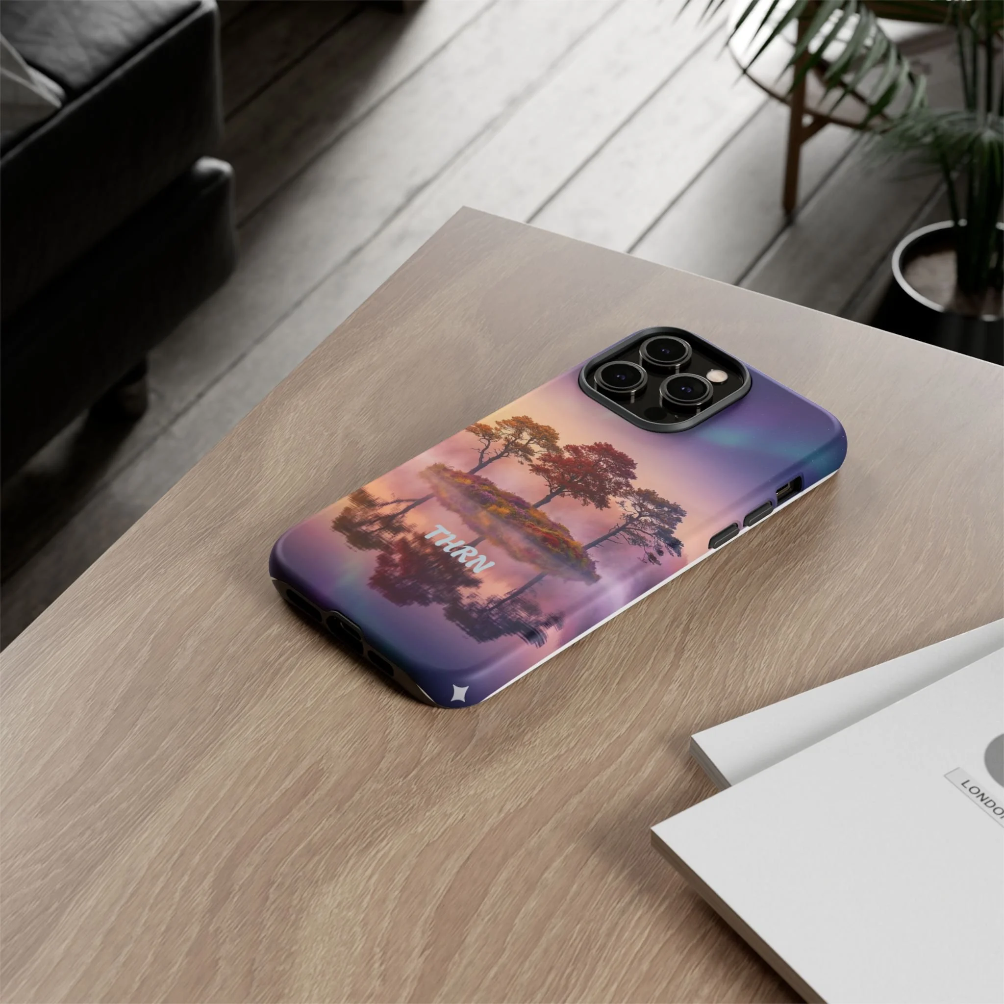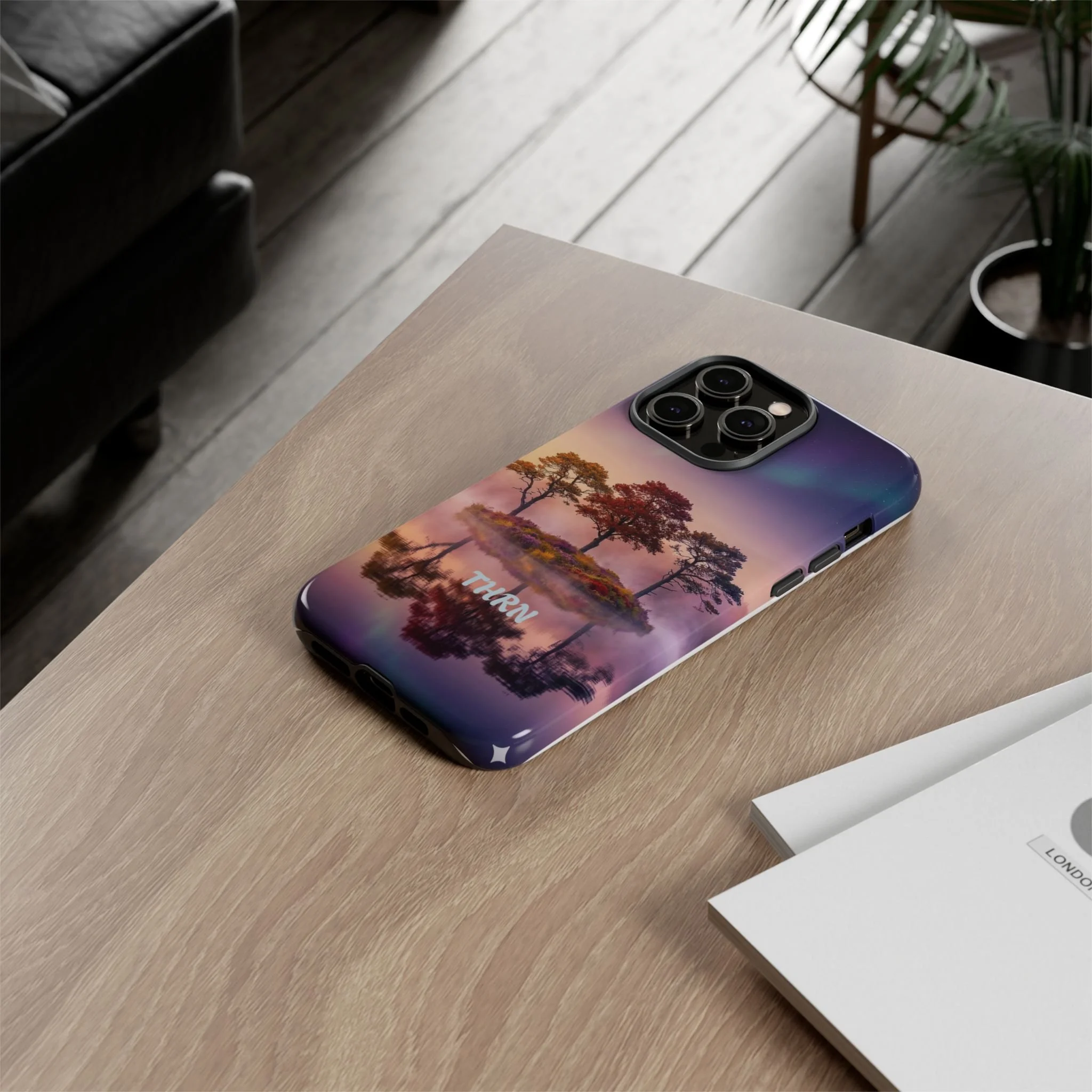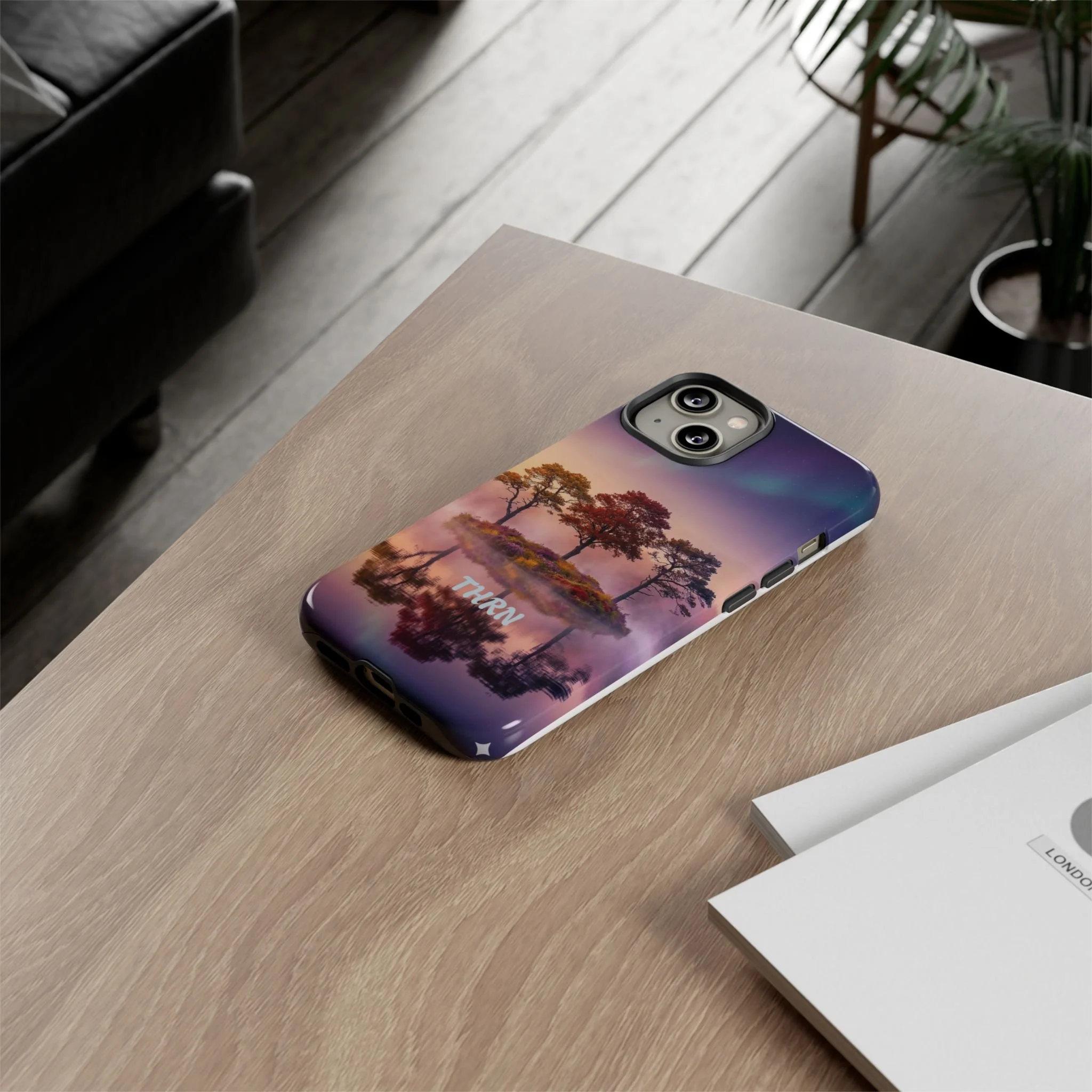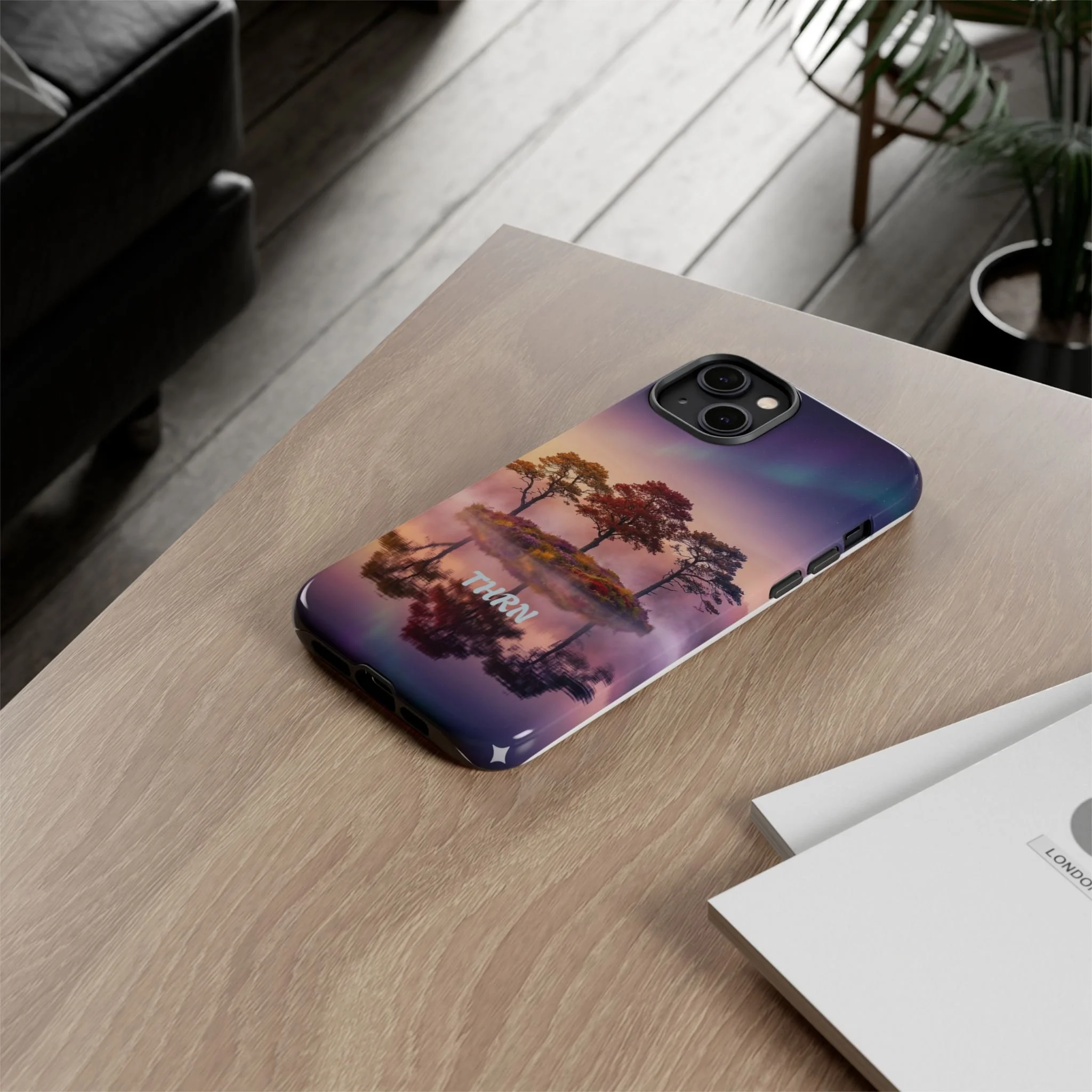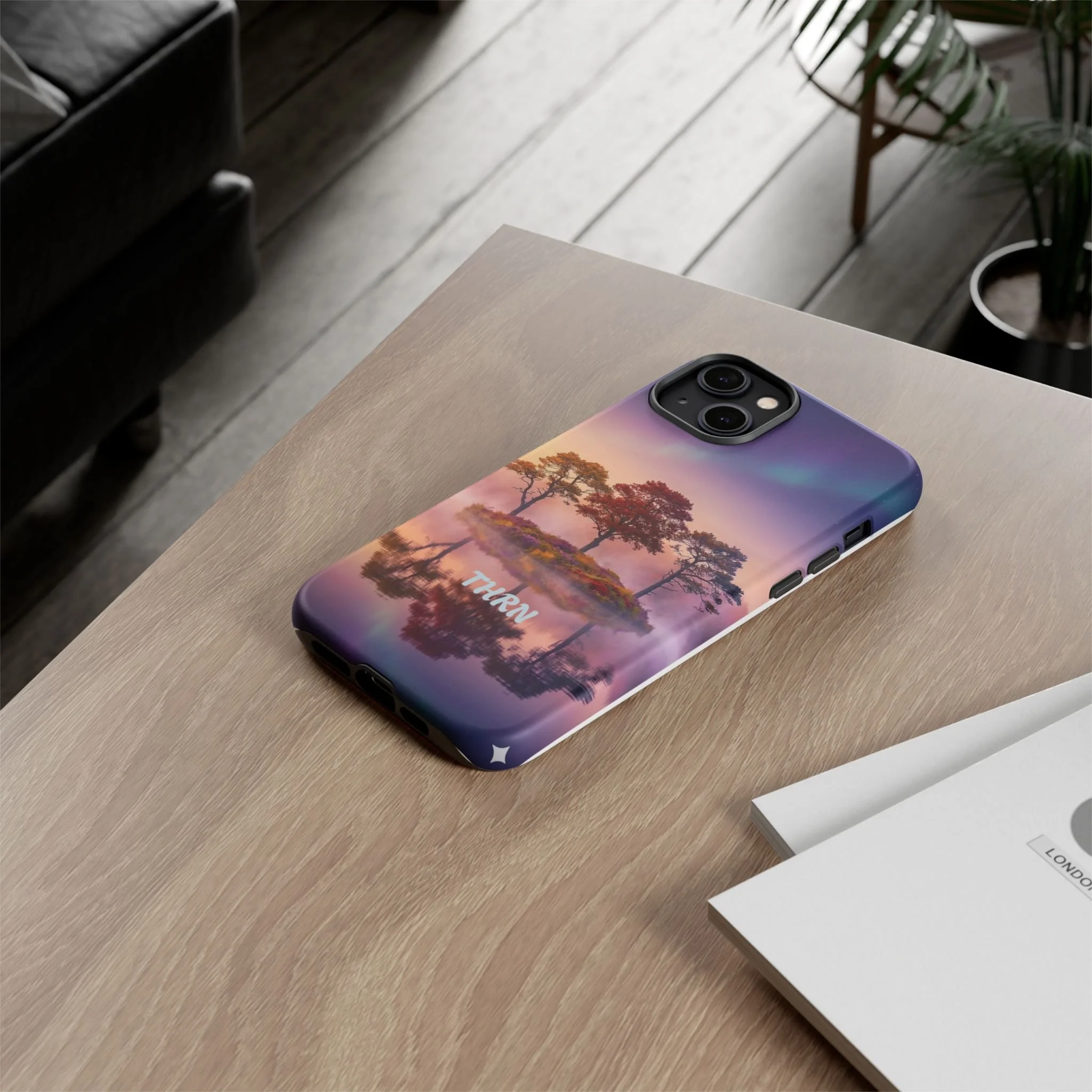 Slip your phone into a case that feels like a quiet moment at dusk. Soft purples and warm golds melt across a mirrored lake, with a tiny island of trees reflected perfectly beneath a sky that hints at northern lights. The slim dual-layer shell combines a glossy (or matte) printed exterior with a TPU silicone liner to absorb shock while keeping the scene vivid — even outdoors. It wears like a little landscape you can carry: calming, resilient, and made to protect the device that keeps you connected to the people and places you love.