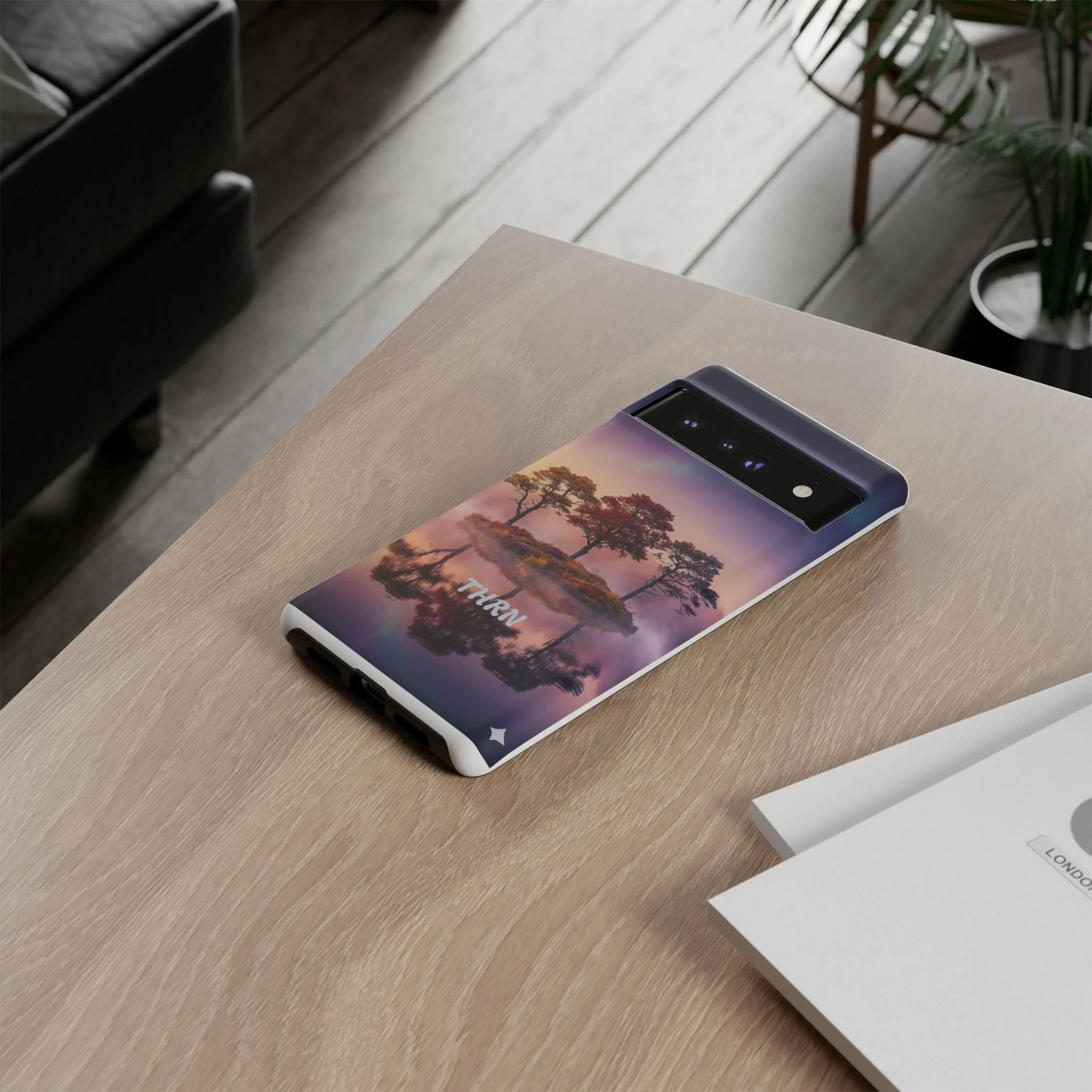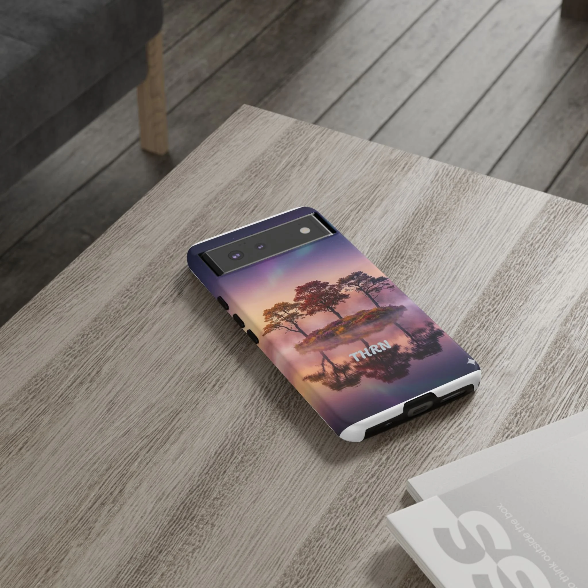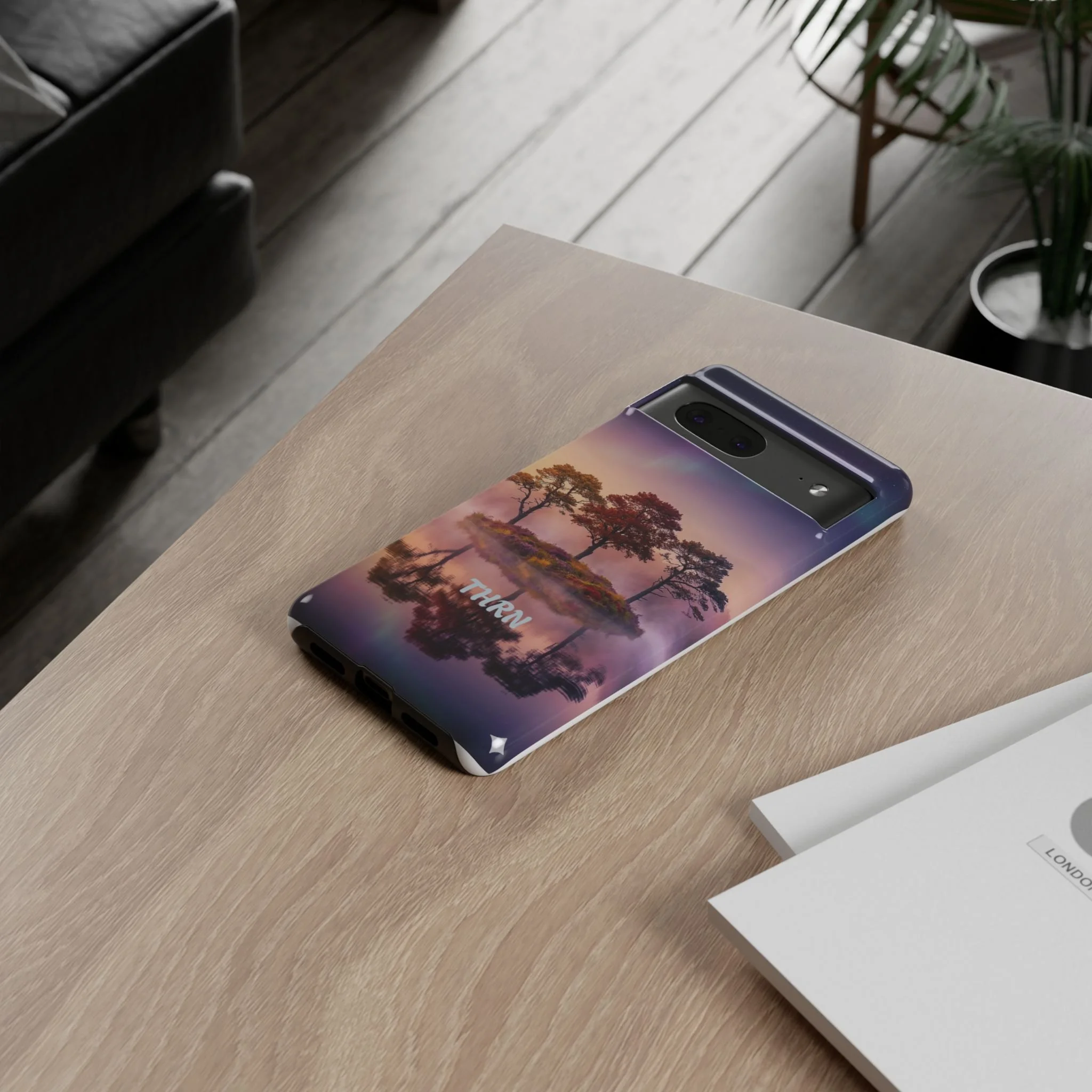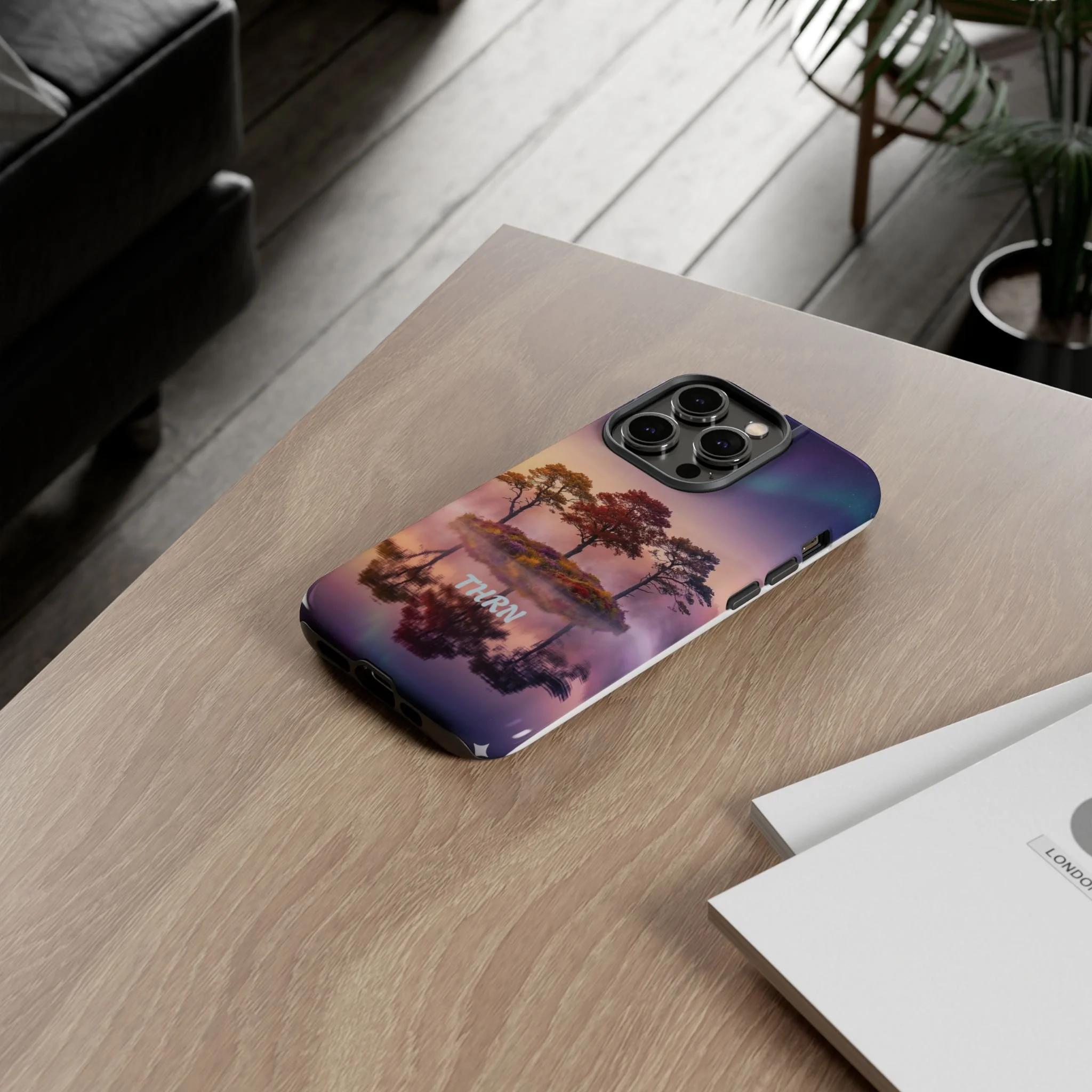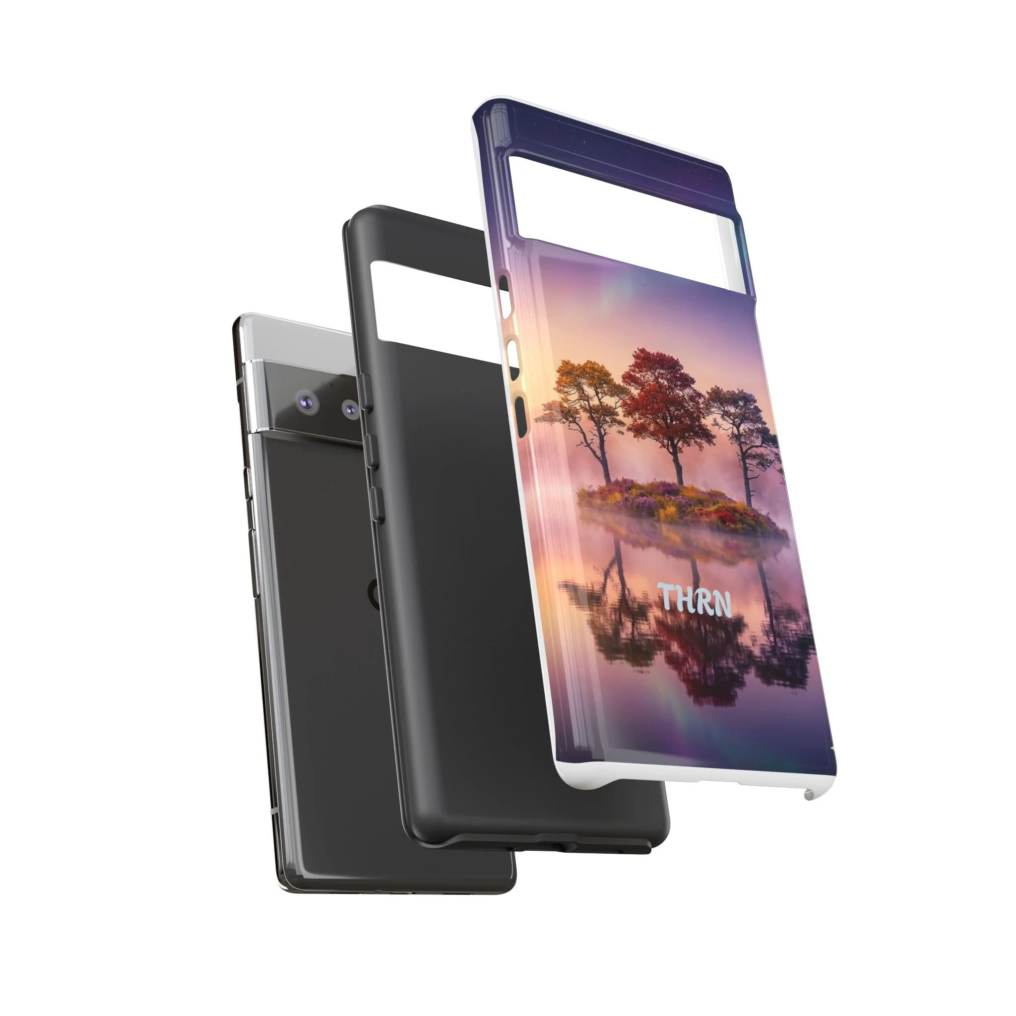 Slip your phone into a case that feels like a quiet moment at dusk. Soft purples and warm golds melt across a mirrored lake, with a tiny island of trees reflected perfectly beneath a sky that hints at northern lights. The slim dual-layer shell combines a glossy (or matte) printed exterior with a TPU silicone liner to absorb shock while keeping the scene vivid — even outdoors. It wears like a little landscape you can carry: calming, resilient, and made to protect the device that keeps you connected to the people and places you love.