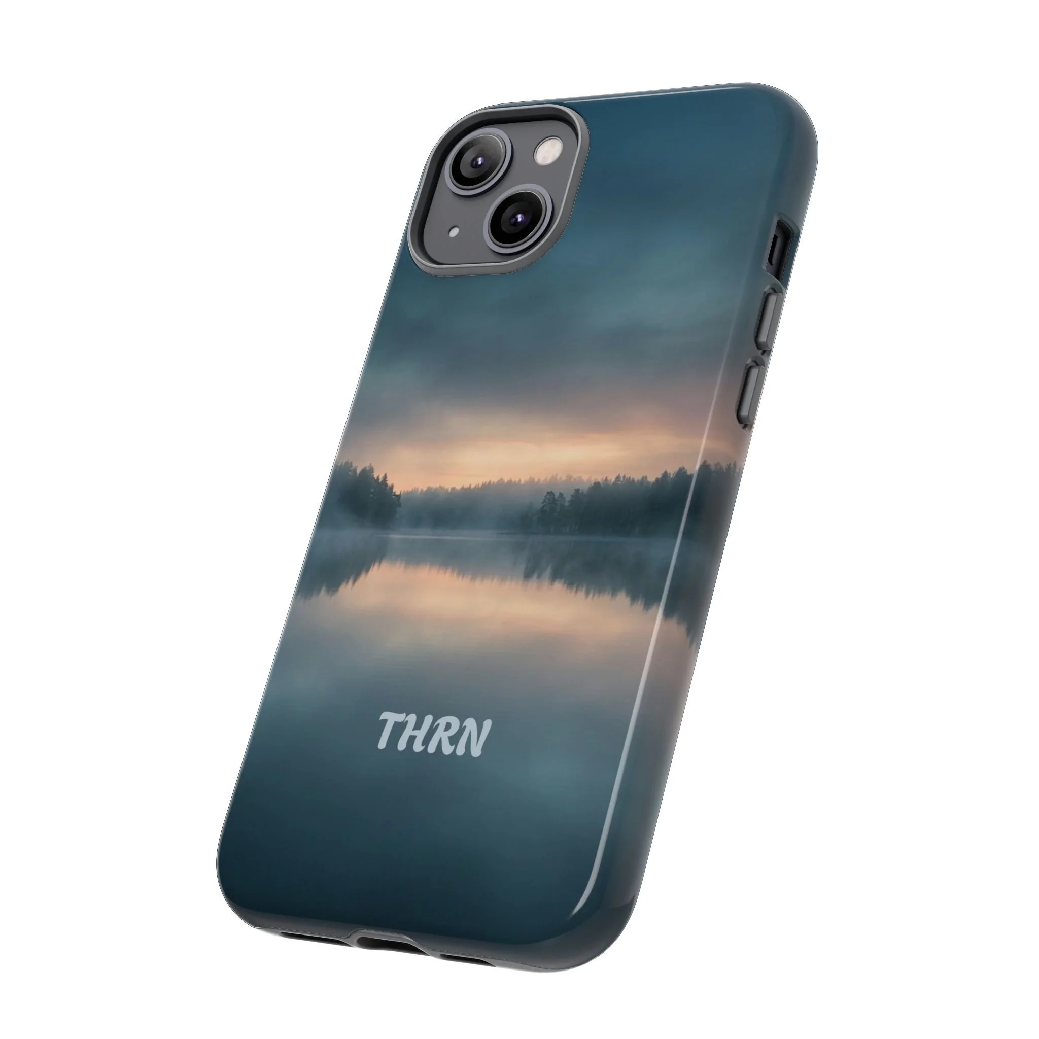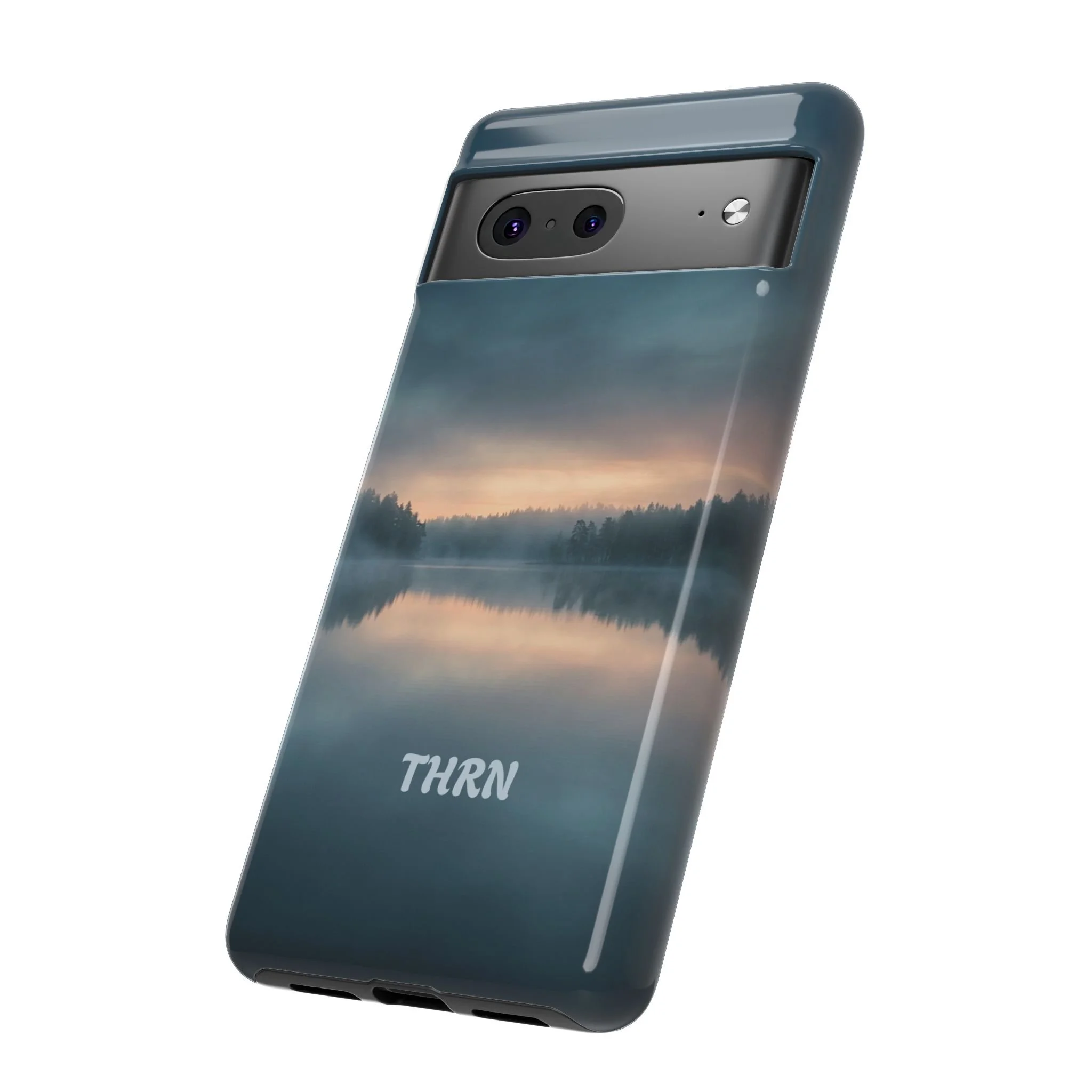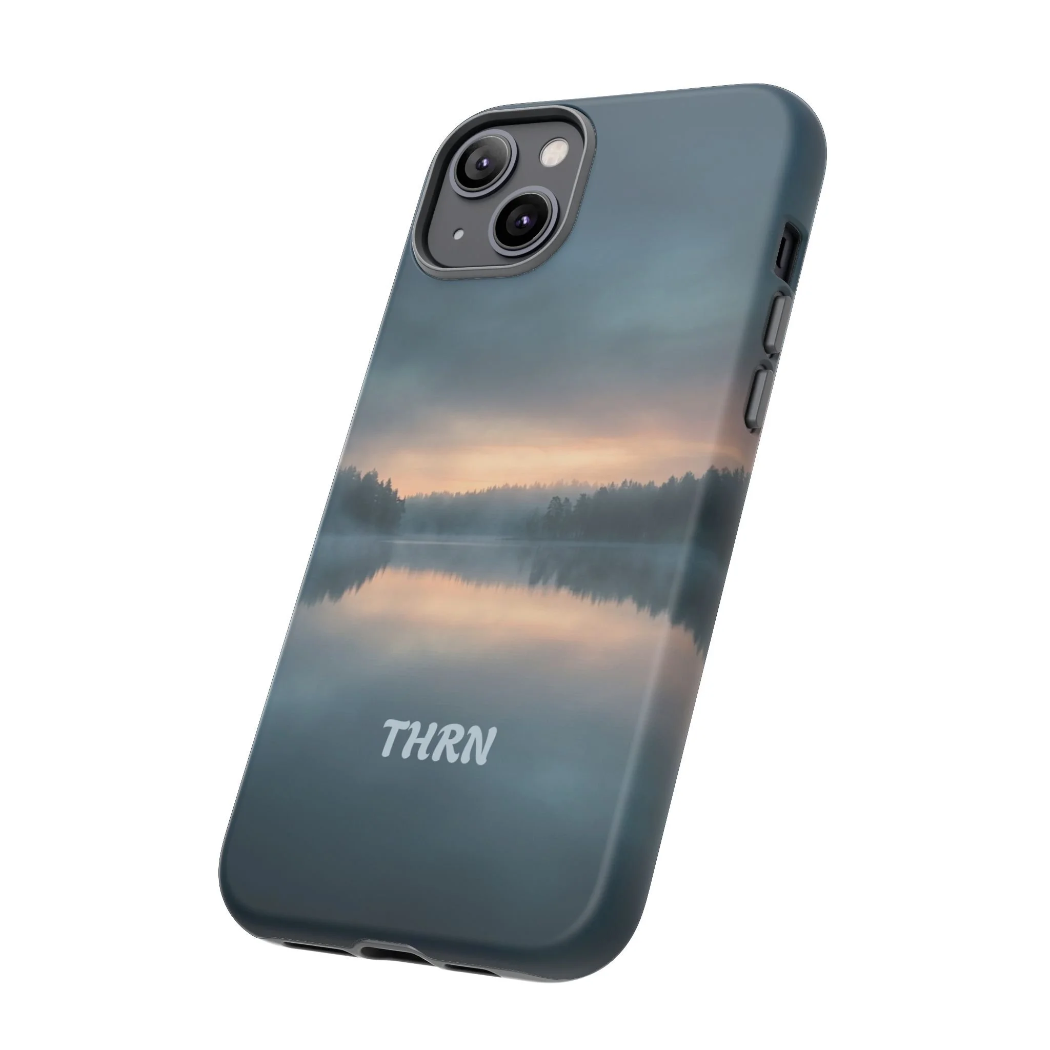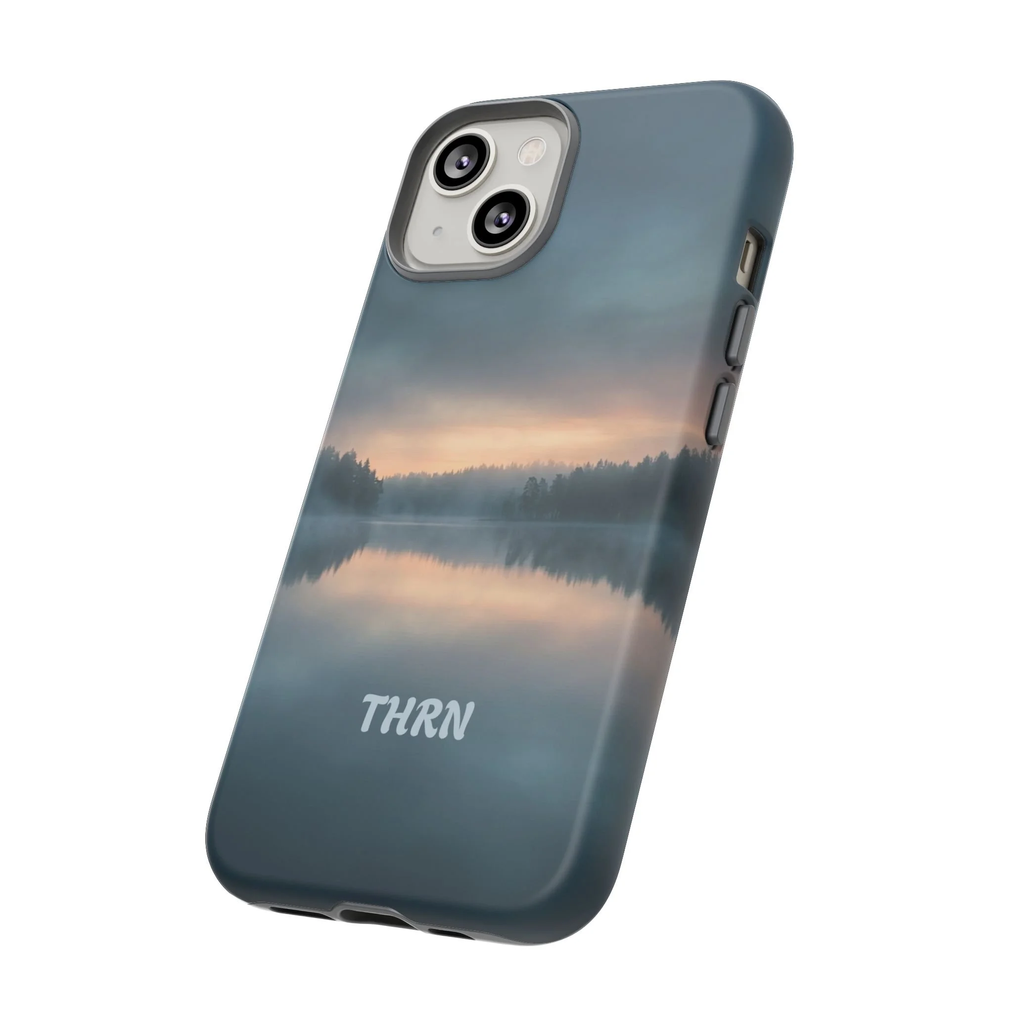 A protective phone case that pairs rugged defense with quiet, lakeside calm. The scene wraps edge-to-edge: a misty horizon and soft sunrise reflected on still water in deep blue-gray tones. Dual-layer construction (polycarbonate shell + TPU liner) cushions drops while a glossy or matte print preserves the photograph-like image. Slim enough for everyday carry, with clear port access and wireless-charging compatibility, it blends dependable protection with a meditative, outdoorsy aesthetic that slips easily into a commuter bag or the back pocket of a jacket.
