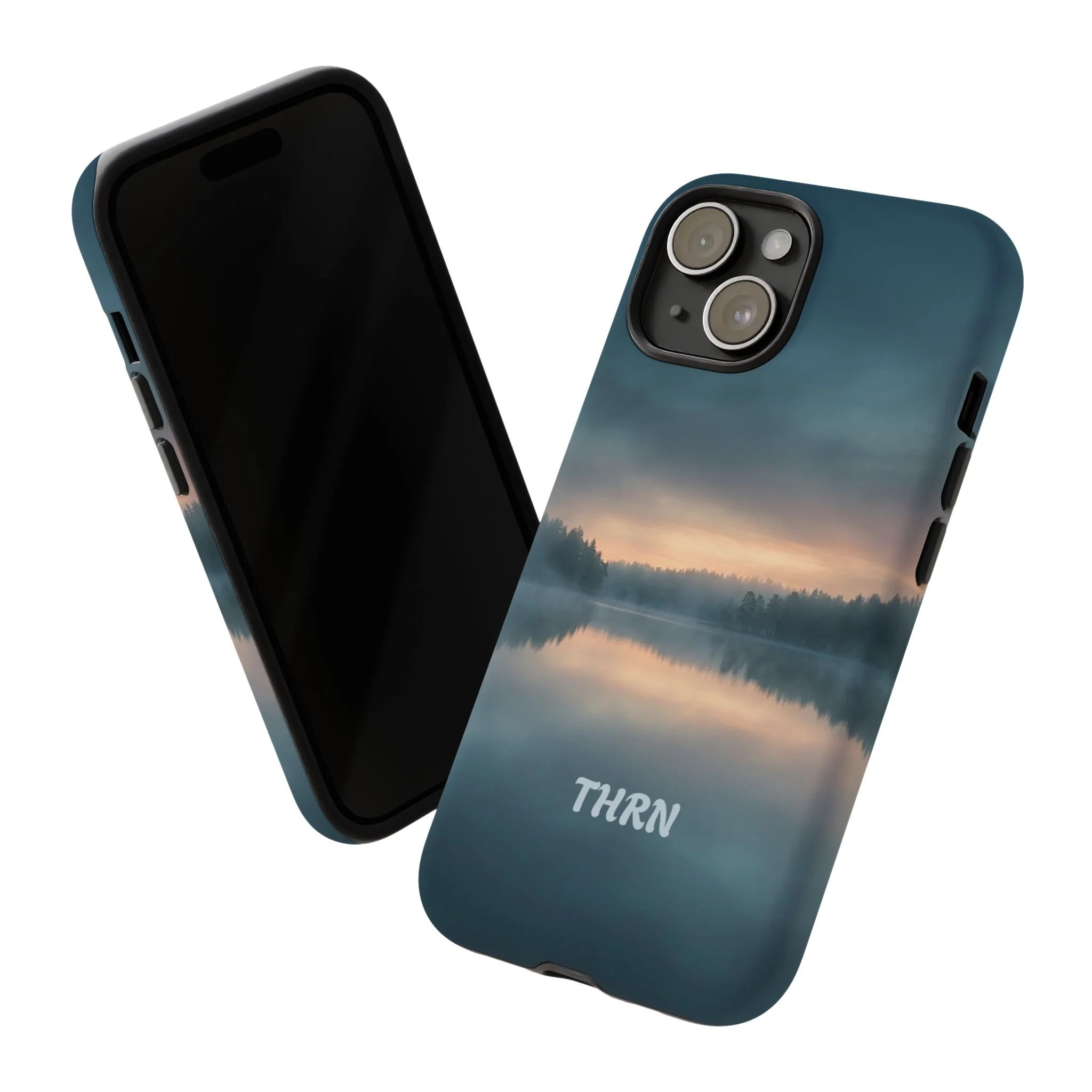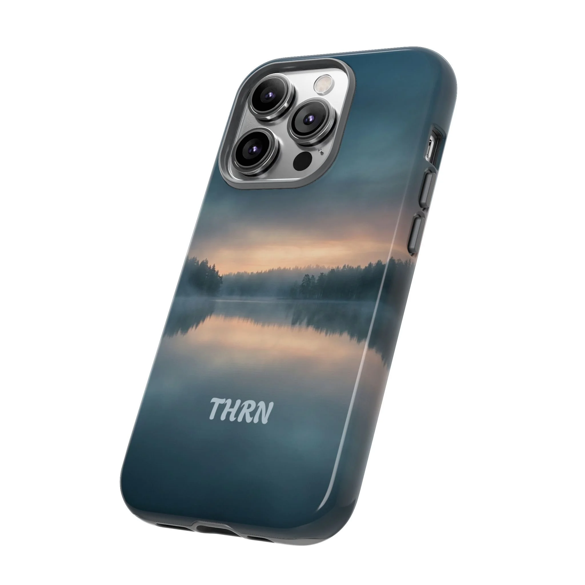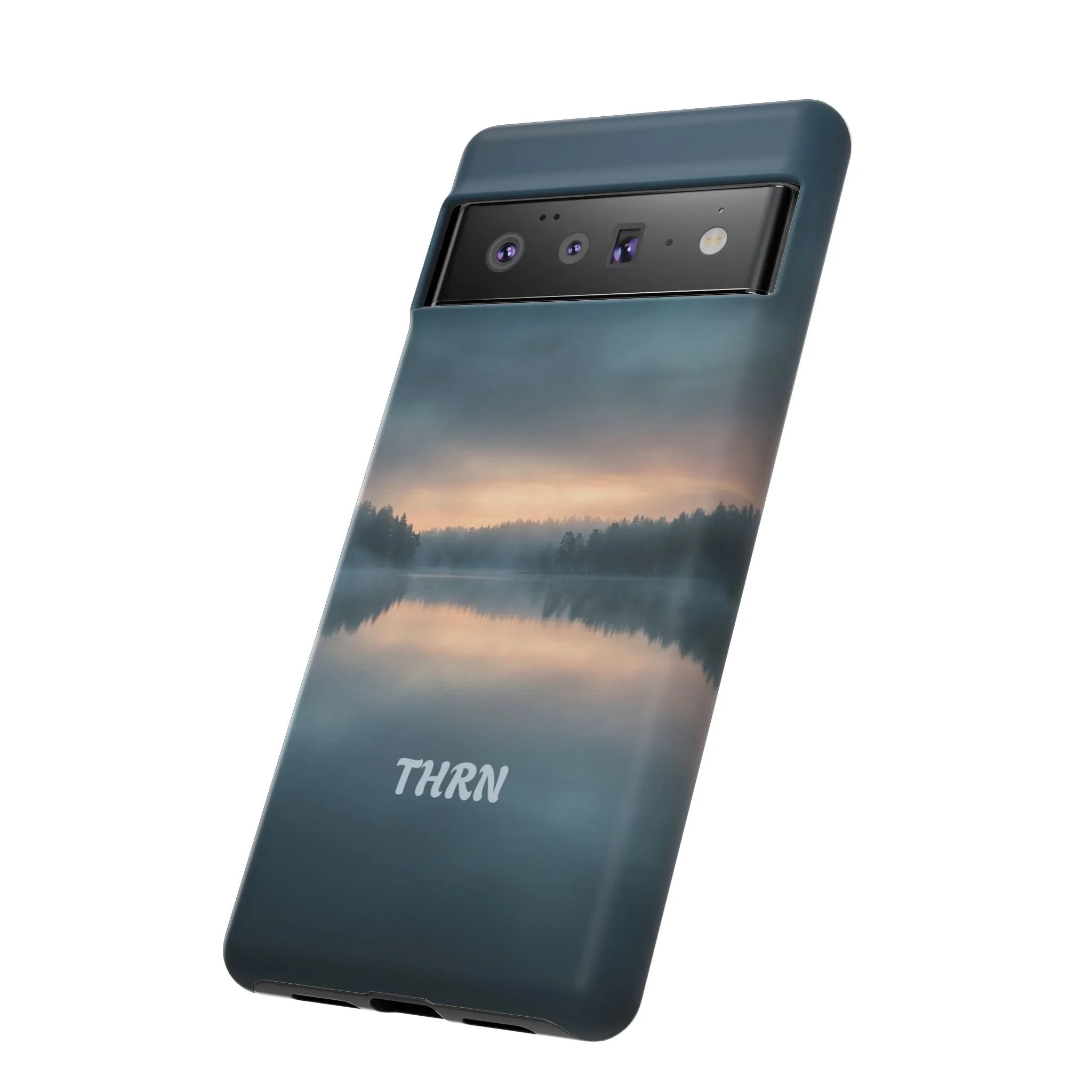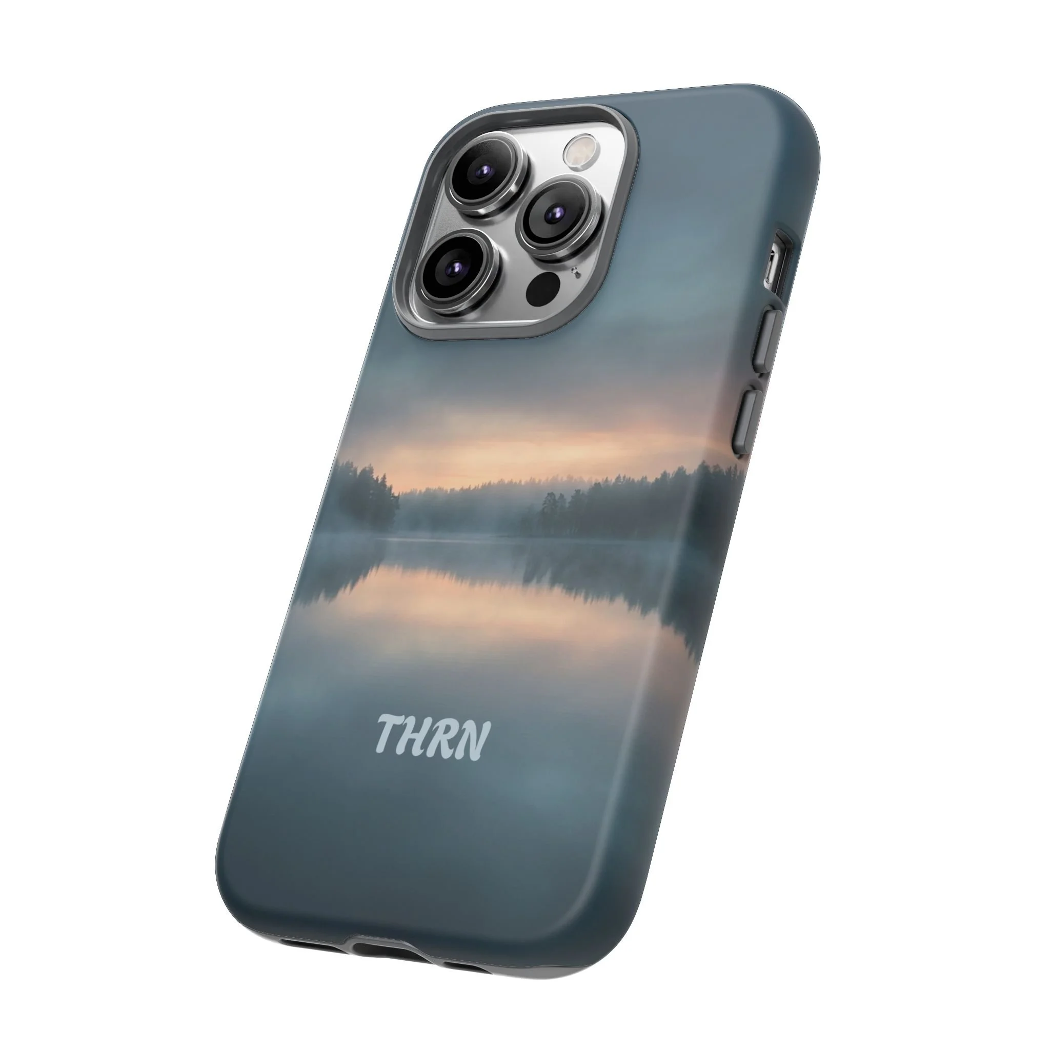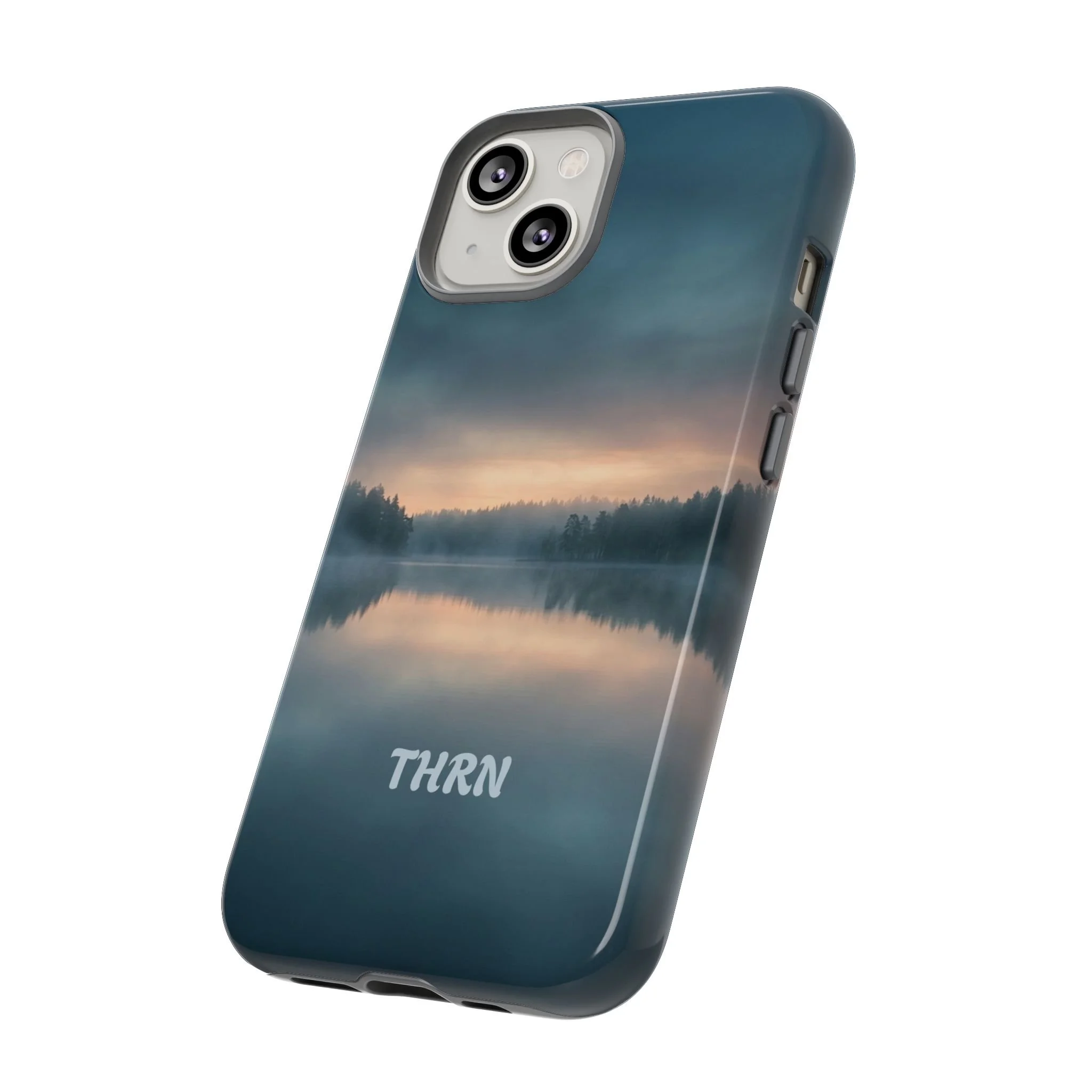 A protective phone case that pairs rugged defense with quiet, lakeside calm. The scene wraps edge-to-edge: a misty horizon and soft sunrise reflected on still water in deep blue-gray tones. Dual-layer construction (polycarbonate shell + TPU liner) cushions drops while a glossy or matte print preserves the photograph-like image. Slim enough for everyday carry, with clear port access and wireless-charging compatibility, it blends dependable protection with a meditative, outdoorsy aesthetic that slips easily into a commuter bag or the back pocket of a jacket.