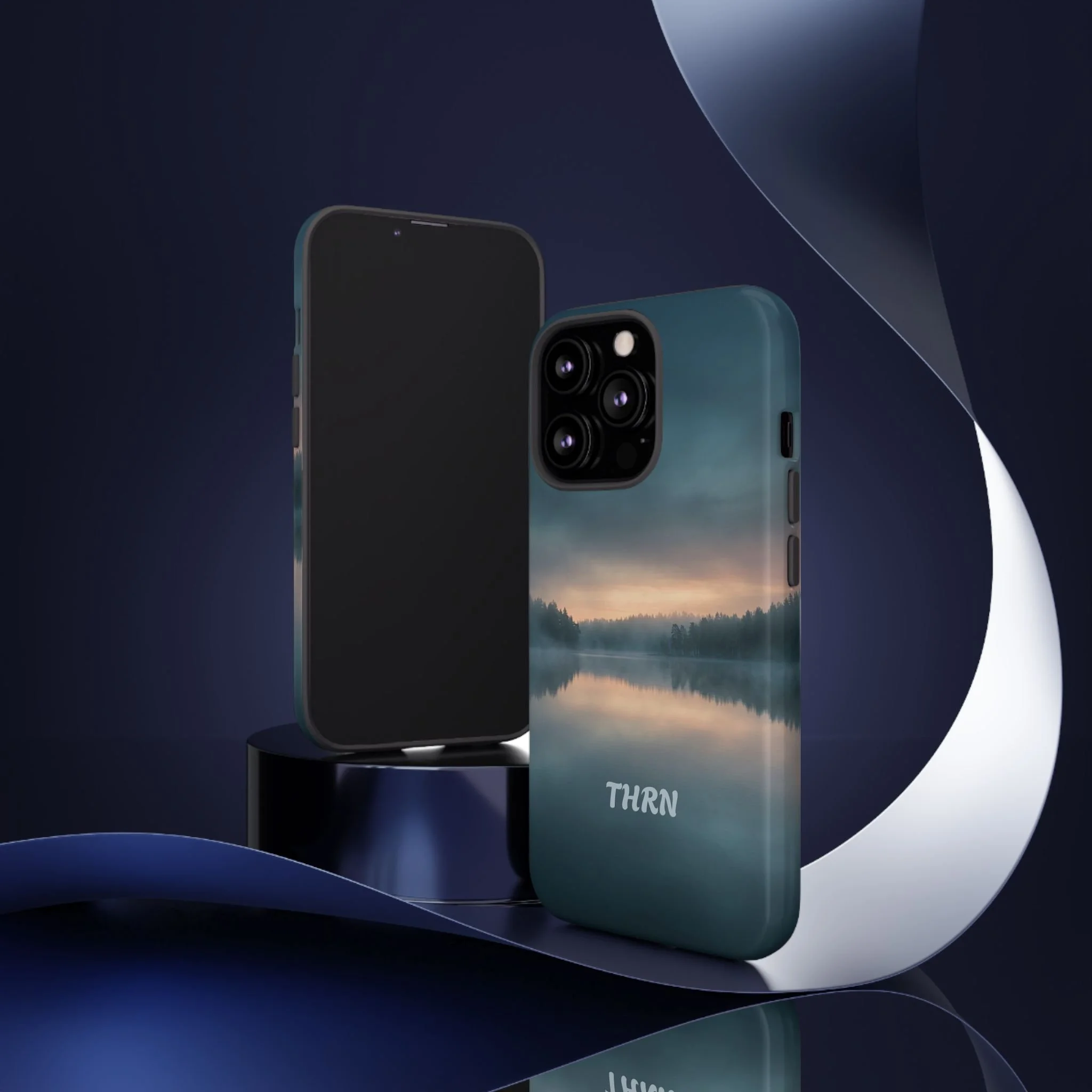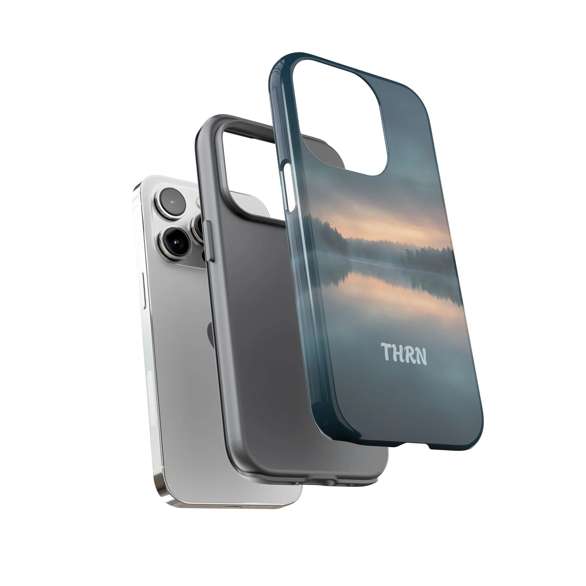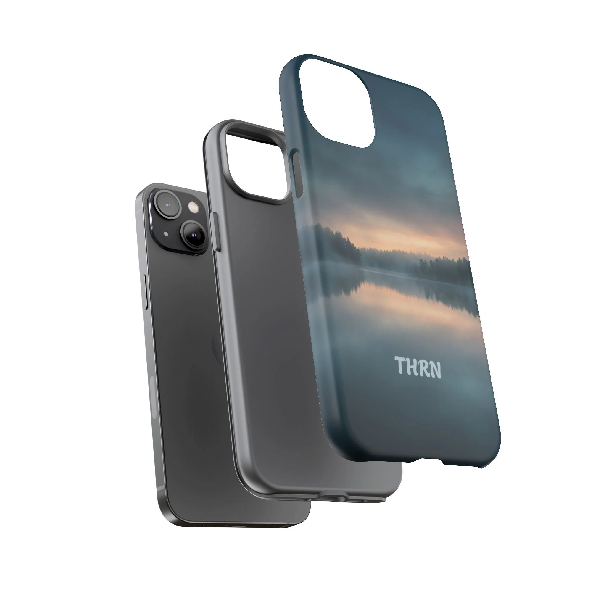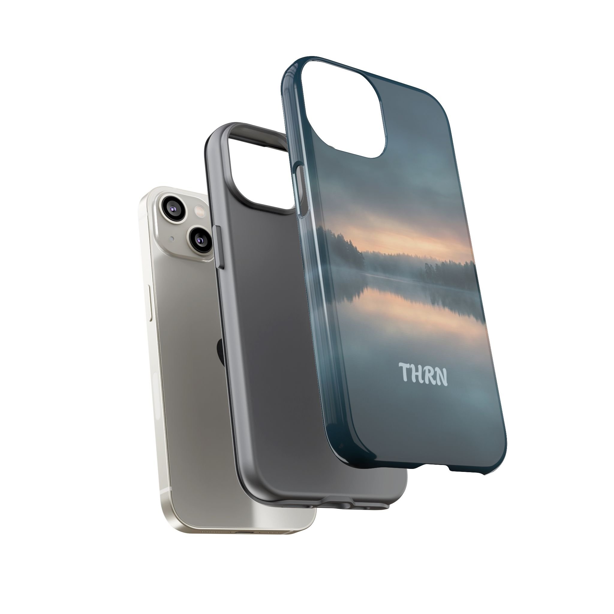 A protective phone case that pairs rugged defense with quiet, lakeside calm. The scene wraps edge-to-edge: a misty horizon and soft sunrise reflected on still water in deep blue-gray tones. Dual-layer construction (polycarbonate shell + TPU liner) cushions drops while a glossy or matte print preserves the photograph-like image. Slim enough for everyday carry, with clear port access and wireless-charging compatibility, it blends dependable protection with a meditative, outdoorsy aesthetic that slips easily into a commuter bag or the back pocket of a jacket.
