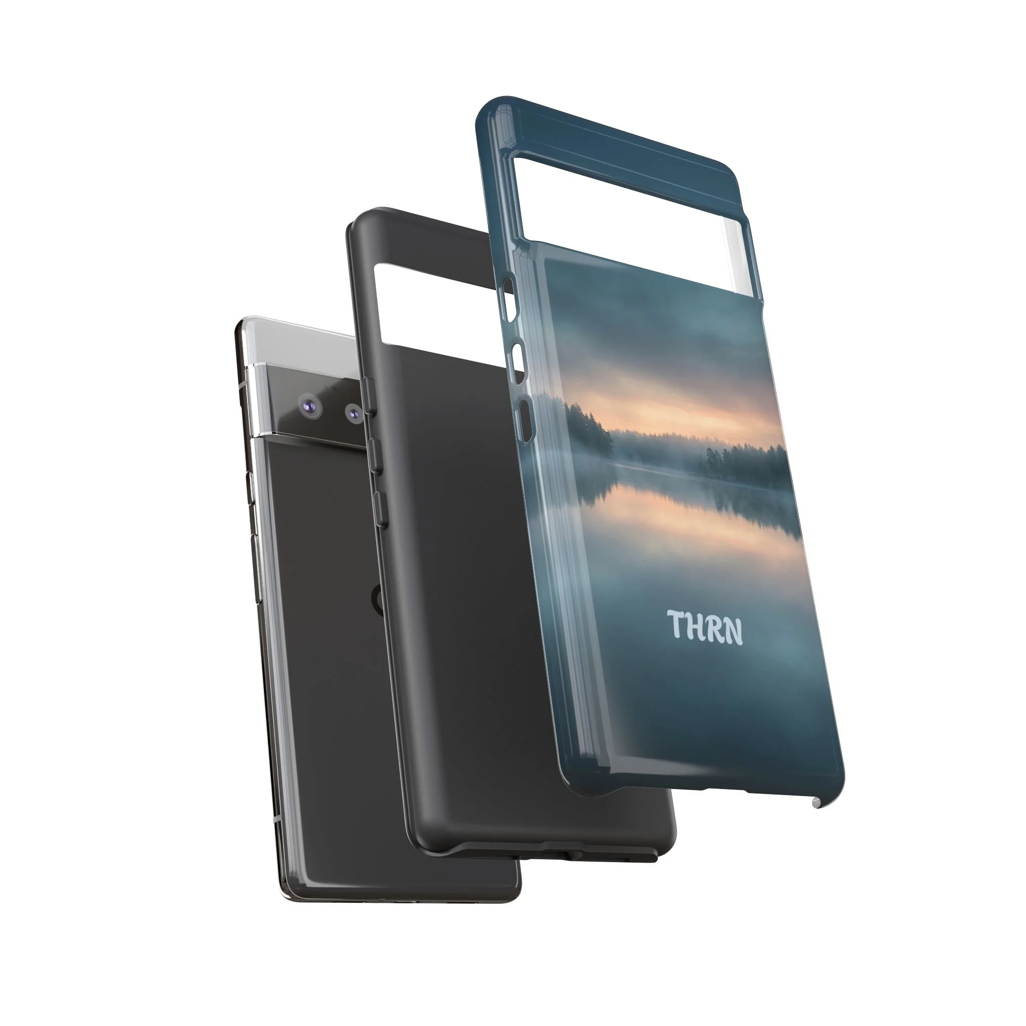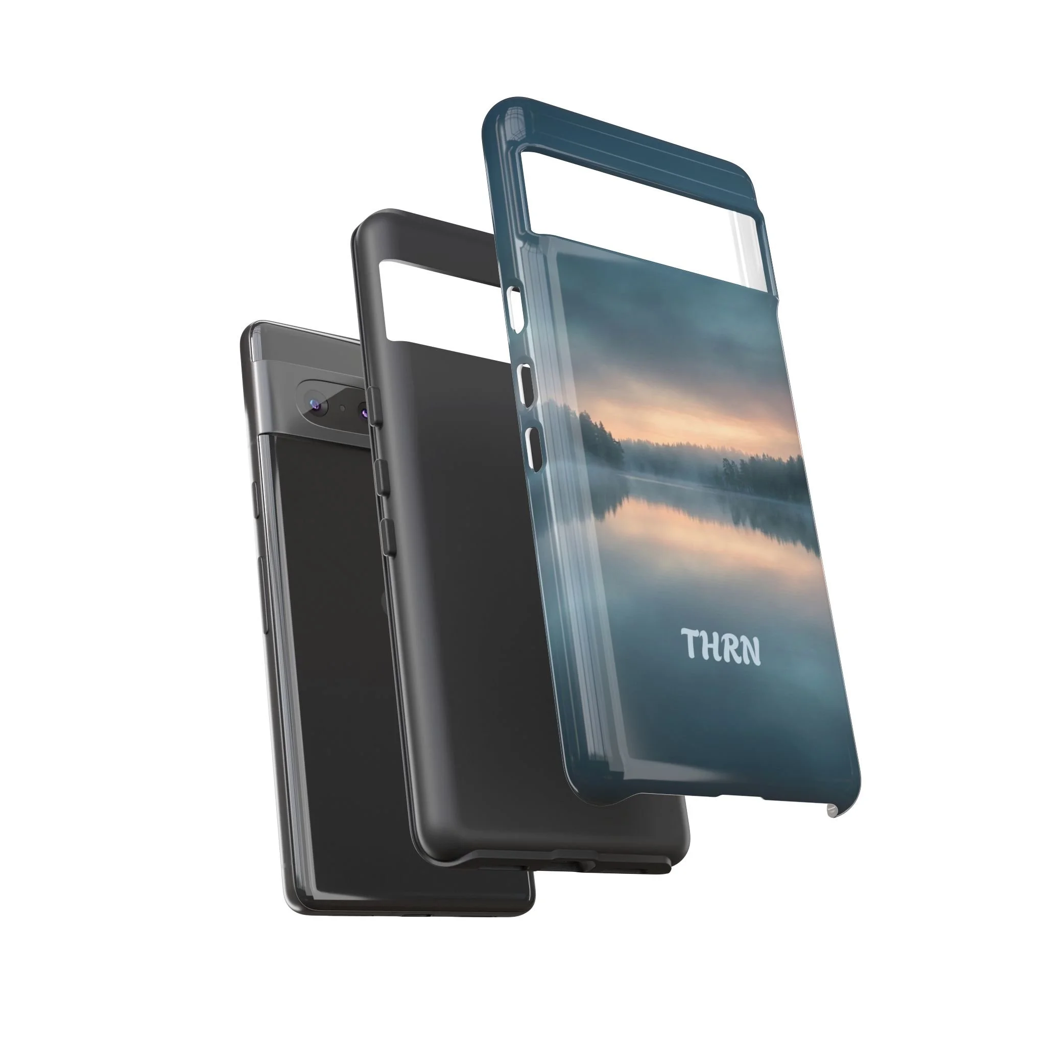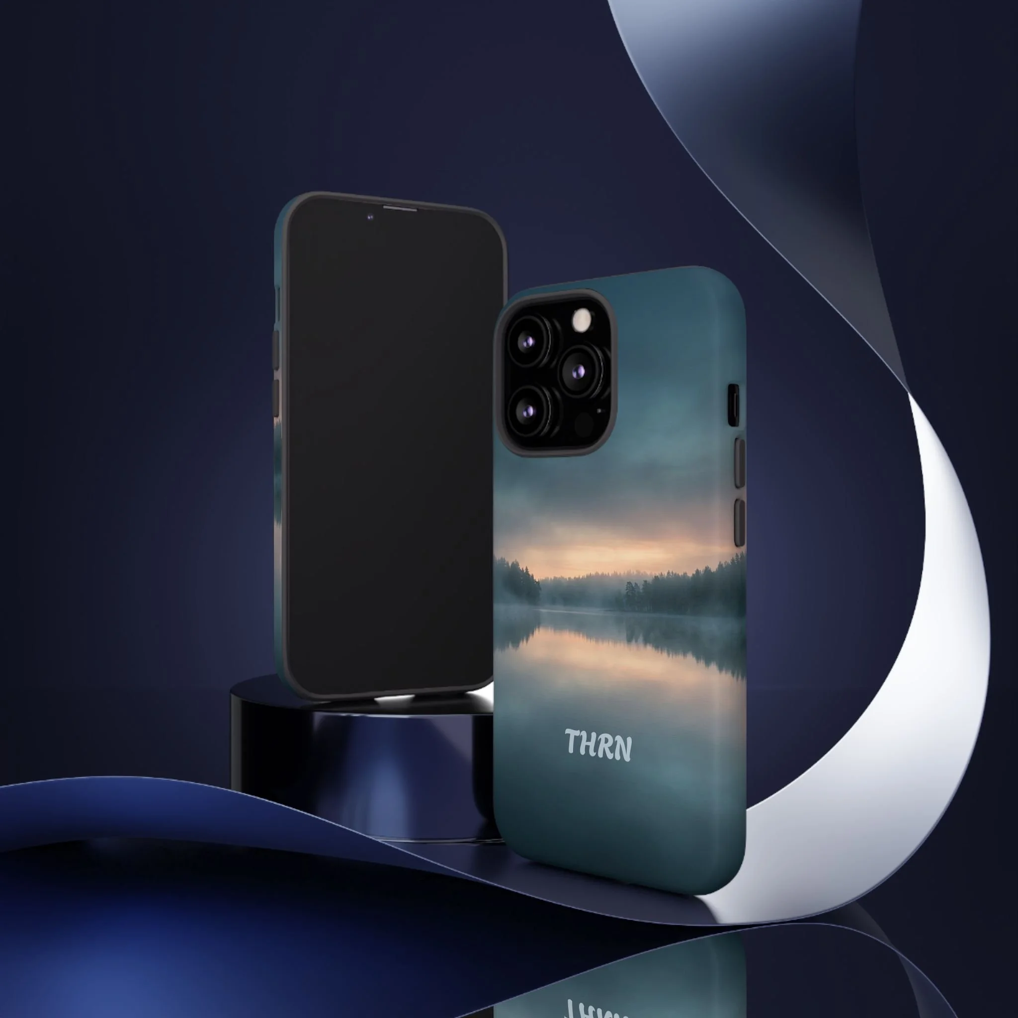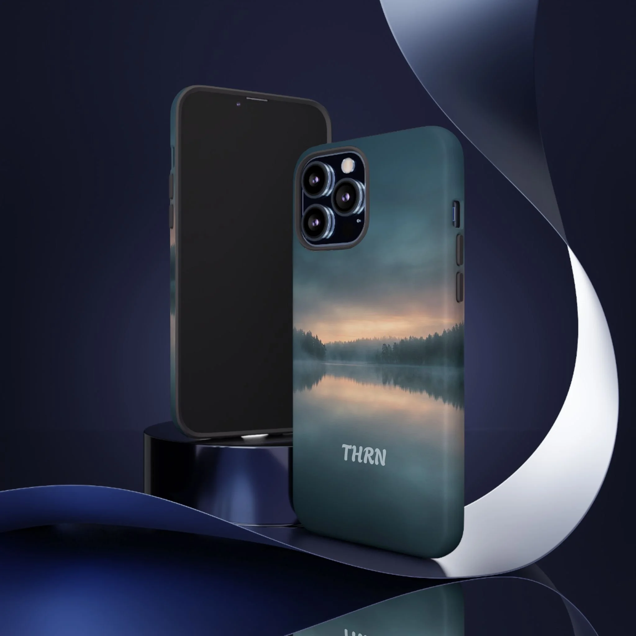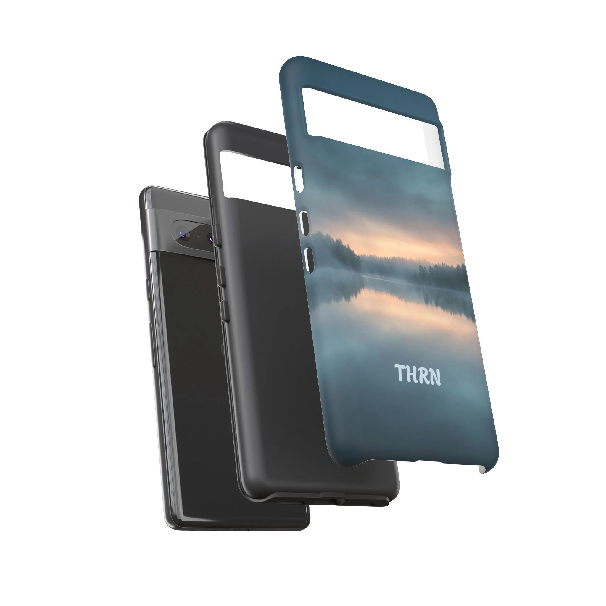A protective phone case that pairs rugged defense with quiet, lakeside calm. The scene wraps edge-to-edge: a misty horizon and soft sunrise reflected on still water in deep blue-gray tones. Dual-layer construction (polycarbonate shell + TPU liner) cushions drops while a glossy or matte print preserves the photograph-like image. Slim enough for everyday carry, with clear port access and wireless-charging compatibility, it blends dependable protection with a meditative, outdoorsy aesthetic that slips easily into a commuter bag or the back pocket of a jacket.