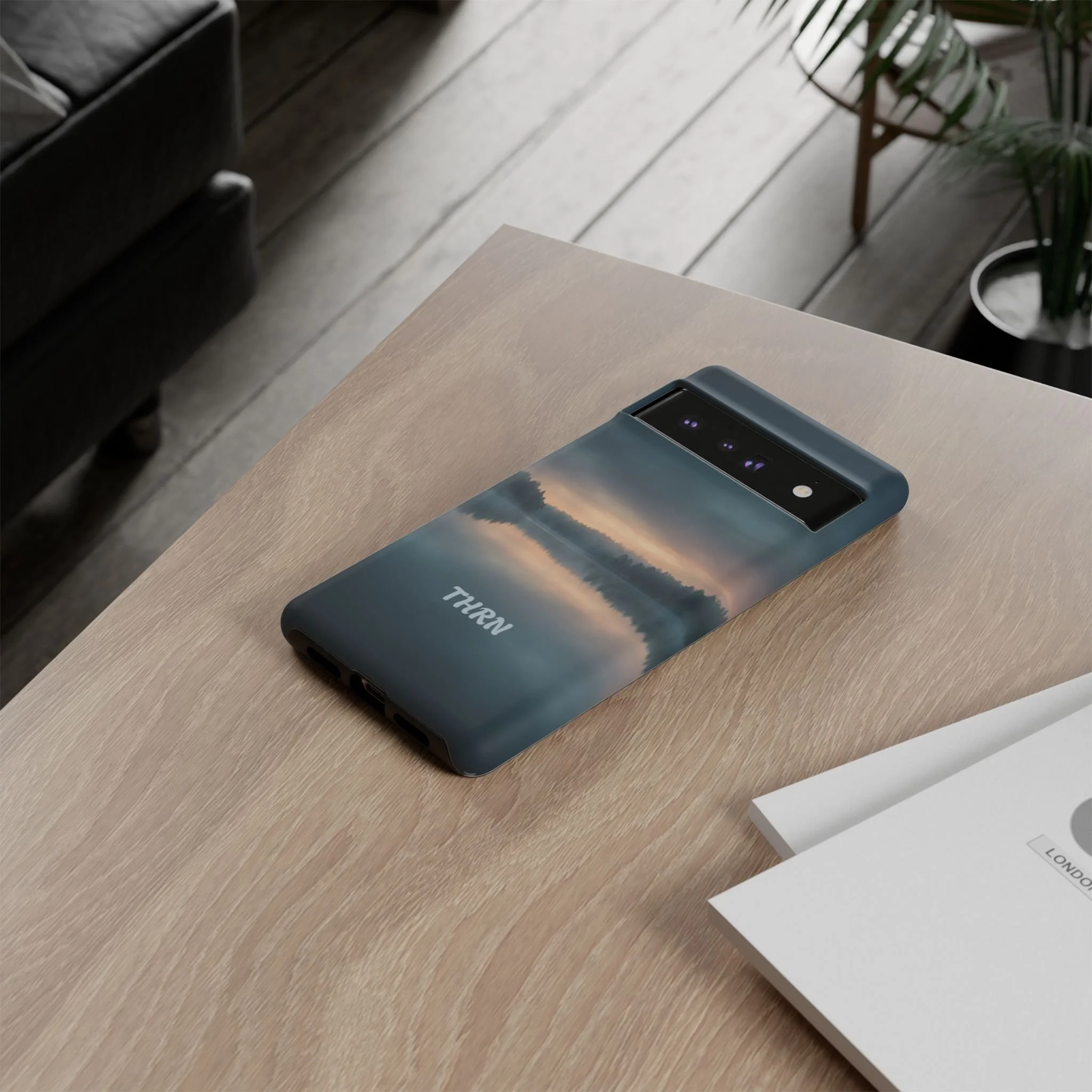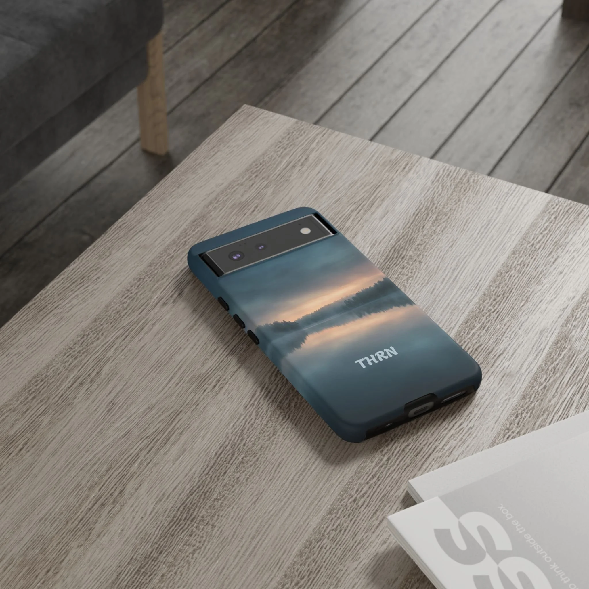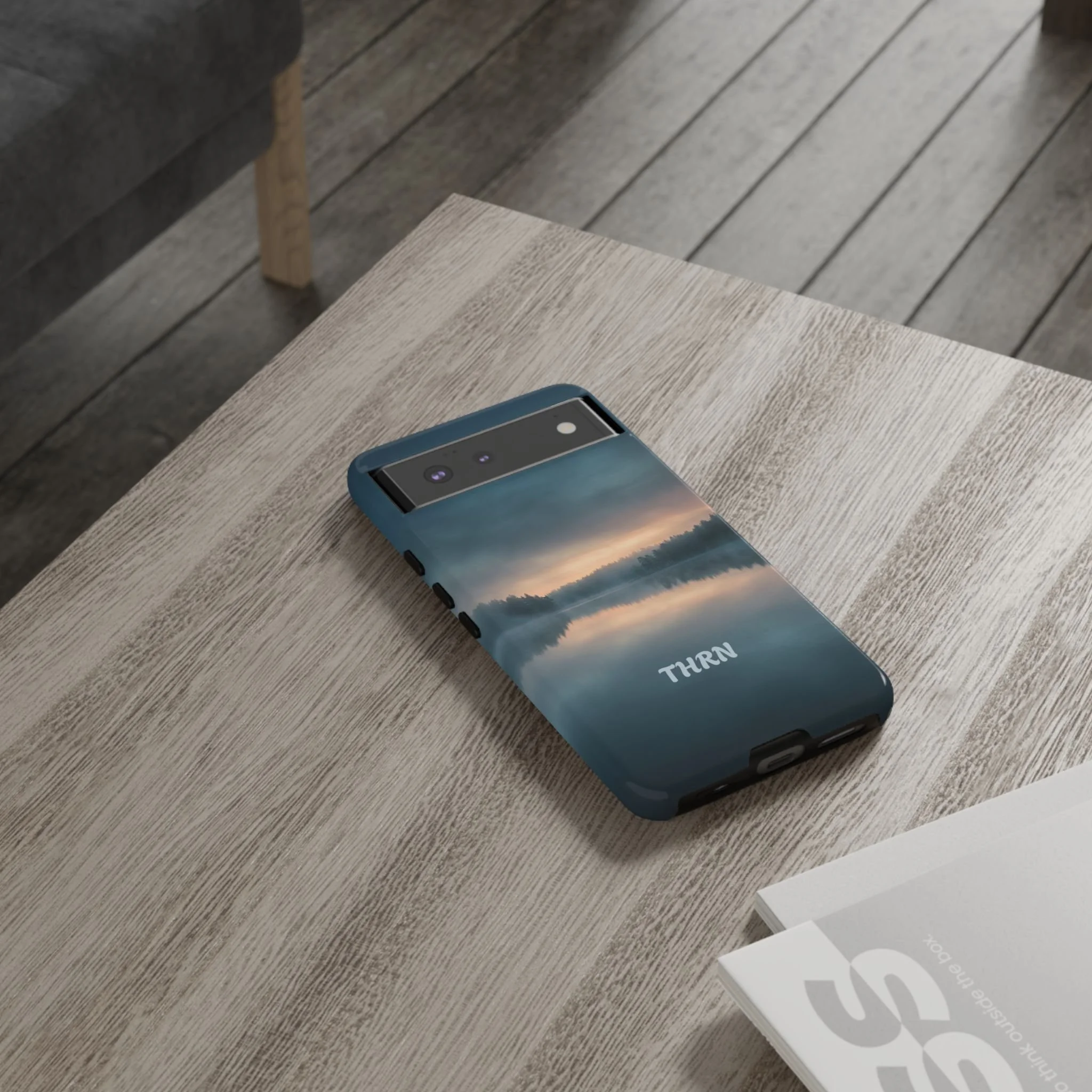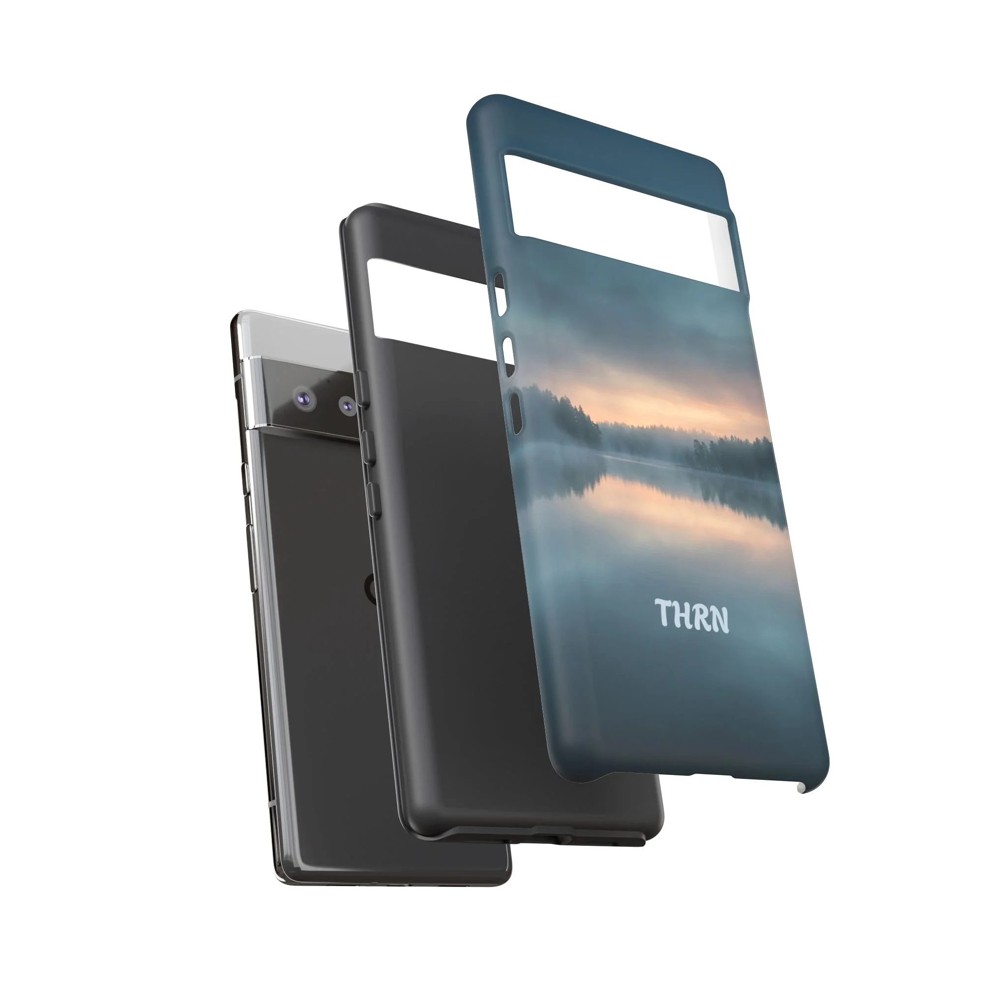 A protective phone case that pairs rugged defense with quiet, lakeside calm. The scene wraps edge-to-edge: a misty horizon and soft sunrise reflected on still water in deep blue-gray tones. Dual-layer construction (polycarbonate shell + TPU liner) cushions drops while a glossy or matte print preserves the photograph-like image. Slim enough for everyday carry, with clear port access and wireless-charging compatibility, it blends dependable protection with a meditative, outdoorsy aesthetic that slips easily into a commuter bag or the back pocket of a jacket.